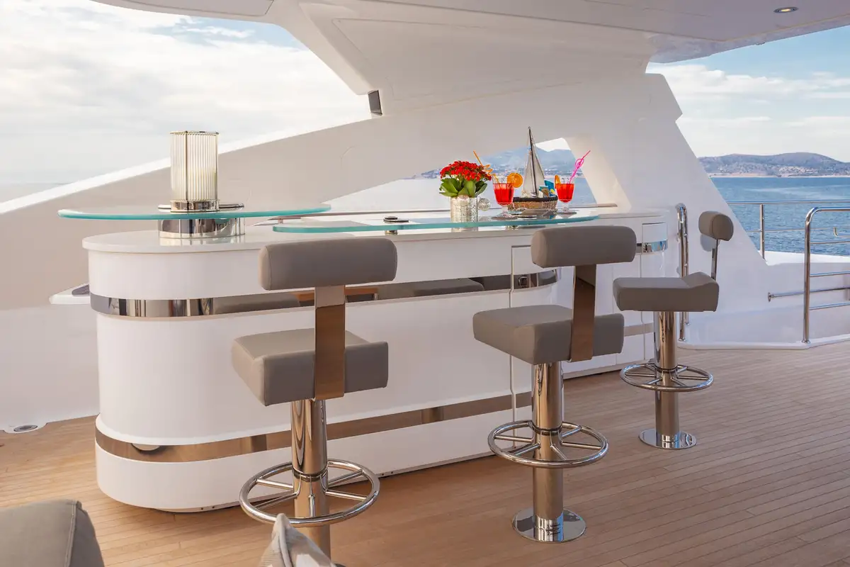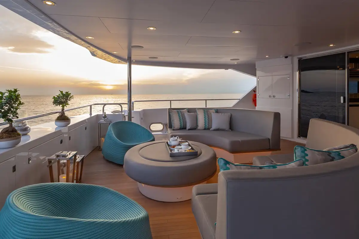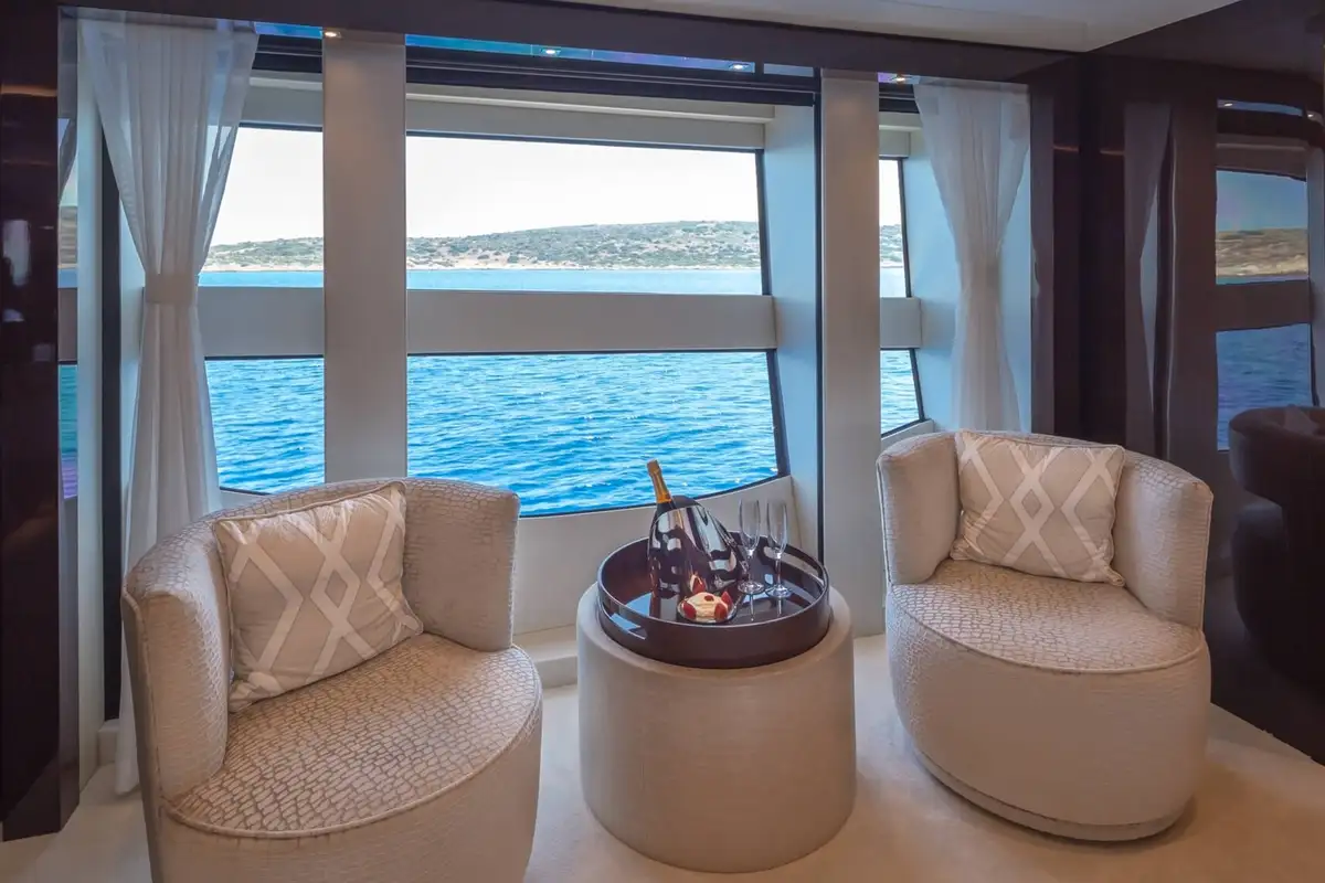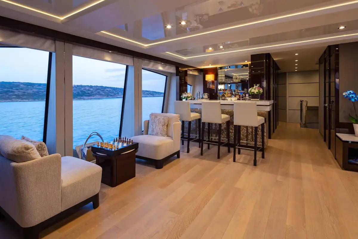 Her interior is bright and inviting, with great sea views wherever you choose to be. The elegant main deck lounge has a 10-seat table for fine dining and a large, comfortable lounge with floor-to-ceiling windows on both sides. One level up, the sky lounge is a chic and cosy living room with L-shaped sofas facing a huge TV plus a cocktail bar and a games table.