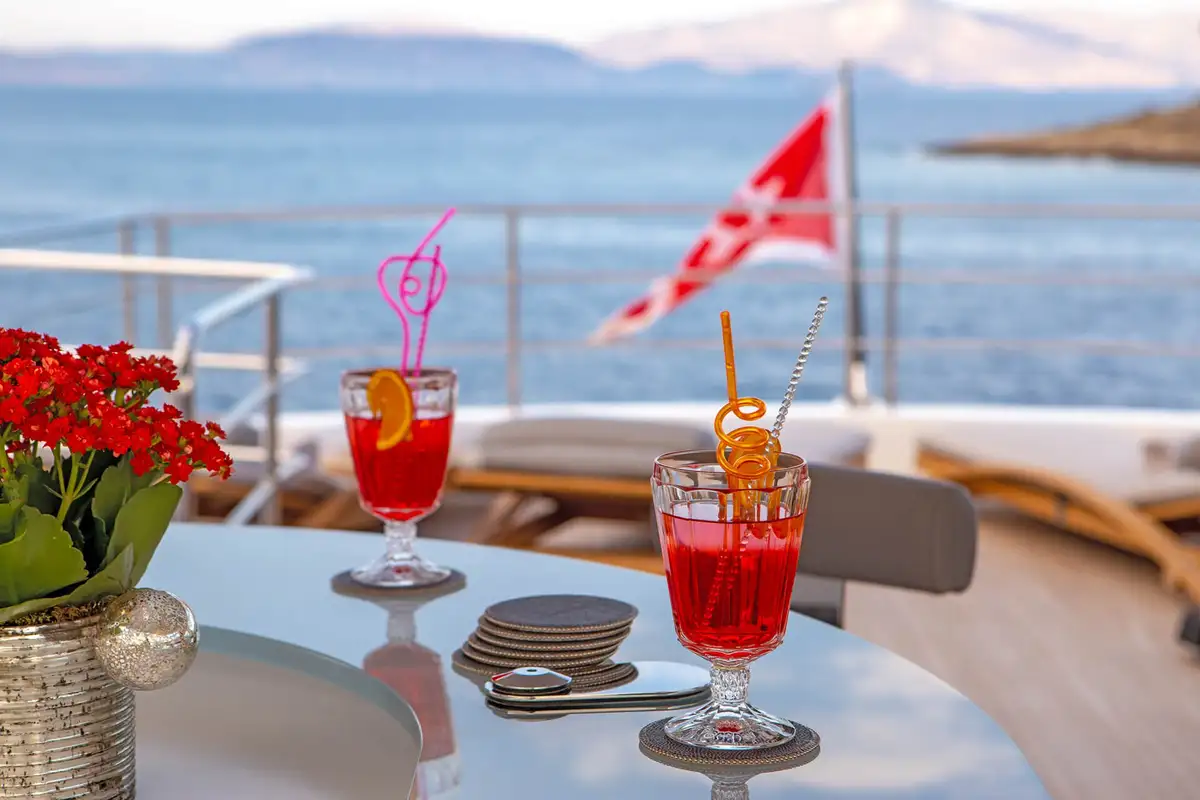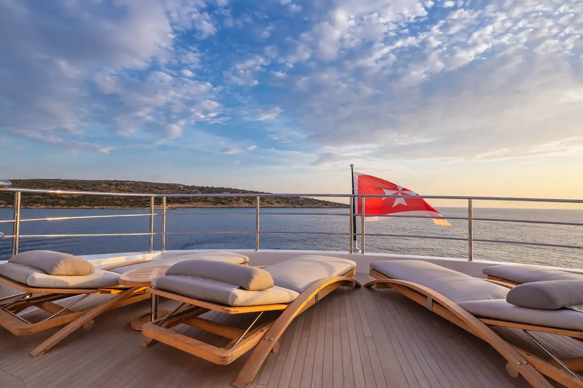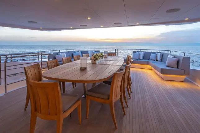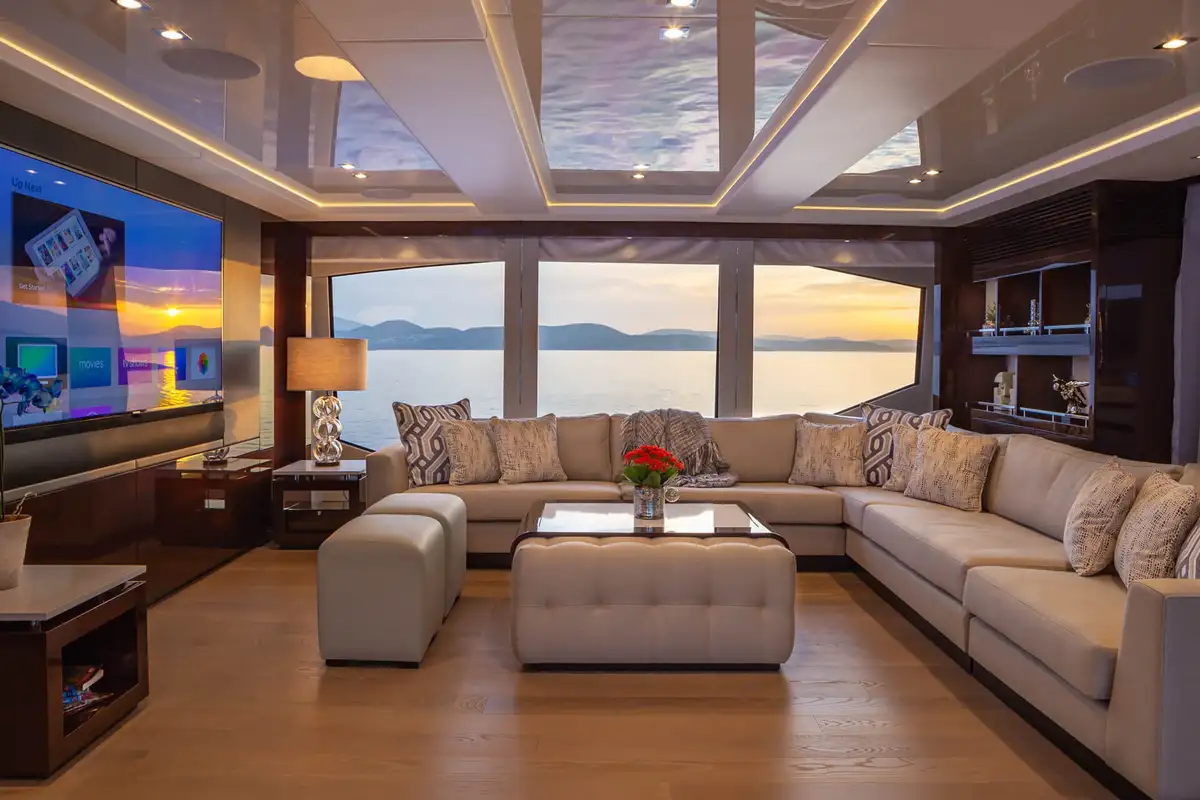 Her interior is bright and inviting, with great sea views wherever you choose to be. The elegant main deck lounge has a 10-seat table for fine dining and a large, comfortable lounge with floor-to-ceiling windows on both sides. One level up, the sky lounge is a chic and cosy living room with L-shaped sofas facing a huge TV plus a cocktail bar and a games table.
