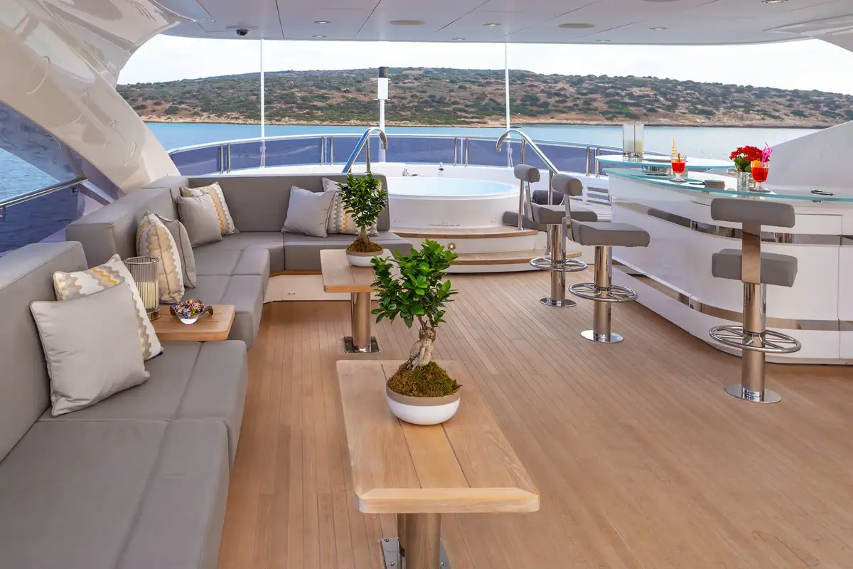 Her sundeck is a fabulous place to spend the day at anchor or at sea with a big jacuzzi pool up front, sun loungers astern and a large, sociable cocktail lounge amidships, facing a sit-up bar. The hardtop above with its extendable awnings provides plenty of shade when required. It’s perfect for a party and equally ideal for quiet, relaxing family time.