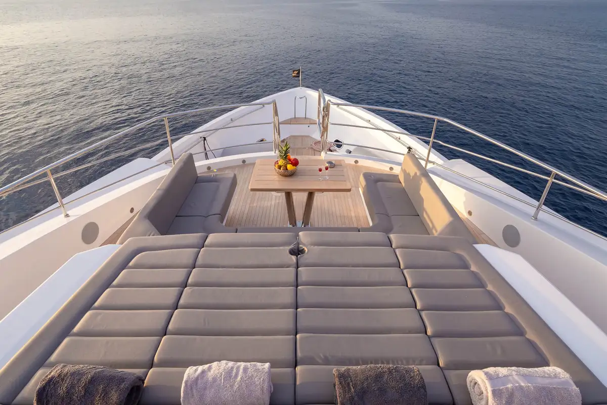 The foredeck lounge is another large open-air space with a commanding view of the seascape from the forward-facing sofa and triple sunbed. When she’s powering through the waves at full tilt, these are the best seats on board.