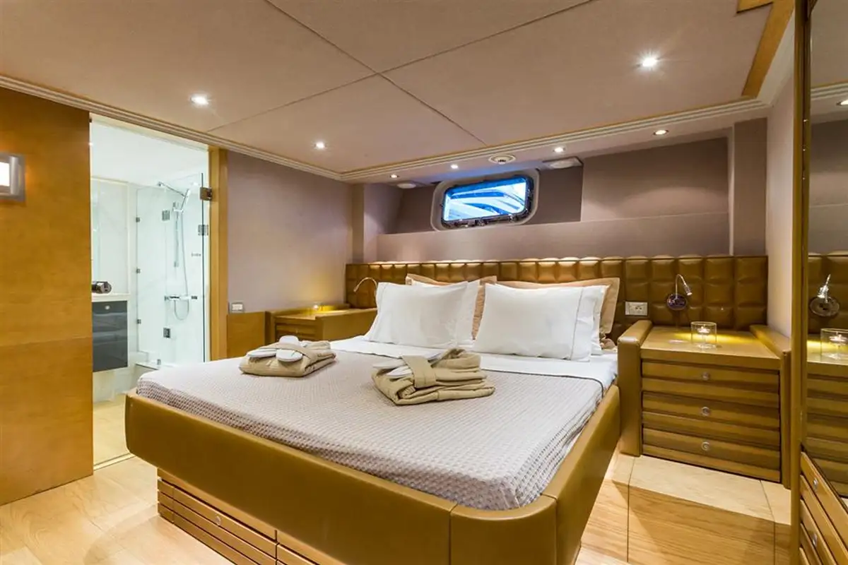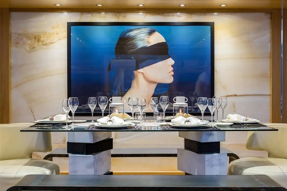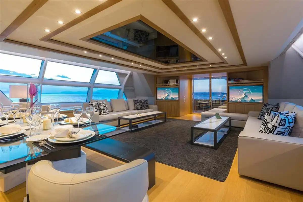 After her refit in 2019, she boasts new interiors by Ioanna Marinopoulos. Her bright design incorporates rich woods, with monochrome furnishings and white marble.