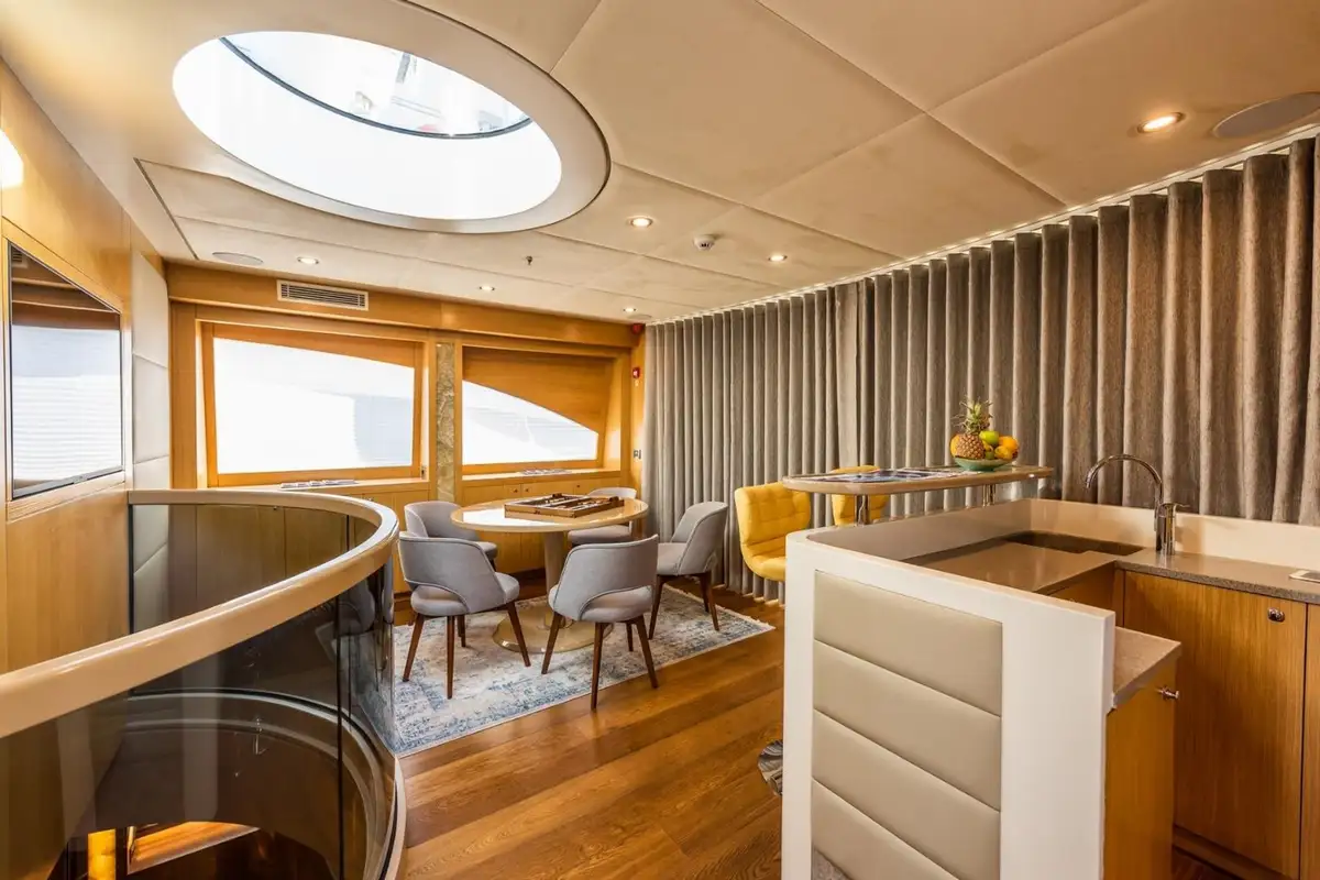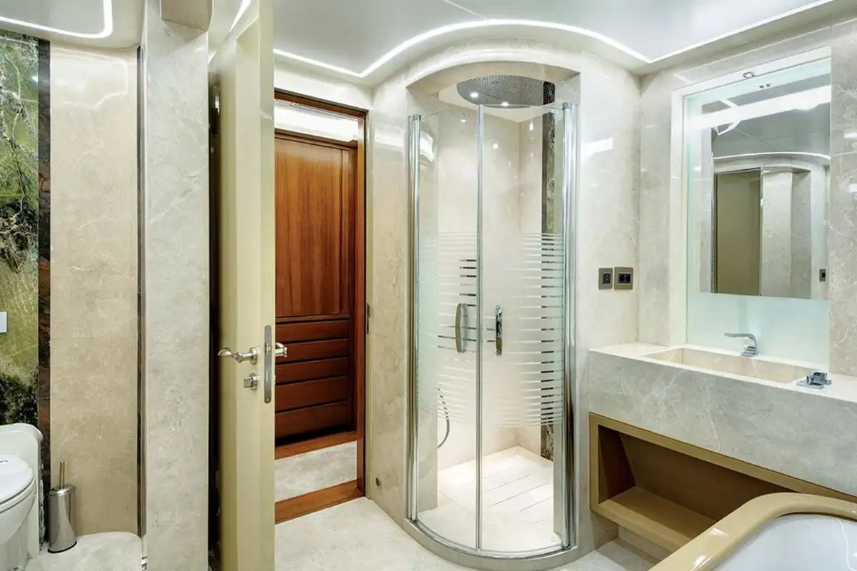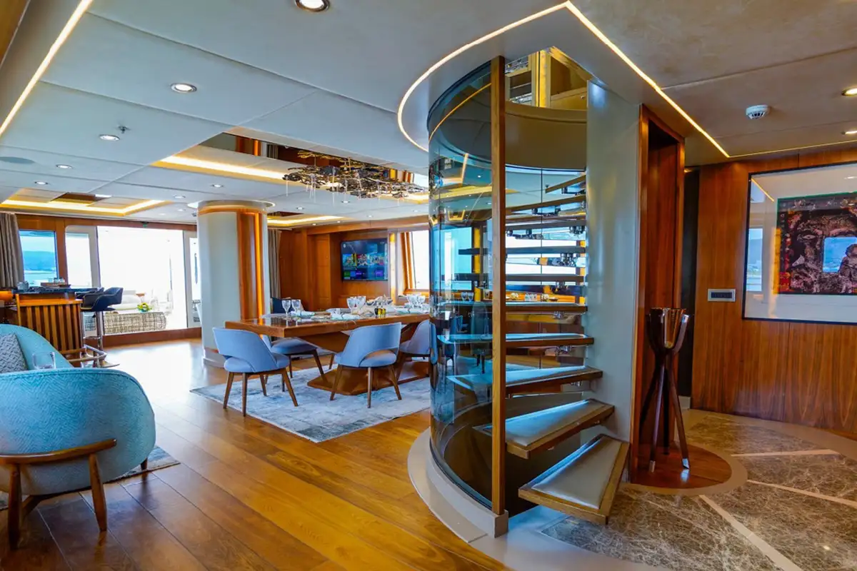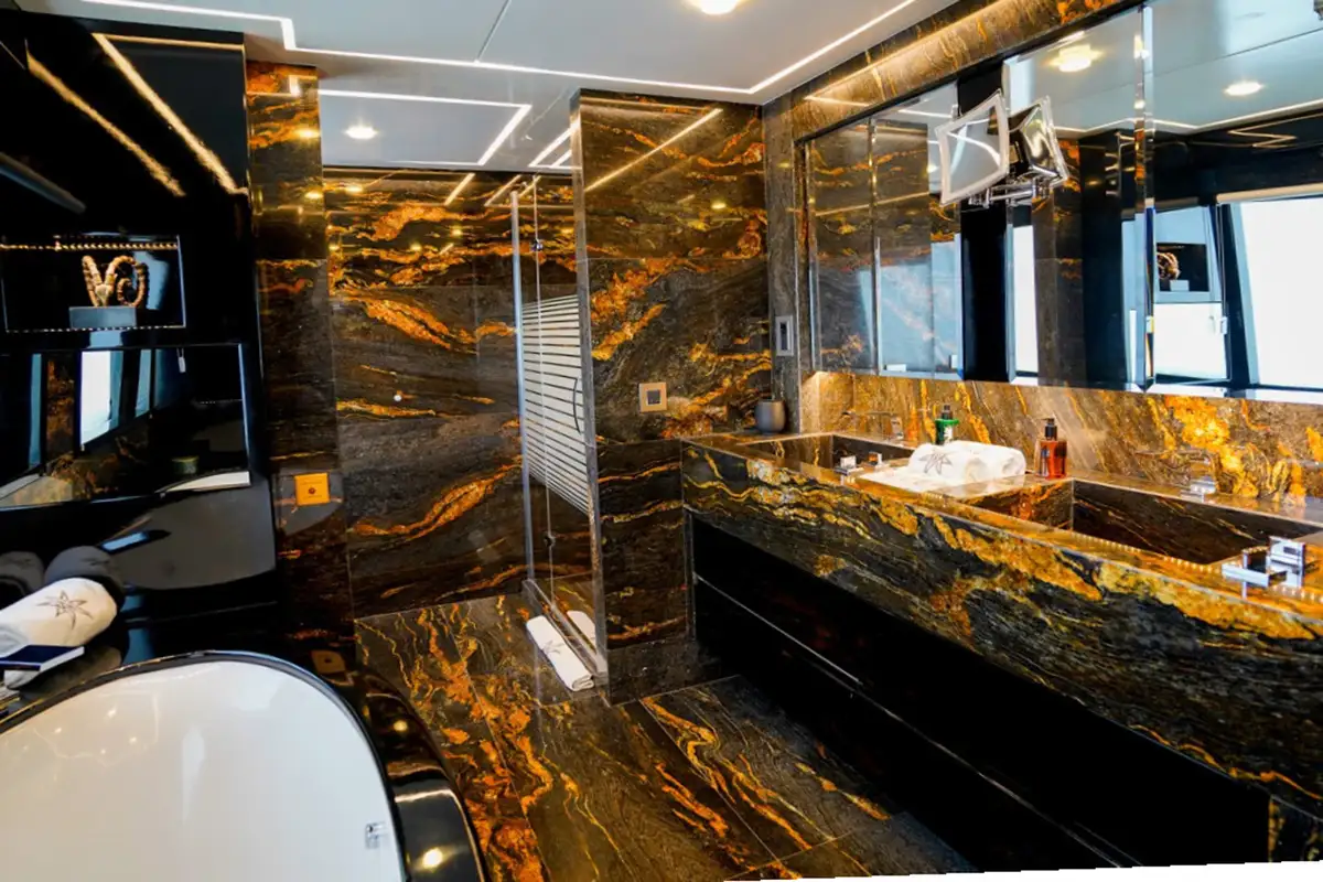 By day, soak up the Mediterranean sunshine from the expansive deck spaces, unwind in the glass-bottomed jacuzzi, or sip cocktails at the sun deck bar. For the thrill-seekers on board, an array of water toys await you. These include jetskis, SeaBobs, wakeboards and paddleboards, promising endless days of fun on the water. As the sun sets, retreat indoors to a sophisticated sanctuary designed by Aldo Viano, where natural materials – think fine leathers, rich woods, and marble – blend seamlessly with contemporary furnishings.
