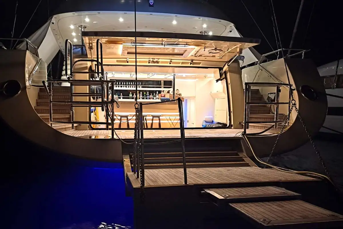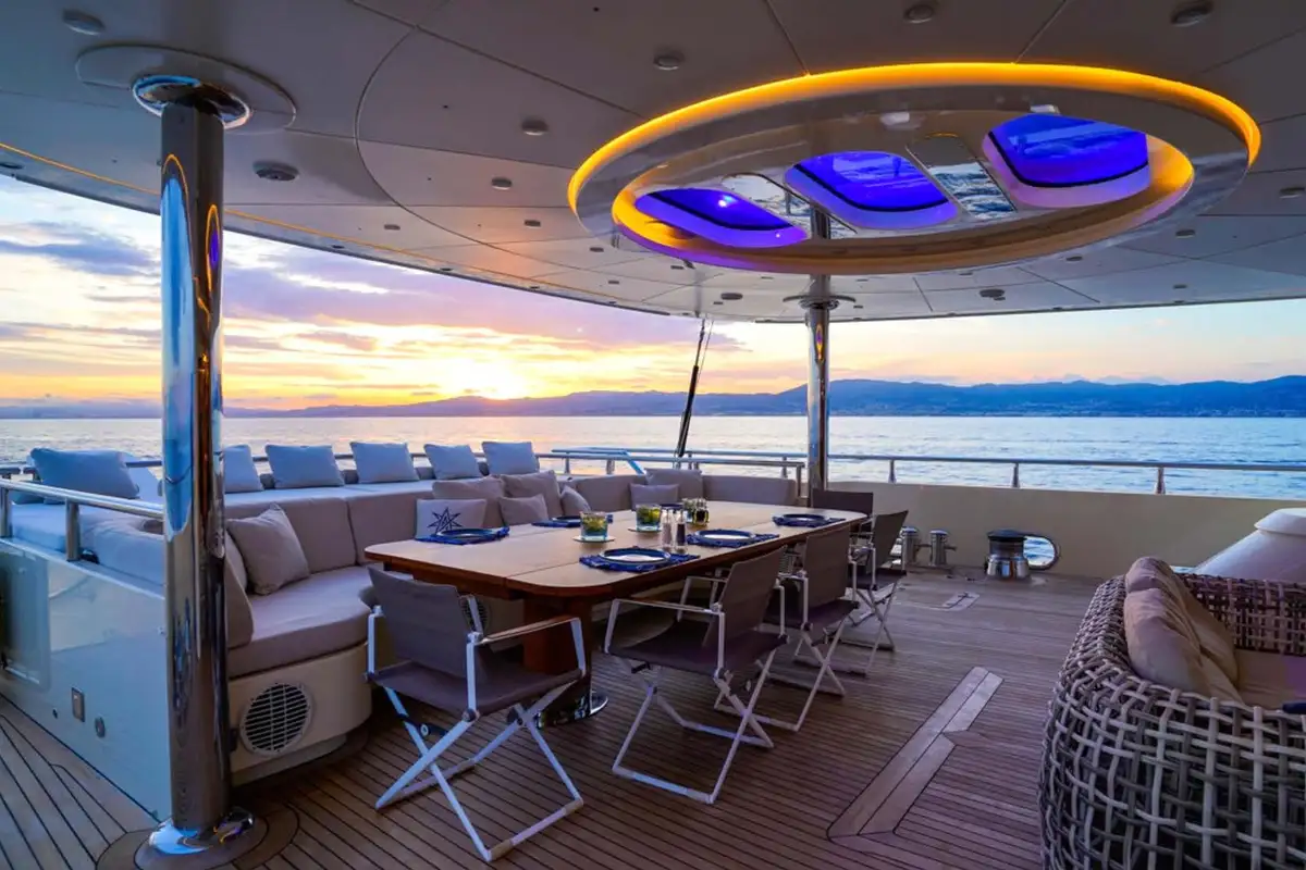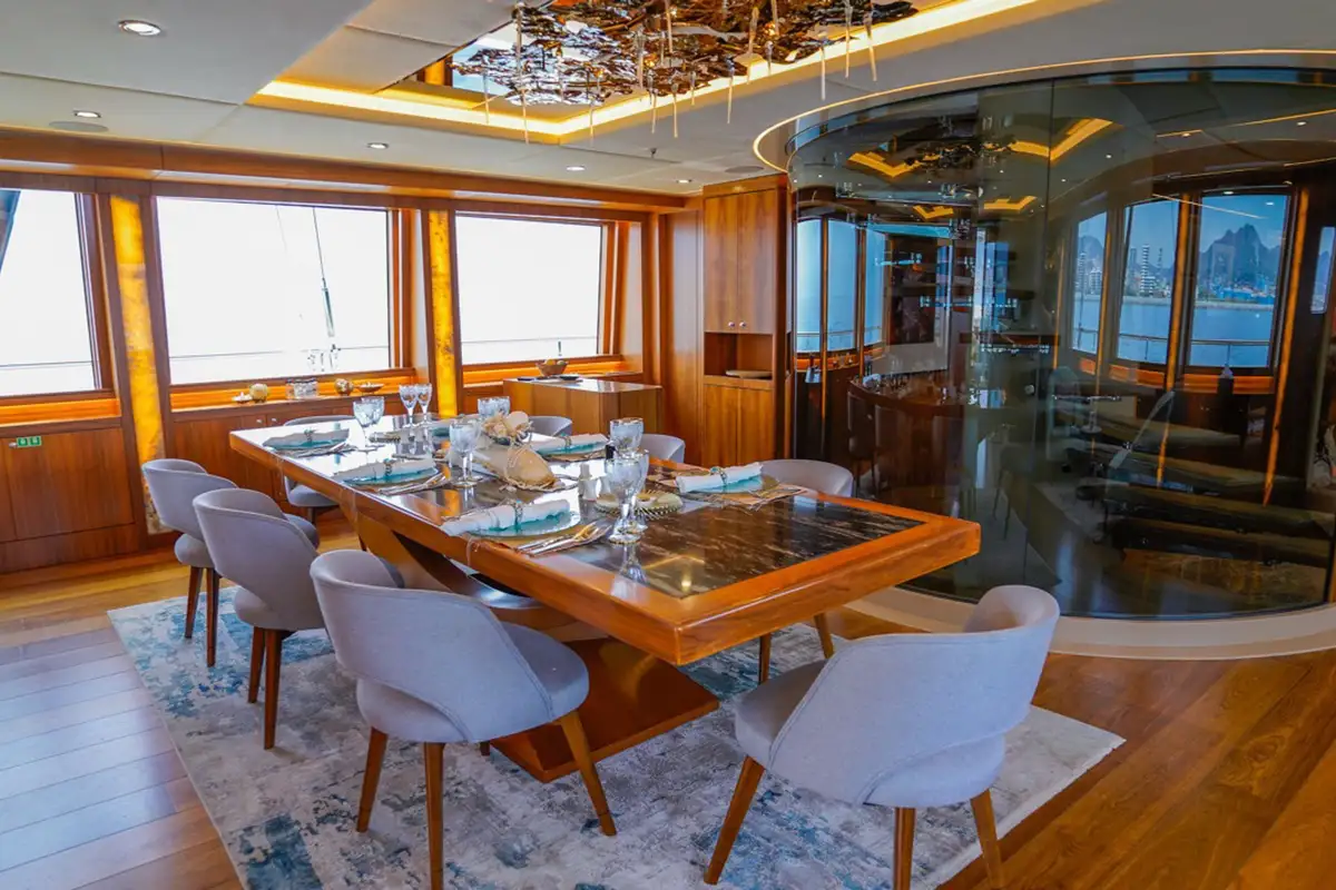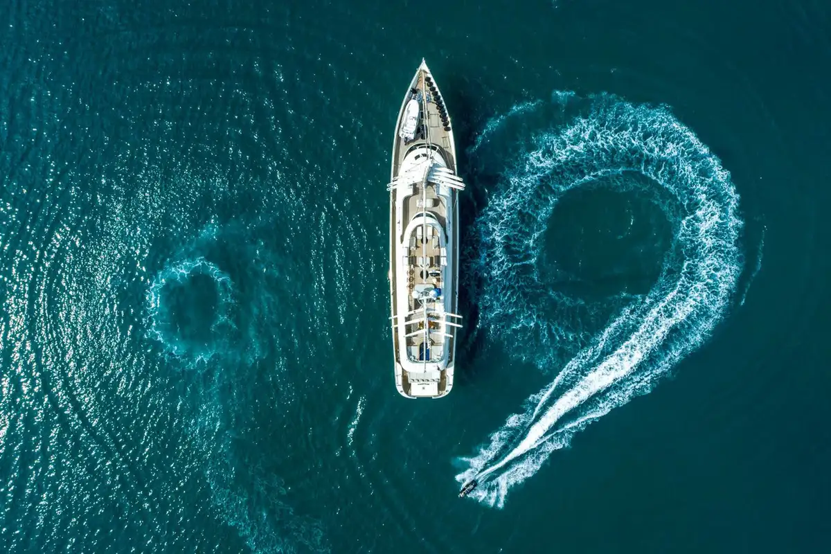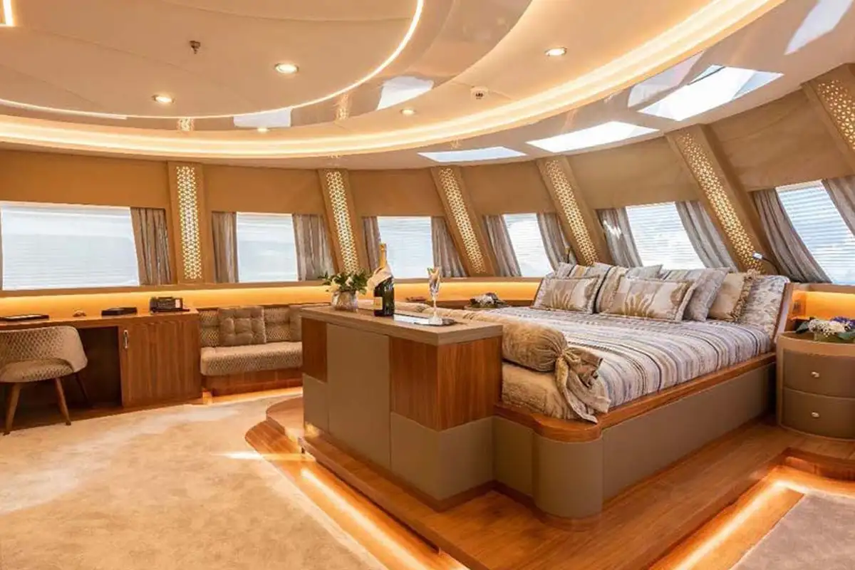 By day, soak up the Mediterranean sunshine from the expansive deck spaces, unwind in the glass-bottomed jacuzzi, or sip cocktails at the sun deck bar. For the thrill-seekers on board, an array of water toys await you. These include jetskis, SeaBobs, wakeboards and paddleboards, promising endless days of fun on the water. As the sun sets, retreat indoors to a sophisticated sanctuary designed by Aldo Viano, where natural materials – think fine leathers, rich woods, and marble – blend seamlessly with contemporary furnishings.