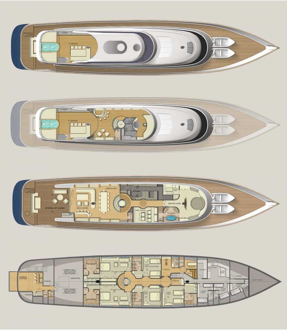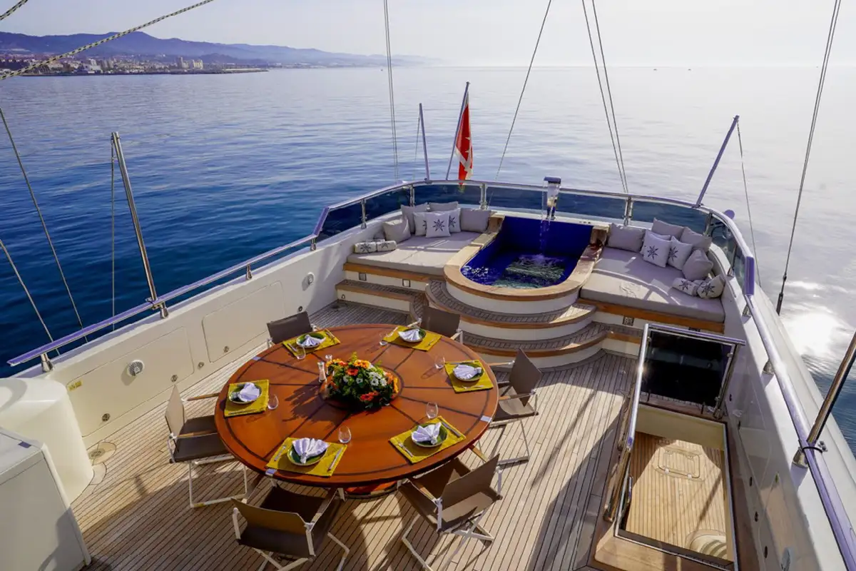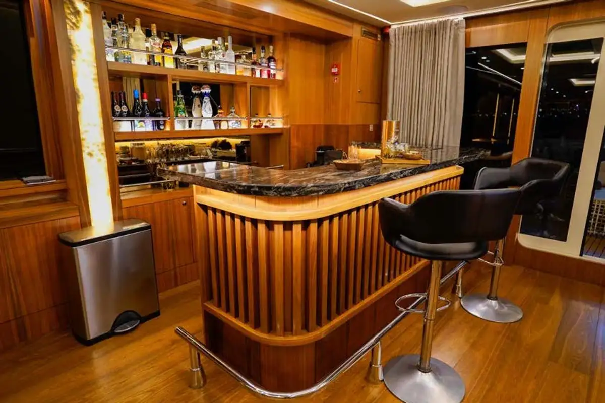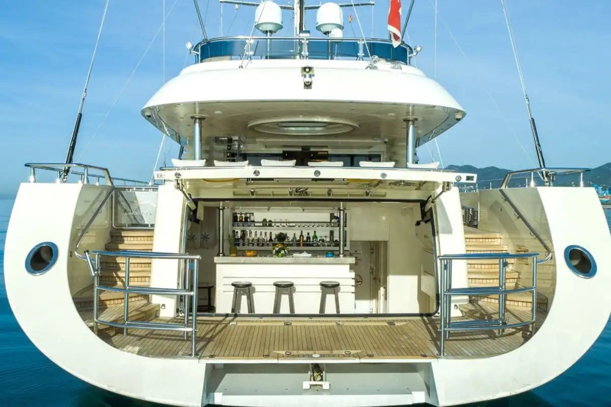 By day, soak up the Mediterranean sunshine from the expansive deck spaces, unwind in the glass-bottomed jacuzzi, or sip cocktails at the sun deck bar. For the thrill-seekers on board, an array of water toys await you. These include jetskis, SeaBobs, wakeboards and paddleboards, promising endless days of fun on the water. As the sun sets, retreat indoors to a sophisticated sanctuary designed by Aldo Viano, where natural materials – think fine leathers, rich woods, and marble – blend seamlessly with contemporary furnishings.