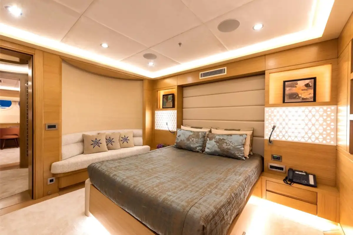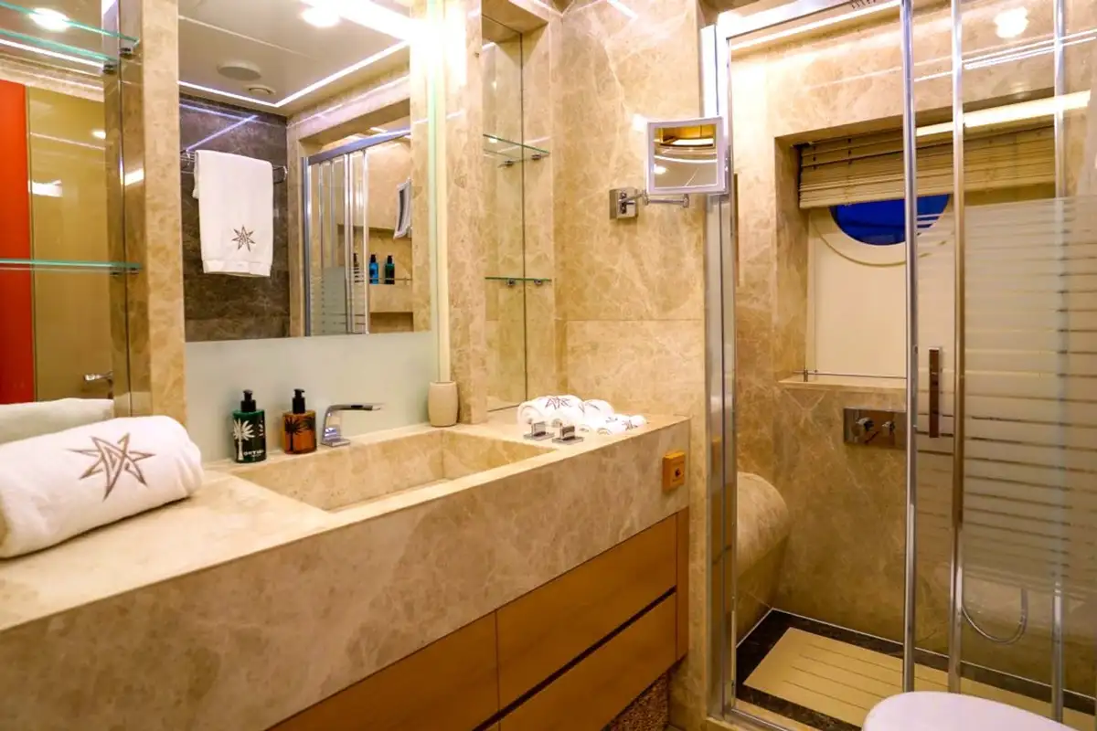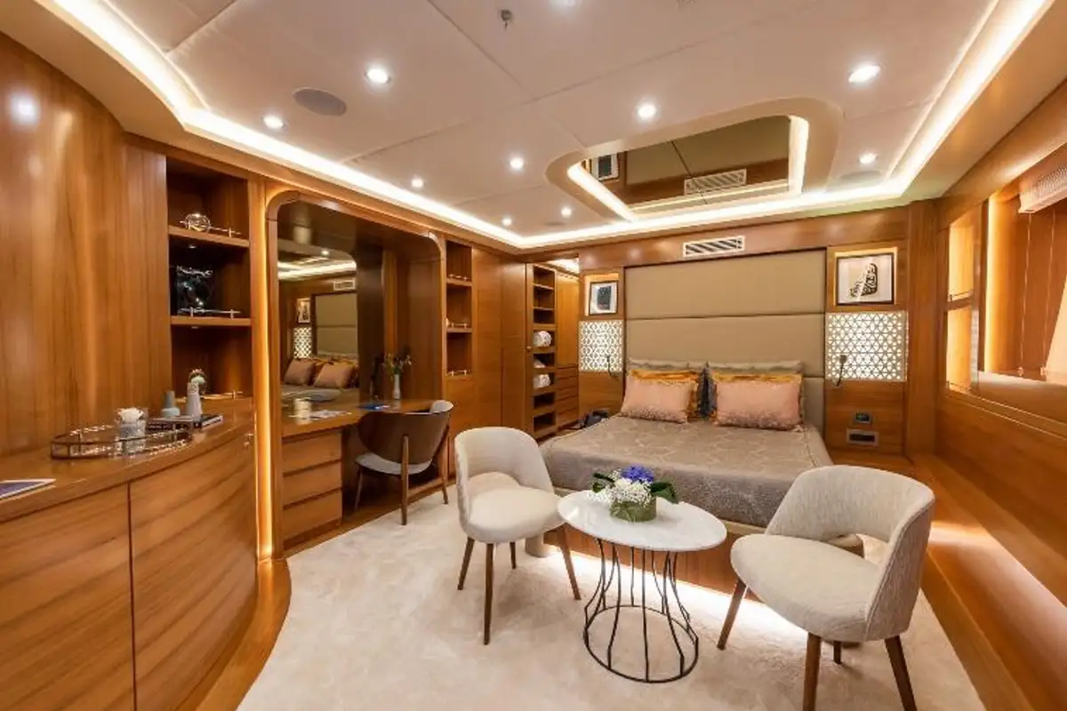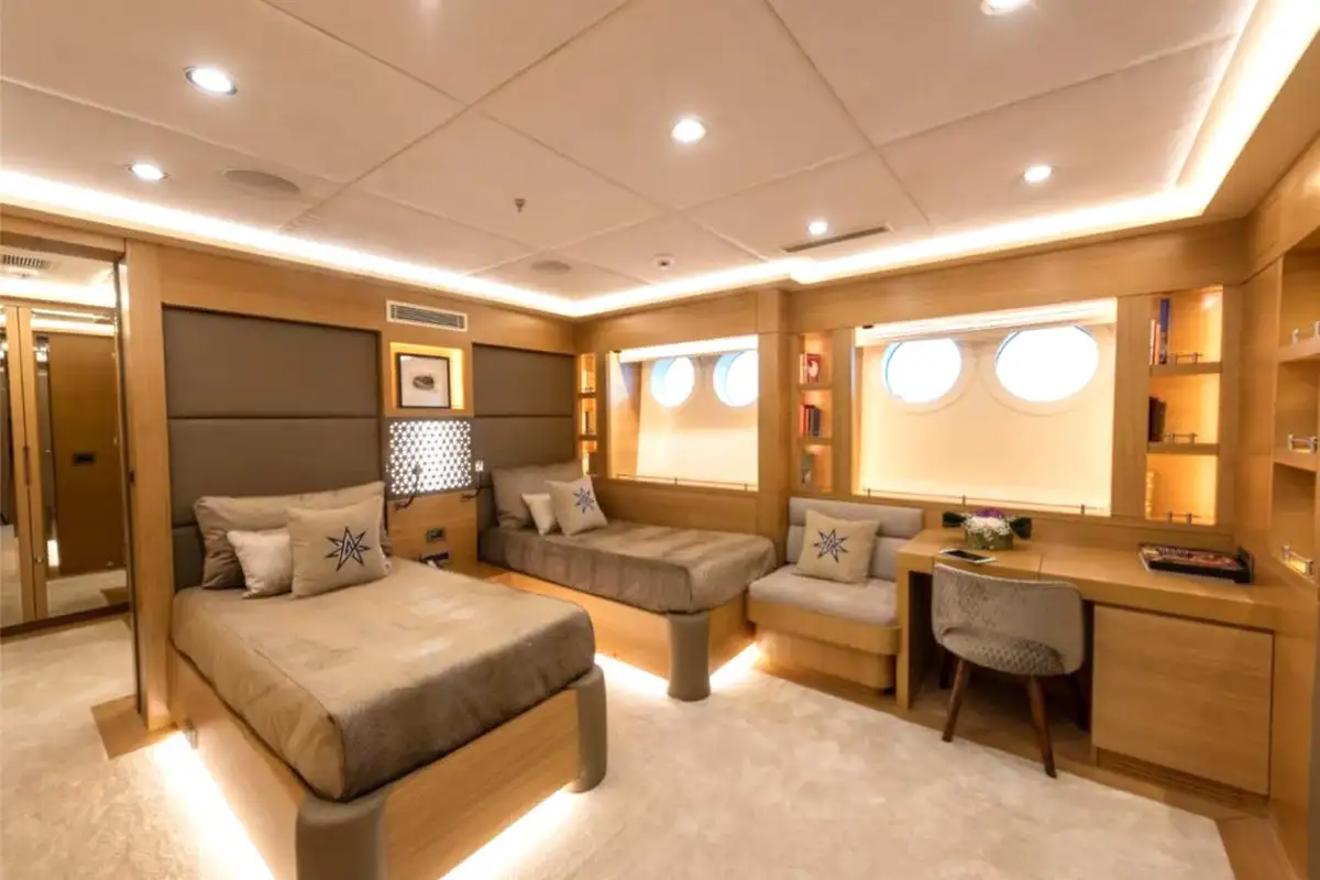 With six beautifully appointed cabins accommodating up to 12 guests, ARESTEAS is a haven of relaxation. The full-beam owner’s suite, positioned on the main deck, commands breathtaking forward-facing views through an arc of windows. Additionally, you will find two VIP suites – each with a private lounge – along with a guest double and two twin cabins, offering unbeatable comfort for all on board.