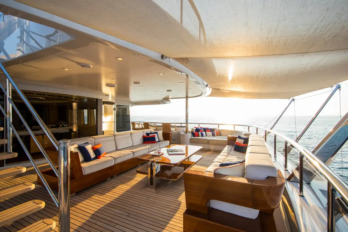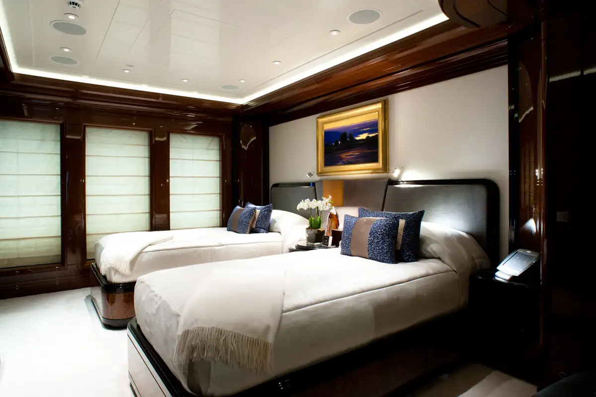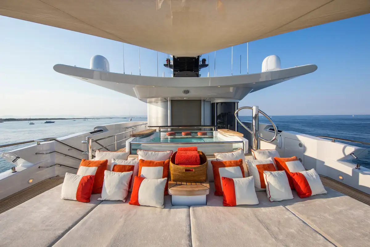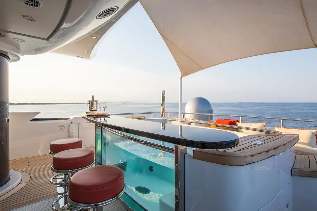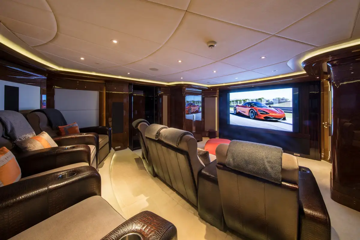 Accommodating guests in 7 cabins - 3 double and 2 twin cabins on the main deck, with the Master Suite and the 7th cabin on the owner's deck above, she is able to carry 12 guests and 2 staff. On the lower deck, there is a full cinema with reclining chairs, an open waterside gym and separate bar / spa lounging. On the main deck, in addition to the guests cabins, there is a welcoming bar and lounge area, interior dining room and welcoming half-moon exterior seating. On the Owner's deck, travelling forward through the private office with the 7th cabin to the port side is the Master suite with a 180-degree view and large private deck with seating and jacuzzi, his and her bathrooms (with bath and shower). To the aft of the Owner's deck, is a large and welcoming lounge with card table and opens onto the exterior deck where there is a bar and sofas. The bridge deck is all about the exterior with a large buffet for serving, dining table for 12 with wrap-around windbreaks to protect from the elements and cosy seating. On the sundeck is the spa pool with waterfall and forward seating area. All decks are connected by the central circular lift.