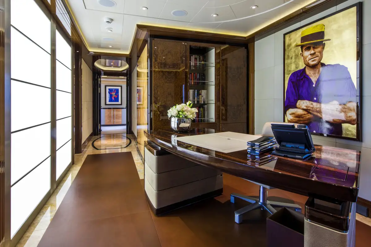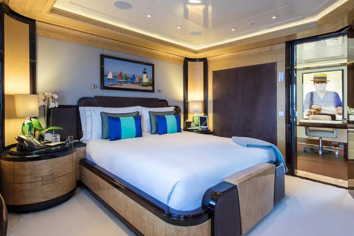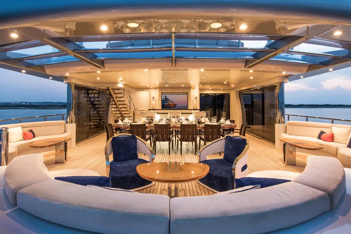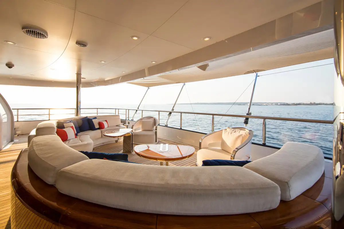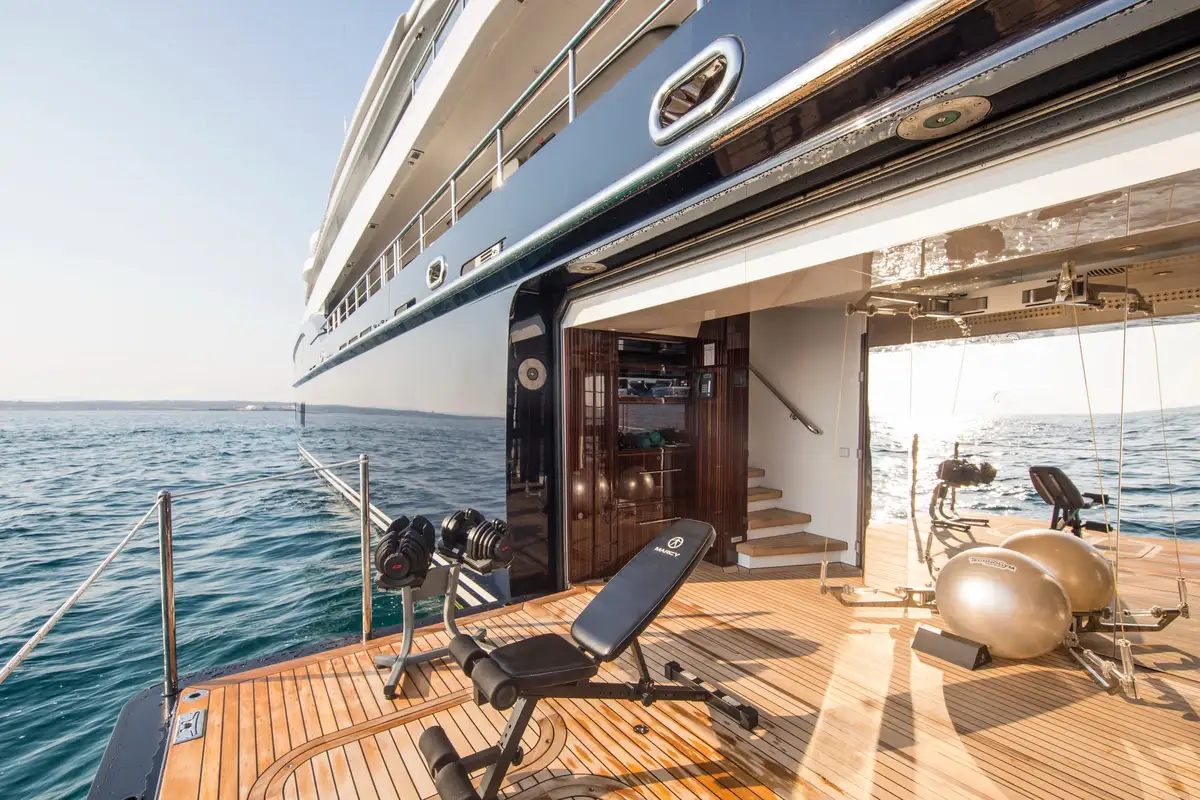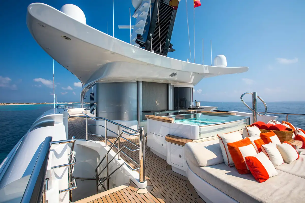 Accommodating guests in 7 cabins - 3 double and 2 twin cabins on the main deck, with the Master Suite and the 7th cabin on the owner's deck above, she is able to carry 12 guests and 2 staff. On the lower deck, there is a full cinema with reclining chairs, an open waterside gym and separate bar / spa lounging. On the main deck, in addition to the guests cabins, there is a welcoming bar and lounge area, interior dining room and welcoming half-moon exterior seating. On the Owner's deck, travelling forward through the private office with the 7th cabin to the port side is the Master suite with a 180-degree view and large private deck with seating and jacuzzi, his and her bathrooms (with bath and shower). To the aft of the Owner's deck, is a large and welcoming lounge with card table and opens onto the exterior deck where there is a bar and sofas. The bridge deck is all about the exterior with a large buffet for serving, dining table for 12 with wrap-around windbreaks to protect from the elements and cosy seating. On the sundeck is the spa pool with waterfall and forward seating area. All decks are connected by the central circular lift.