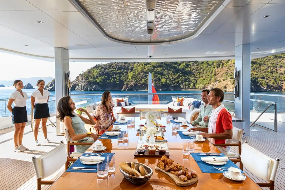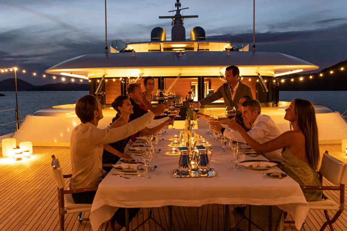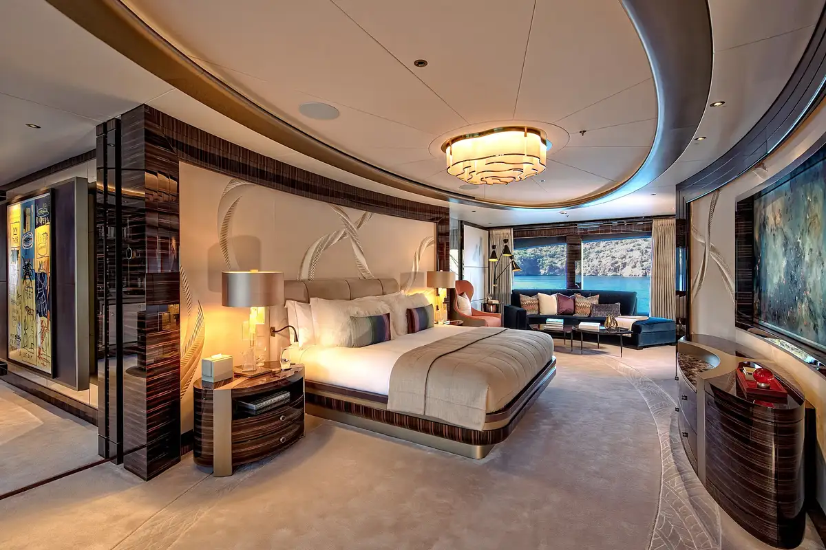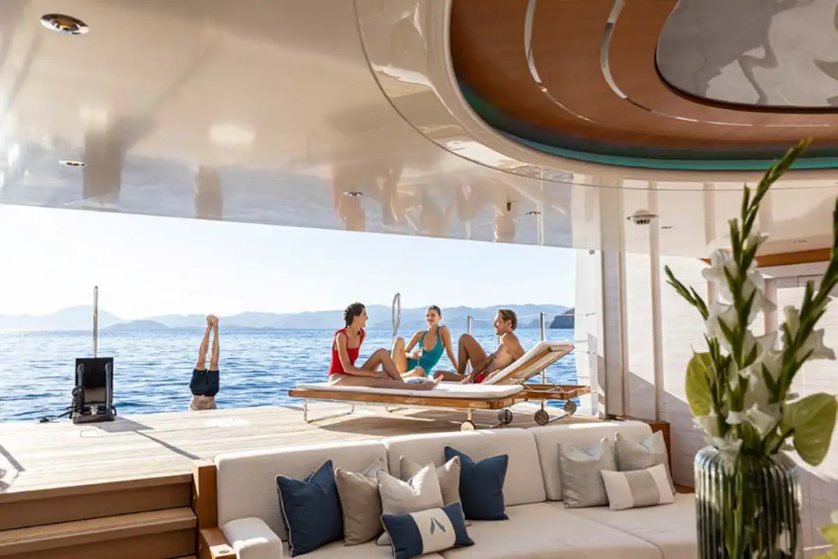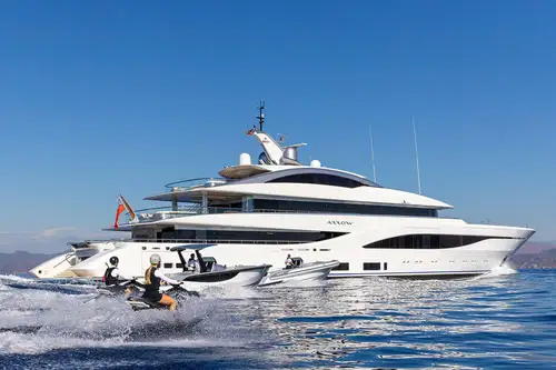 However, ARROW yacht’s standout feature is surely her full-beam beach club, which transforms into a sea-level evening entertaining lounge. There’s a bar, lots of seating and access to the massage room and steam shower. And, of course, during the day this is the hub of activity for guests who want to try out the plethora of water toys or hop aboard one of three tenders. Guests on an ARROW yacht charter can expect the highest levels of quality and service, while a glass elevator from the lower deck to the bridge deck makes it an ideal base for multigenerational charters. With stabilisers at anchor and underway, ARROW yacht assures a smooth charter and your guests will want for nothing.
