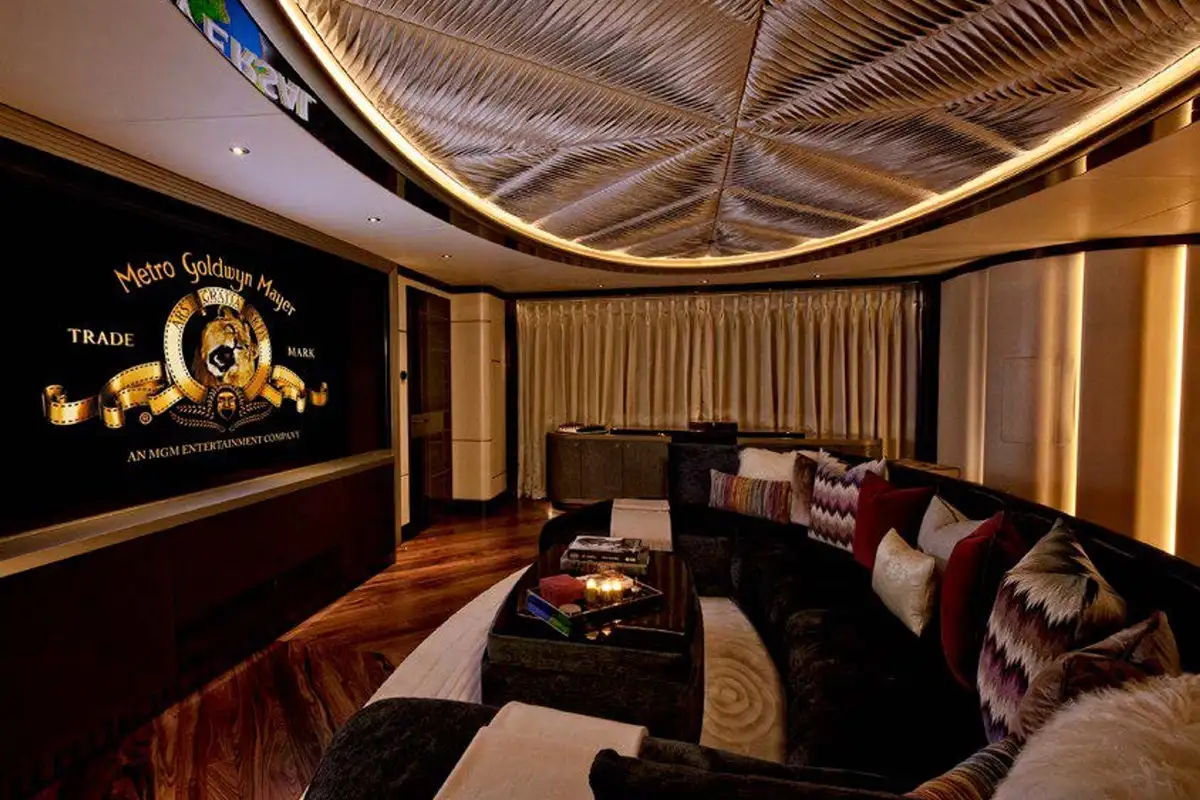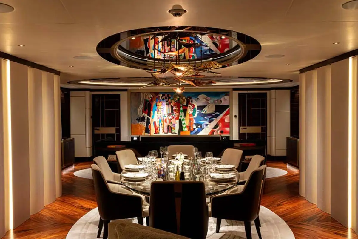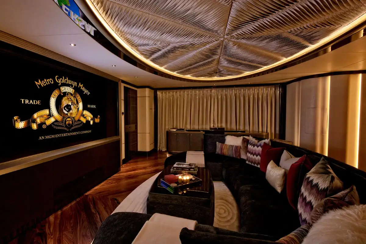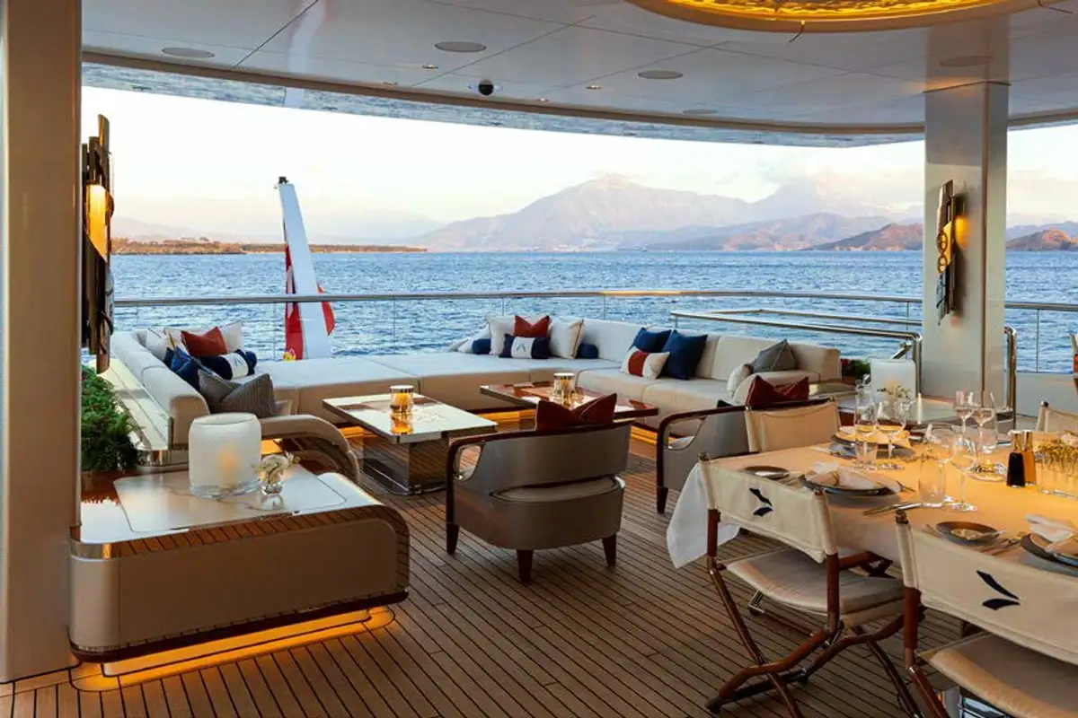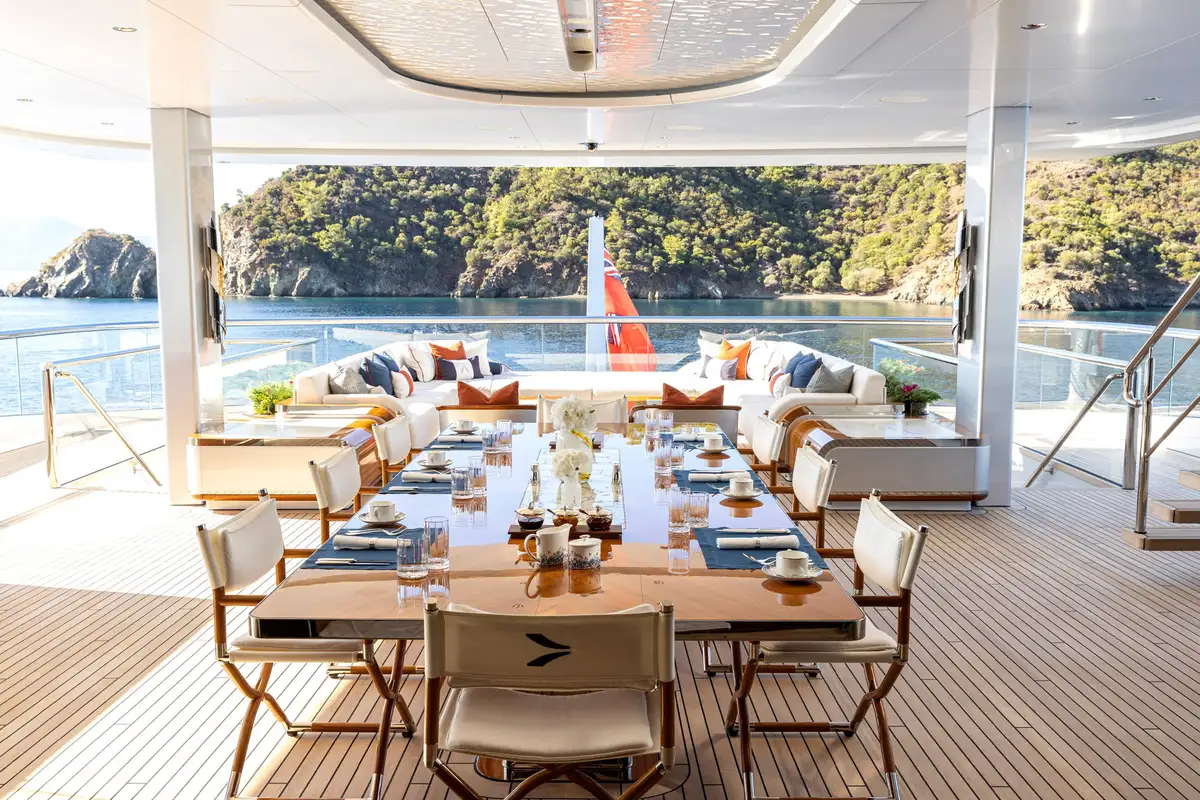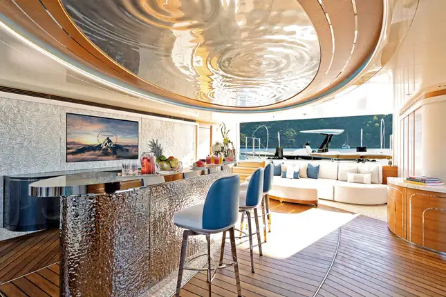 Formal dining for 12 round a glass table lies beyond and further still there’s a cinema area with surround sound. Up in the bridge deck sky lounge, doors open up to the aft terrace seamlessly, where guests can enjoy alfresco dining under the protection of retractable glass panels or chill out in the lounge area aft and enjoy enviable vistas through the infinity view glass bulwarks.
