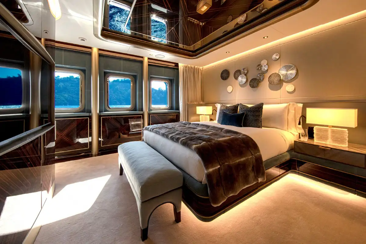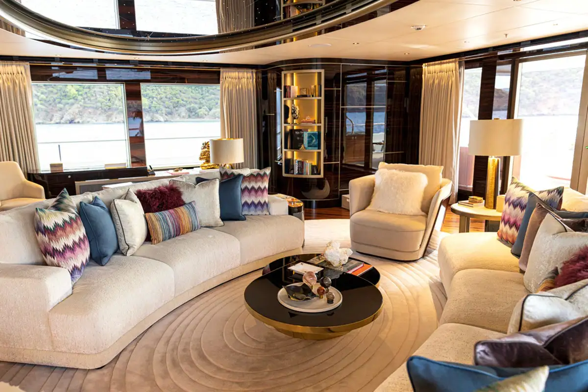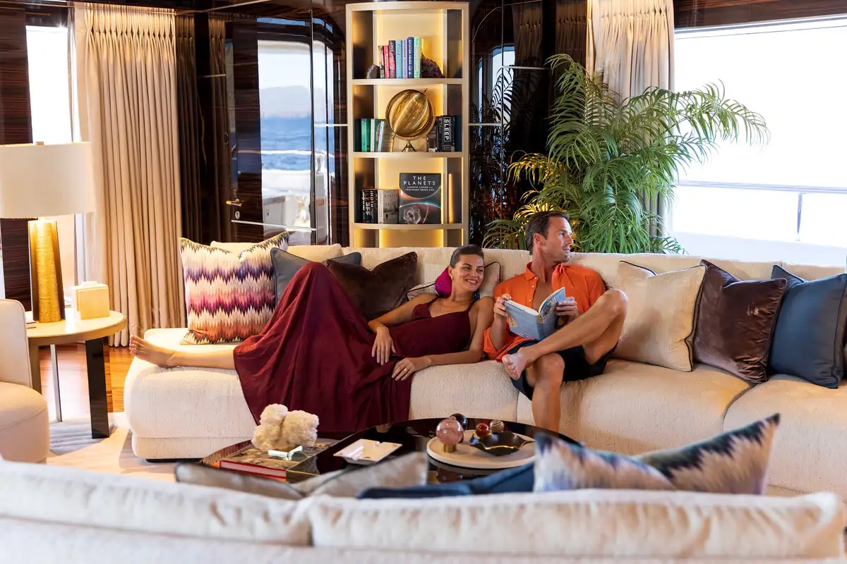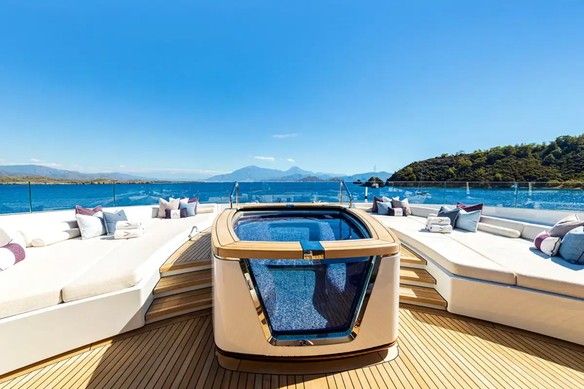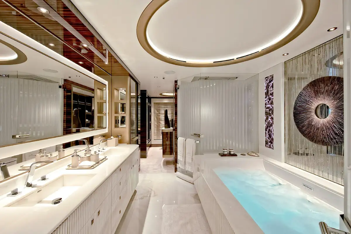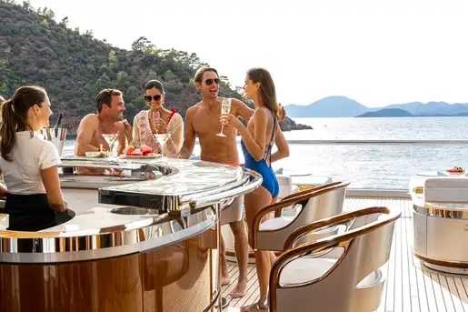 An ARROW yacht charter can accommodate 12 guests across six cabins, including a main deck master, a bridge deck VIP and three further doubles and a twin cabin on the lower deck. Charter guests will love her exquisite sun deck, with its partially transparent Jacuzzi with sunpads forward, pizza oven and barbecue area, gym – which can be either open or enclosed – a cool sit-up bar and lots of lounging options, including C-shaped sofas aft with more infinity views.