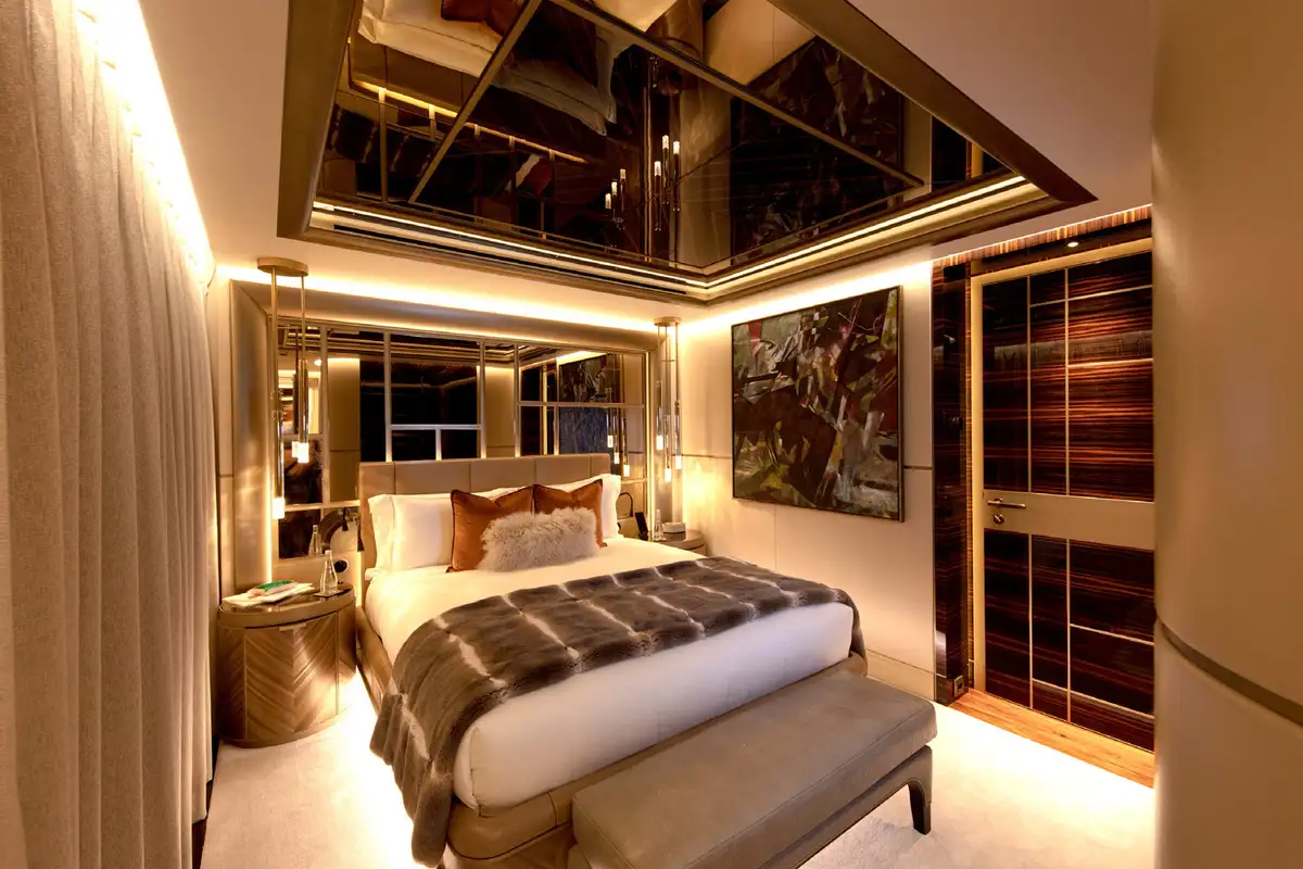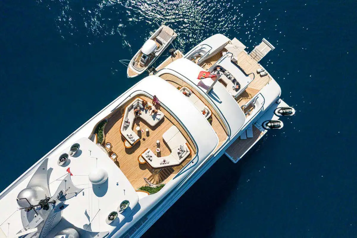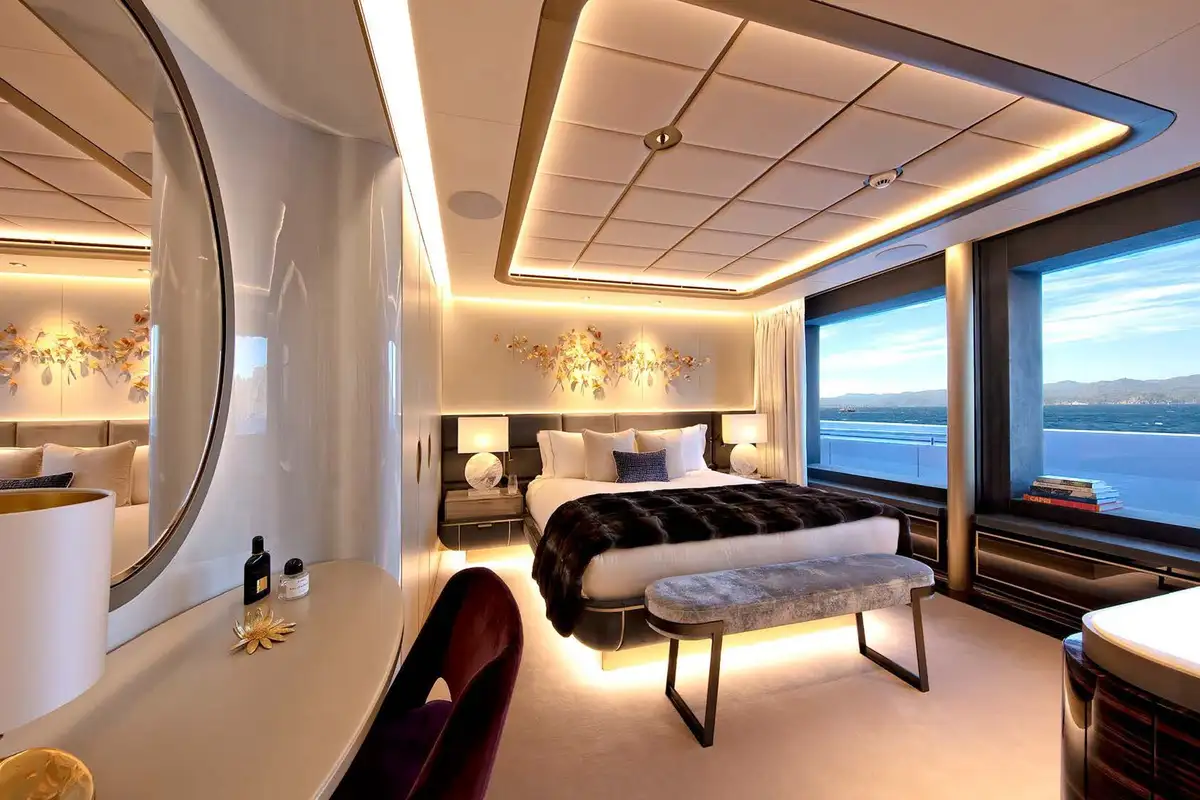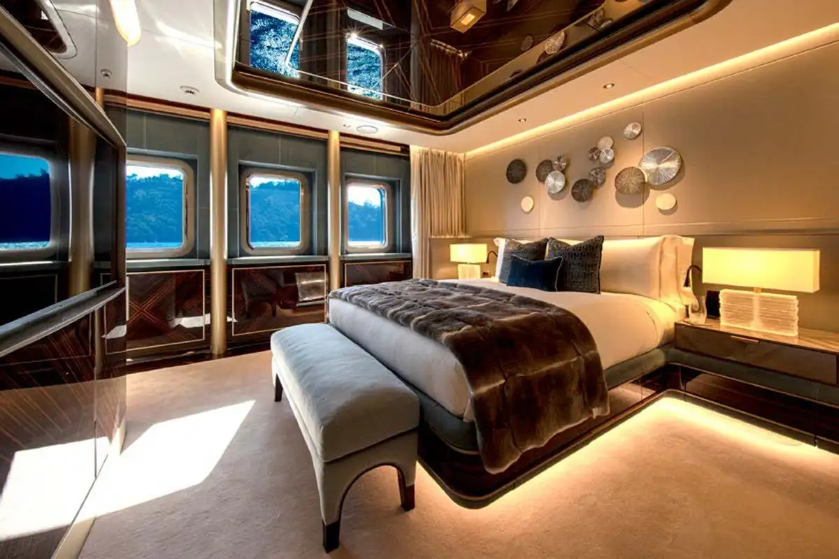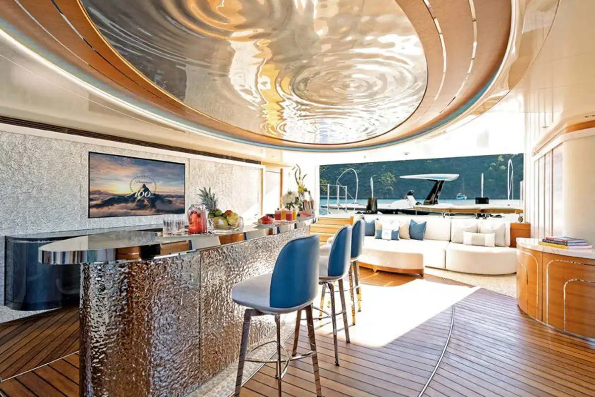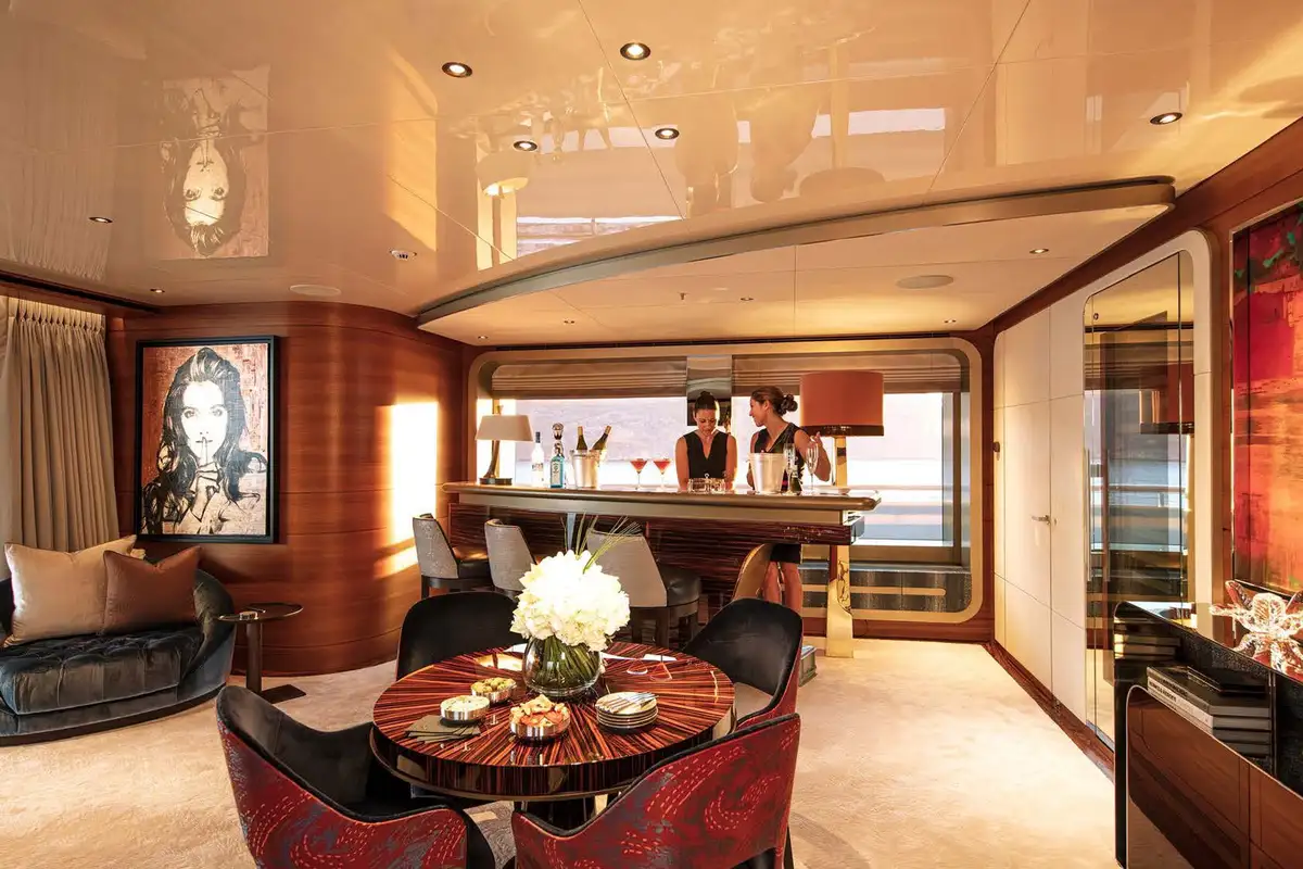 An ARROW yacht charter can accommodate 12 guests across six cabins, including a main deck master, a bridge deck VIP and three further doubles and a twin cabin on the lower deck. Charter guests will love her exquisite sun deck, with its partially transparent Jacuzzi with sunpads forward, pizza oven and barbecue area, gym – which can be either open or enclosed – a cool sit-up bar and lots of lounging options, including C-shaped sofas aft with more infinity views.