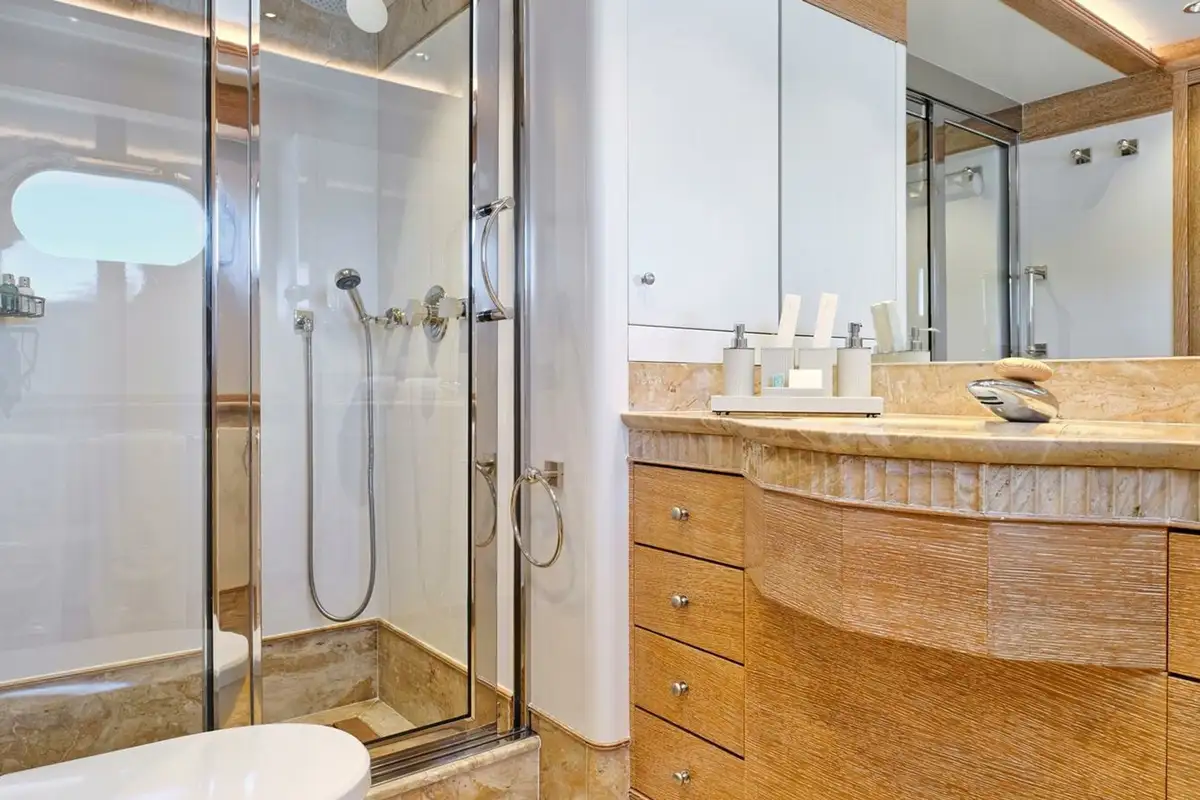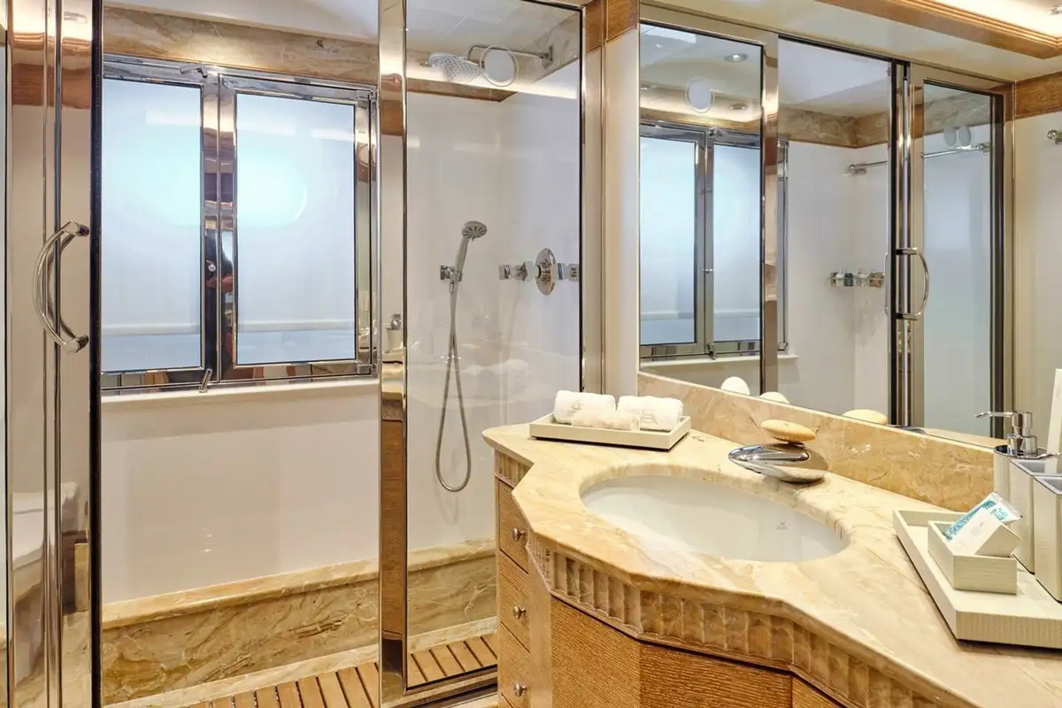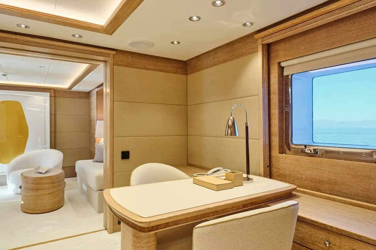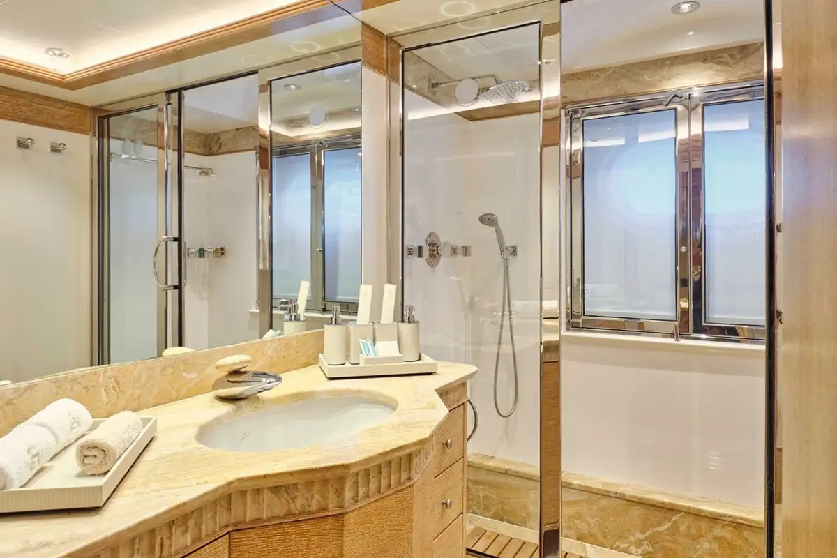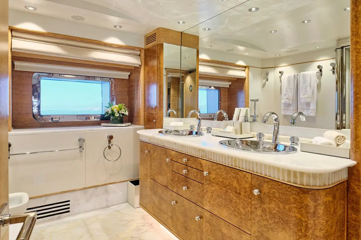 When it’s time for bed the full-beam master suite is forward on the main deck. Enter from the main lobby, through the private office and into the bedroom with a double bed to port and lounge to starboard. There’s a shared walk-in wardrobe between his-and-hers bathrooms. Two double cabins and two twin cabins on the lower deck complete family-friendly accommodation for 10 guests.