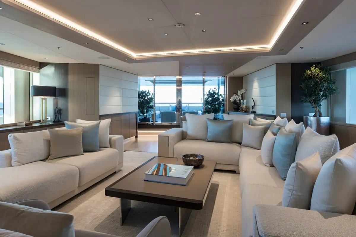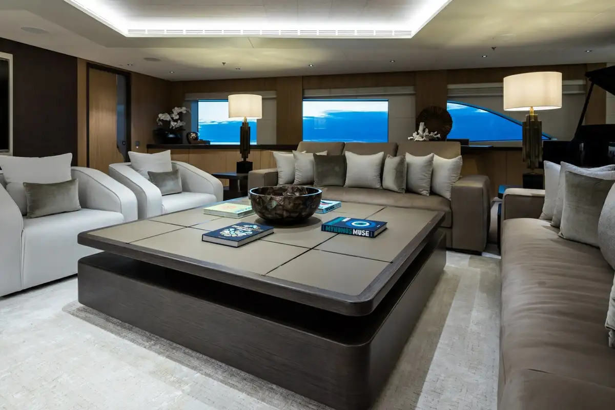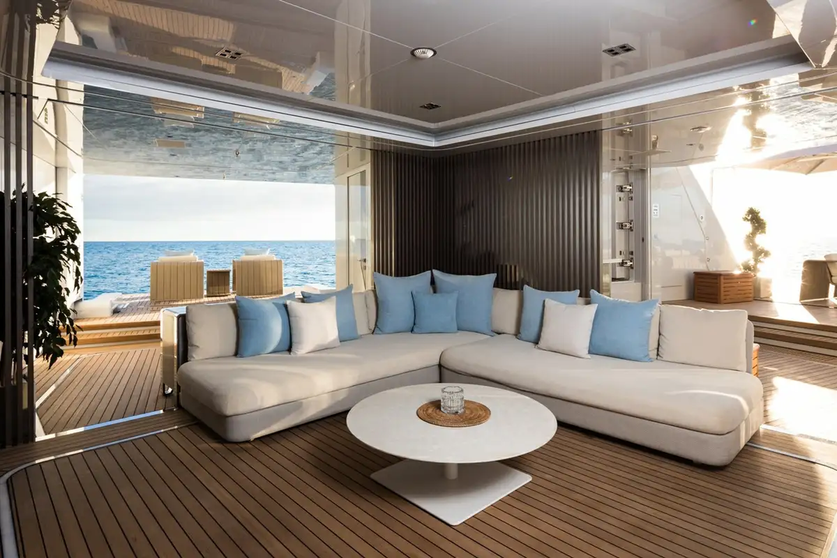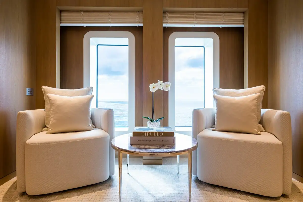 Although her exterior is remarkable, the real wow factor is inside. Her vast 1,245GT of internal living space is designed by the renowned Bannenberg & Rowell studio to host up to 12 guests on board with an innovative arrangement of asymmetric interior spaces in which the main deck lounge, sky lounge and beach club have all been rotated by 30 degrees. This subtle shift delivers a new perspective on yachting, offering unique views when you’re looking out. It also changes the dynamic of the main guest spaces on board, making them feel relaxed and elegant.