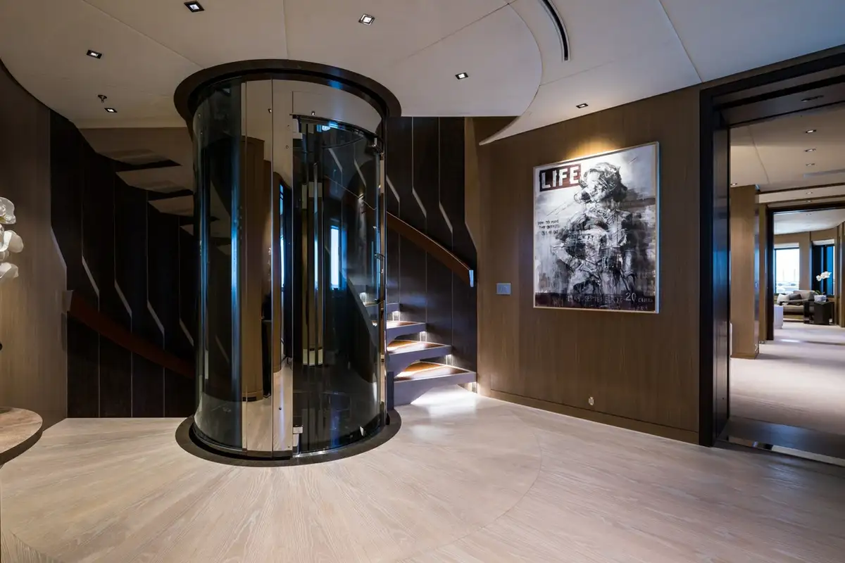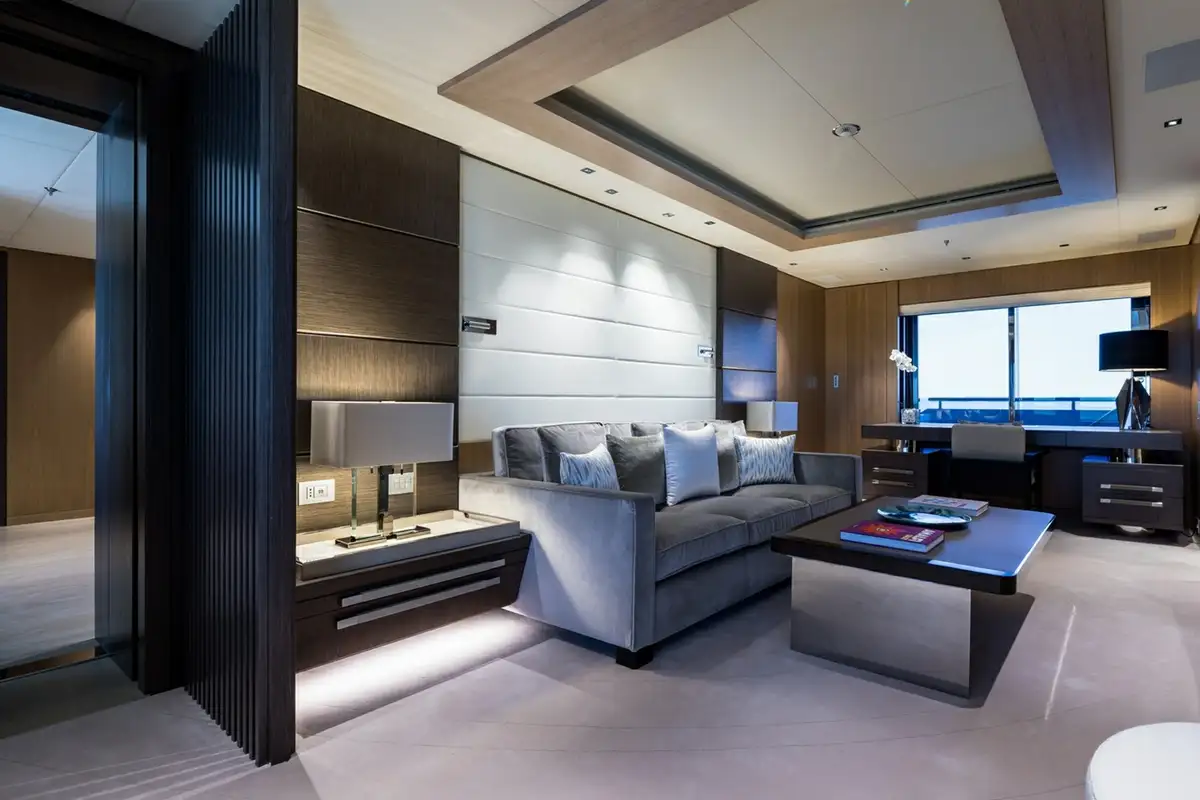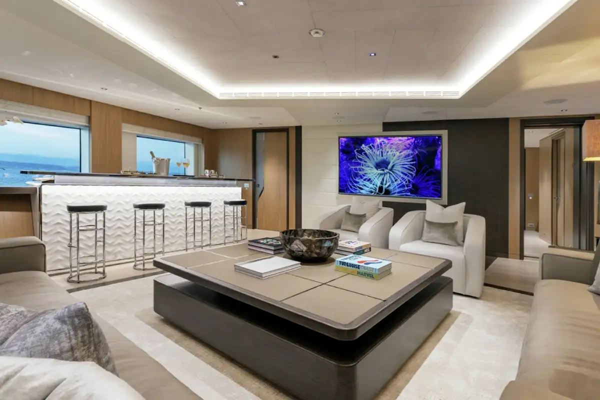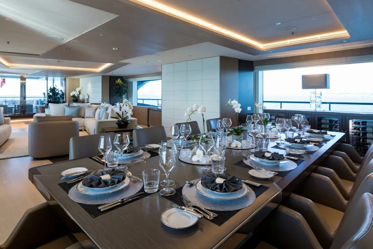 Although her exterior is remarkable, the real wow factor is inside. Her vast 1,245GT of internal living space is designed by the renowned Bannenberg & Rowell studio to host up to 12 guests on board with an innovative arrangement of asymmetric interior spaces in which the main deck lounge, sky lounge and beach club have all been rotated by 30 degrees. This subtle shift delivers a new perspective on yachting, offering unique views when you’re looking out. It also changes the dynamic of the main guest spaces on board, making them feel relaxed and elegant.