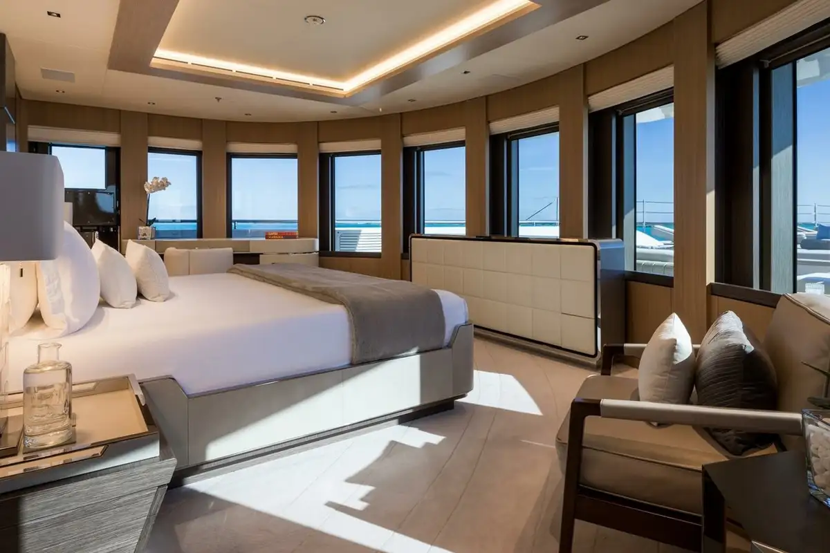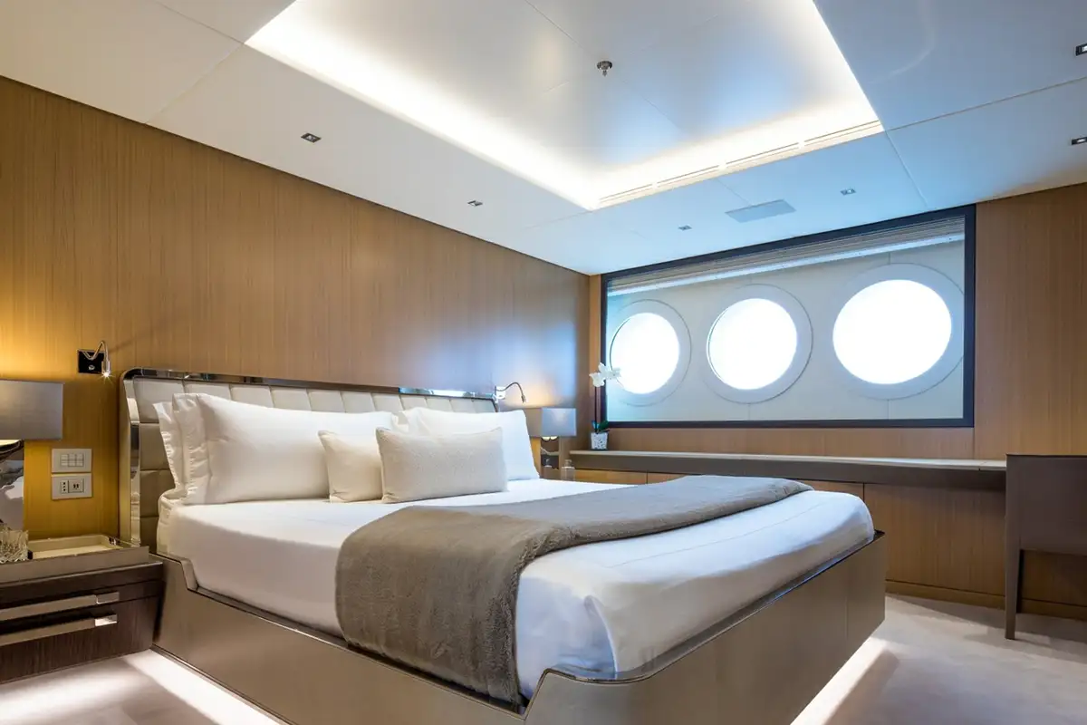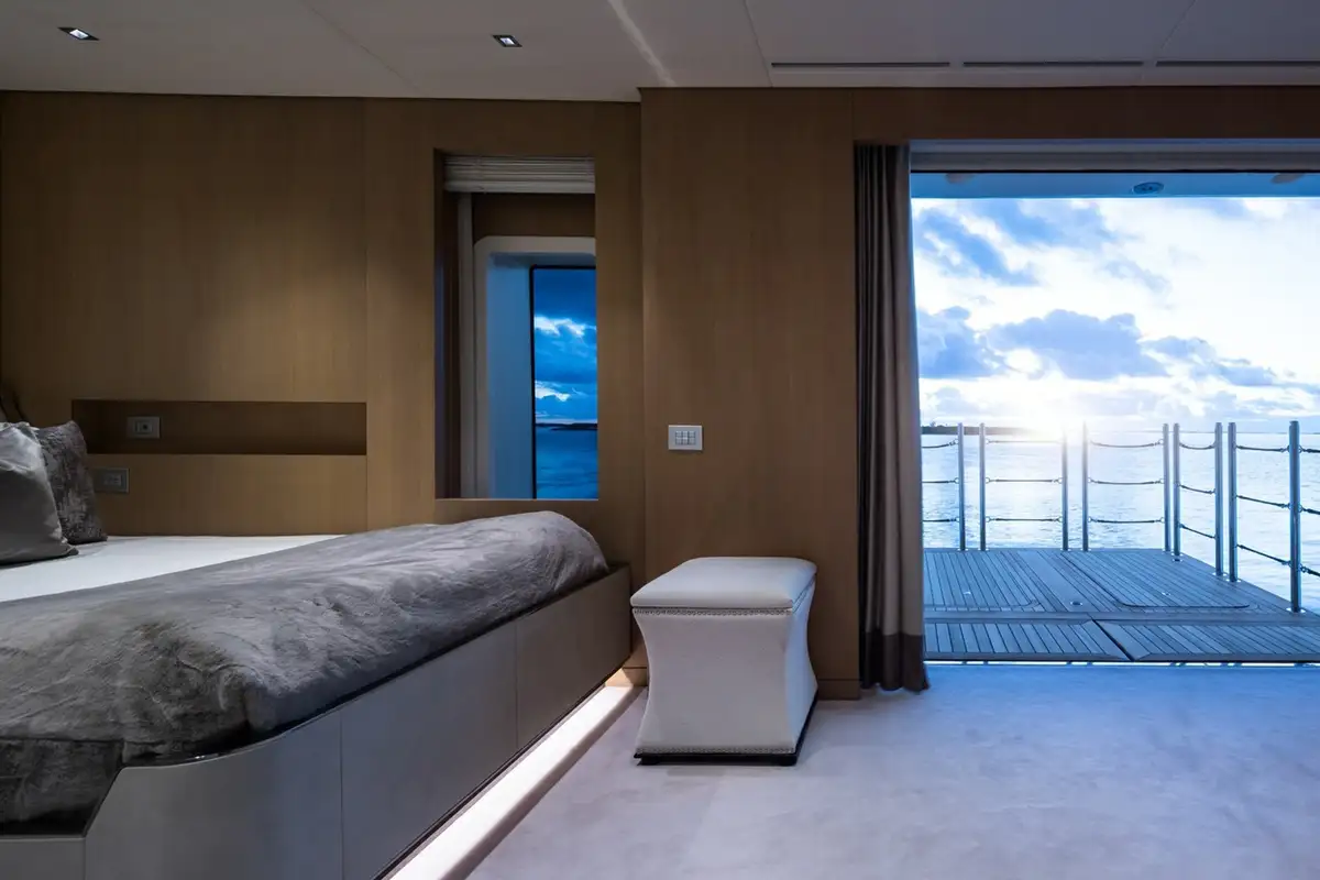 The master cabin is huge – 160sqm – with an office and lounge area, two dressing rooms, two interconnected bathrooms and a spectacular sweep of forward-facing windows with a 180-degree panoramic view. The forward bed looks out over a large private bow terrace with seating and sunpads up front.