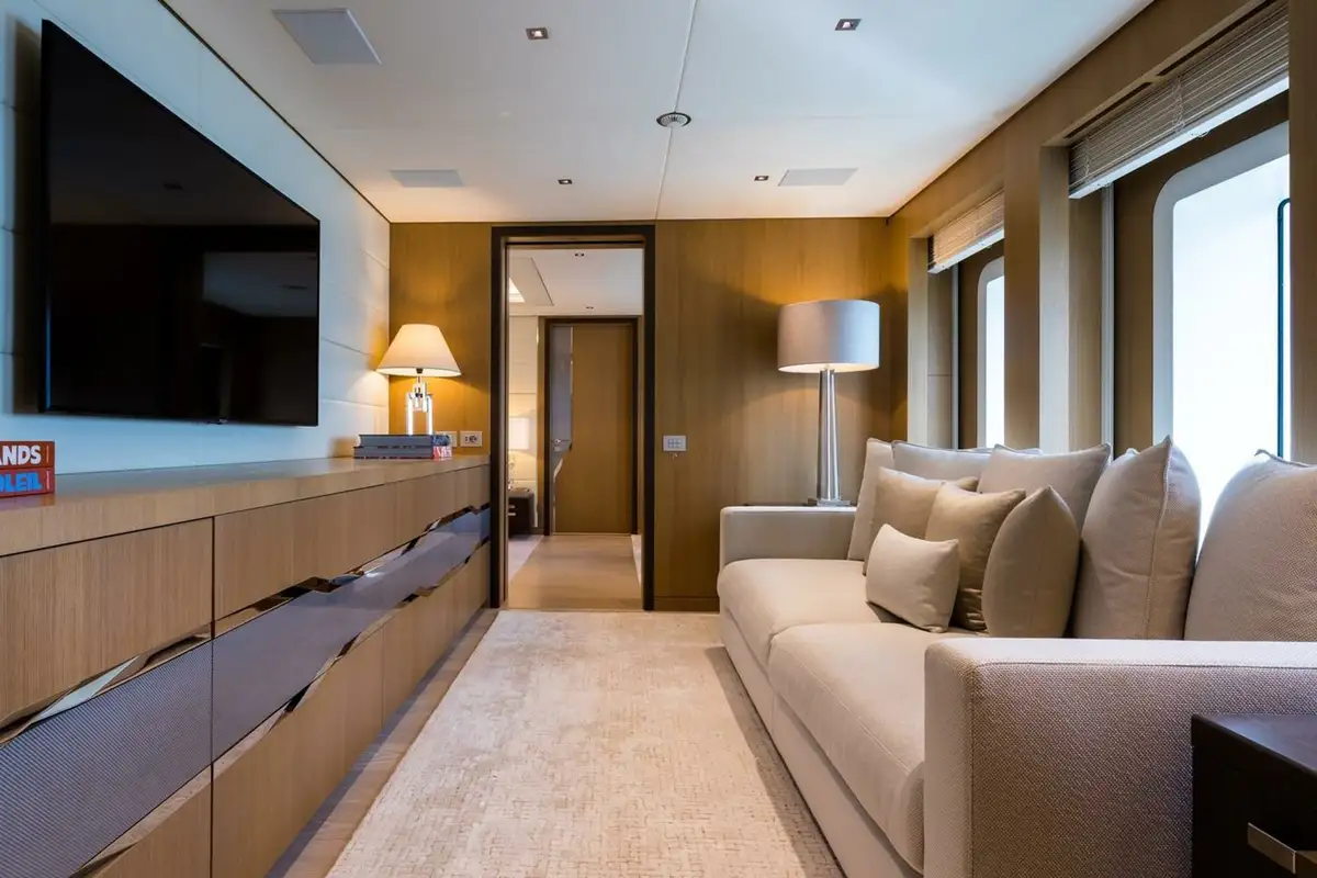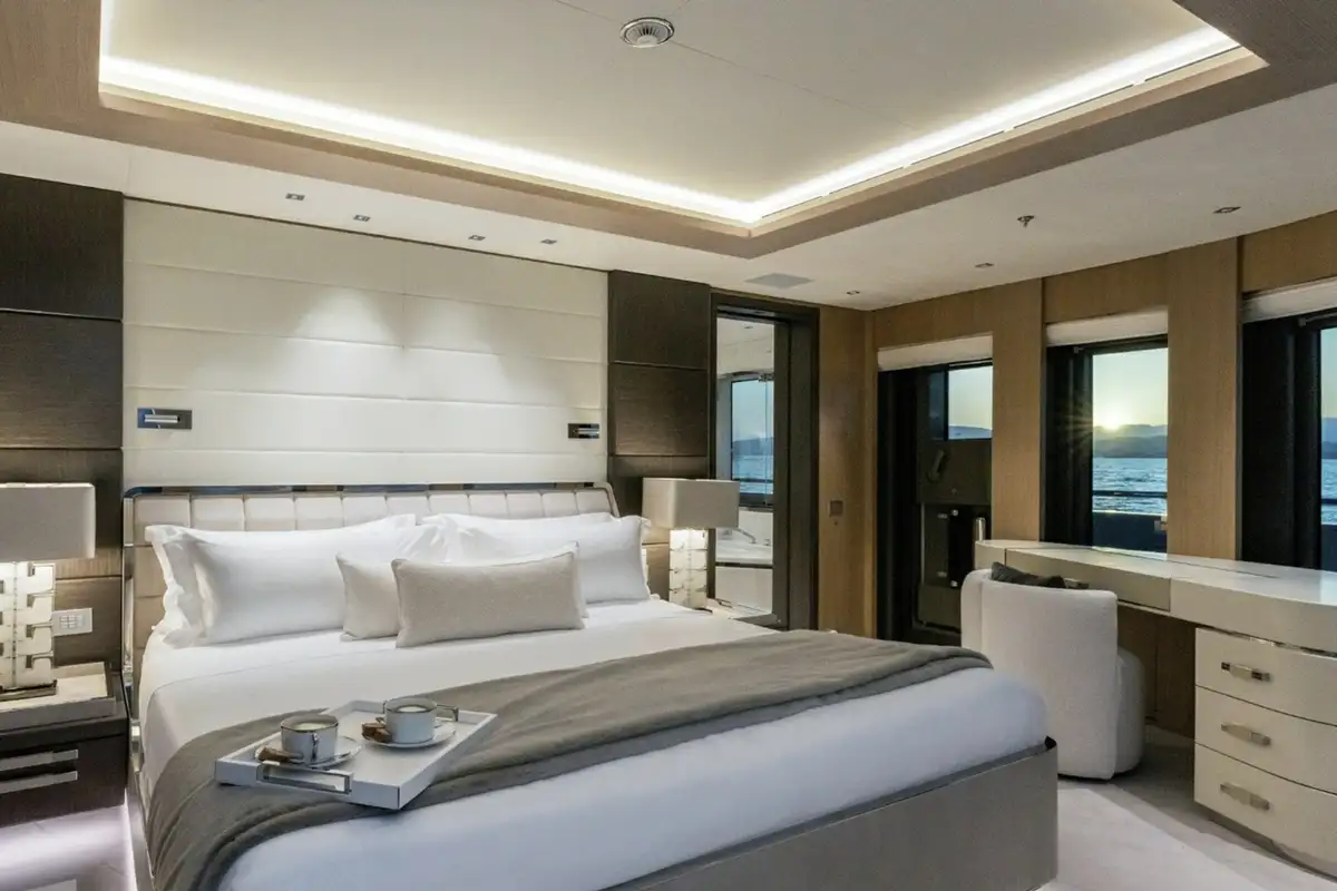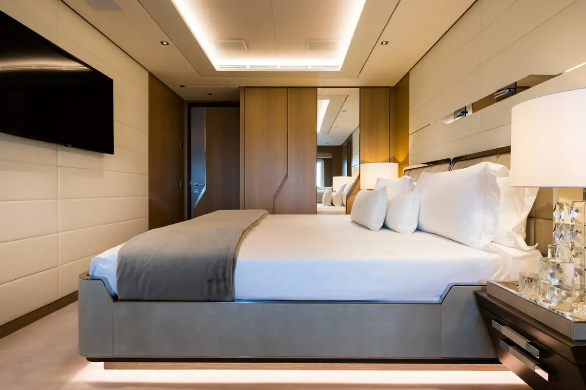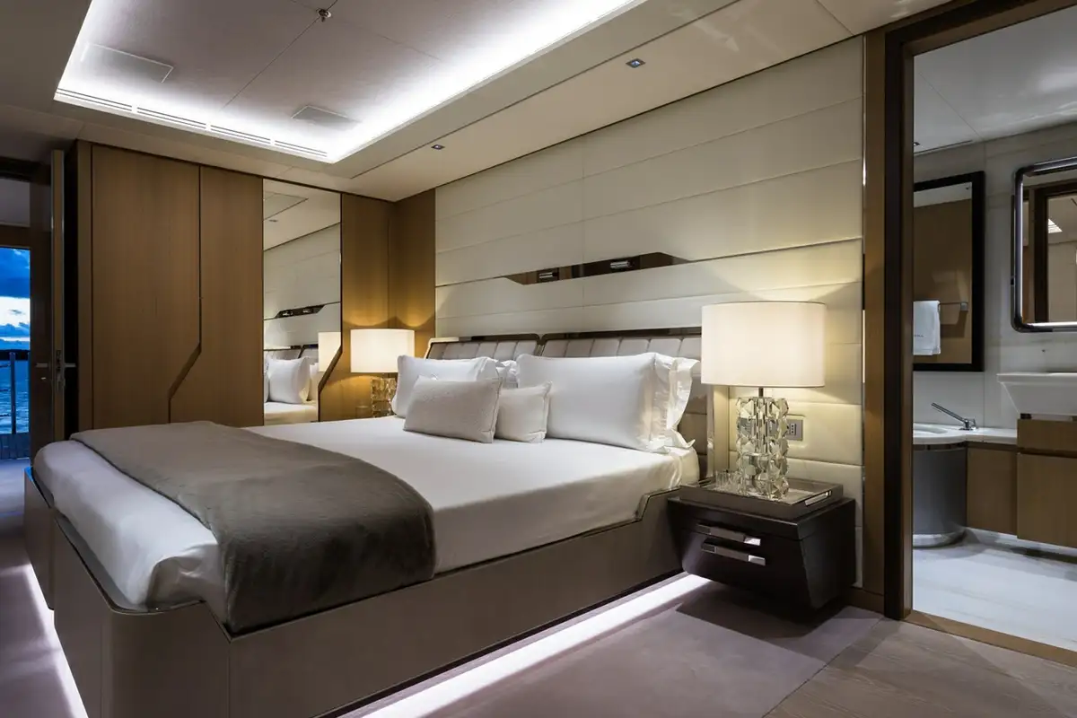 The master cabin is huge – 160sqm – with an office and lounge area, two dressing rooms, two interconnected bathrooms and a spectacular sweep of forward-facing windows with a 180-degree panoramic view. The forward bed looks out over a large private bow terrace with seating and sunpads up front.