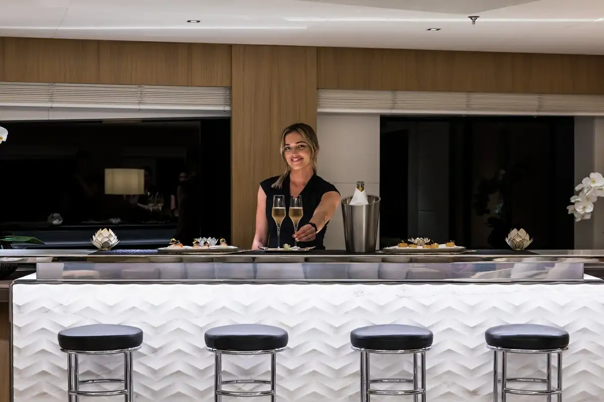 The interior design palette is crisp and contemporary, with iconic Fendi furniture and a bespoke white oak finish offset by carbon fibre and finely crafted details in smoked oak, cream leather and stainless steel. The sky lounge is one of the highlights on board with a dark gloss grand piano and an incredibly beautiful bar sculpted from rare white marble and framed in polished steel.