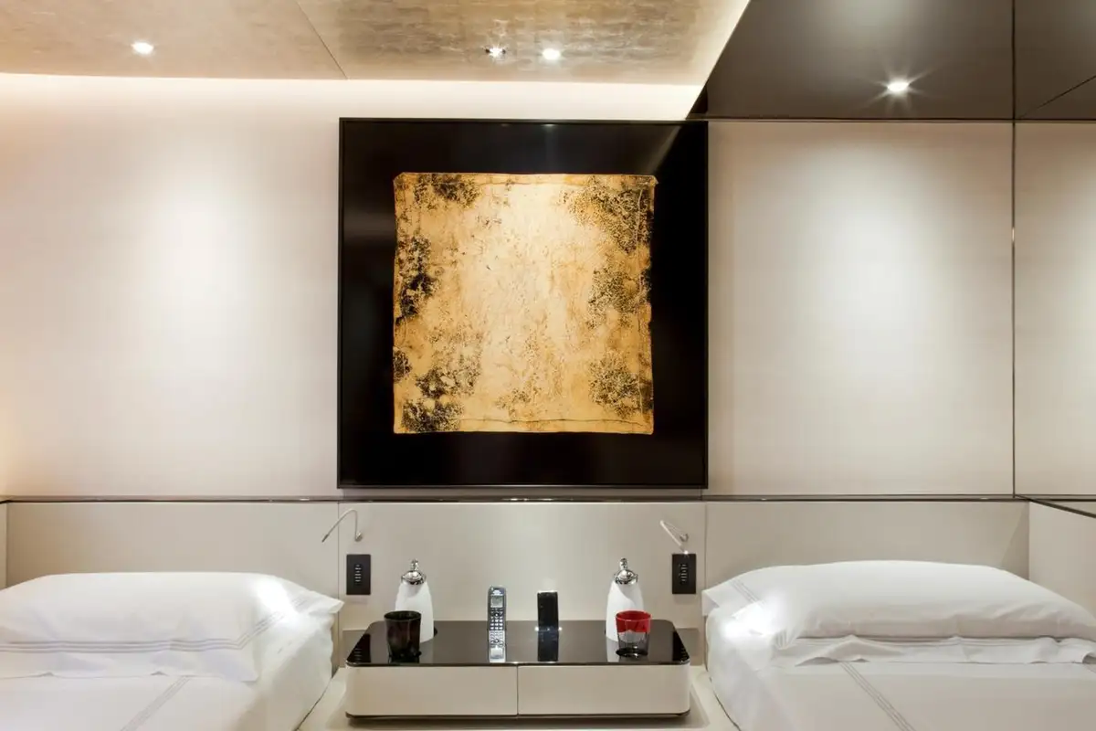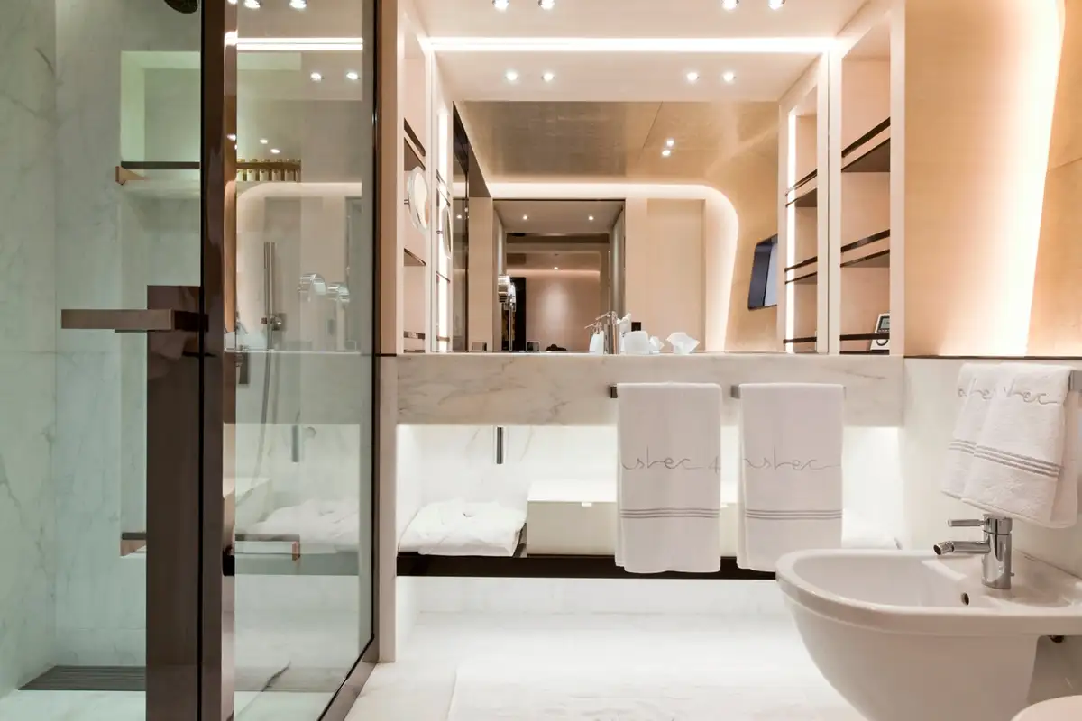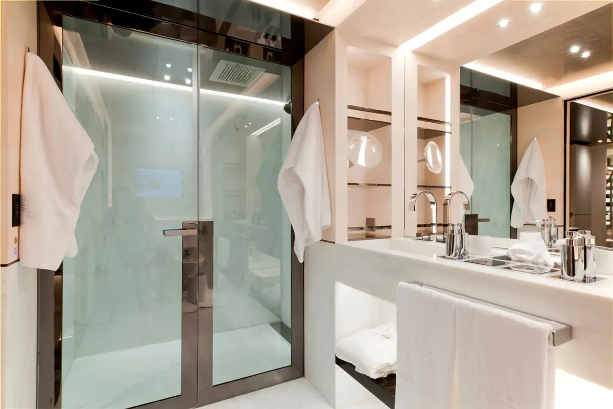 All the way forward on the main deck, your full-beam master suite is a bright and glamorous private haven – a masterclass in textural contrasts, finished in a soothing palette of off-white tones. There’s a study desk and sofa in the master cabin and a large marble bathroom with twin sinks and bidet en suite. The other four cabins – two doubles and two twins with extra pullman berths on the lower deck, all with private en suite bathrooms – are furnished and finished in the same high-class Italian style.