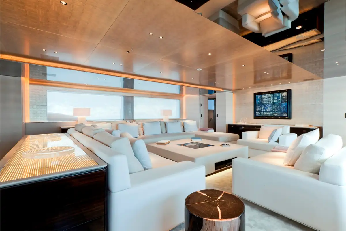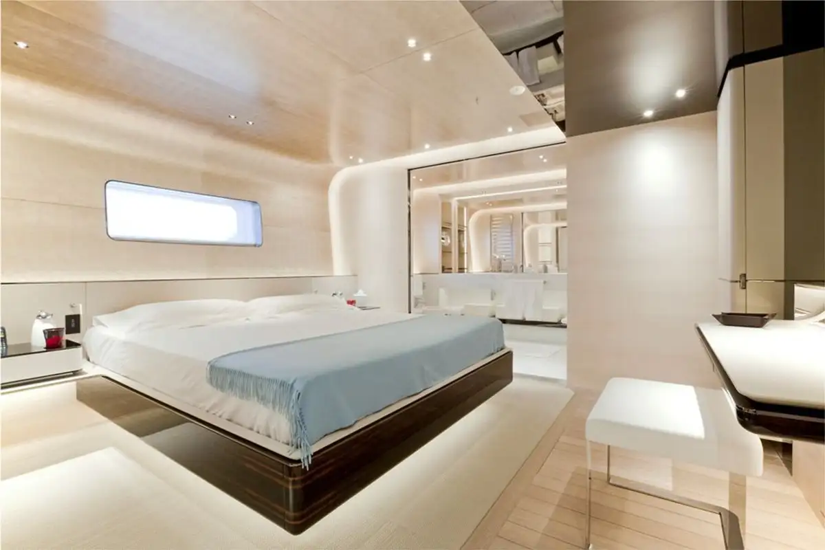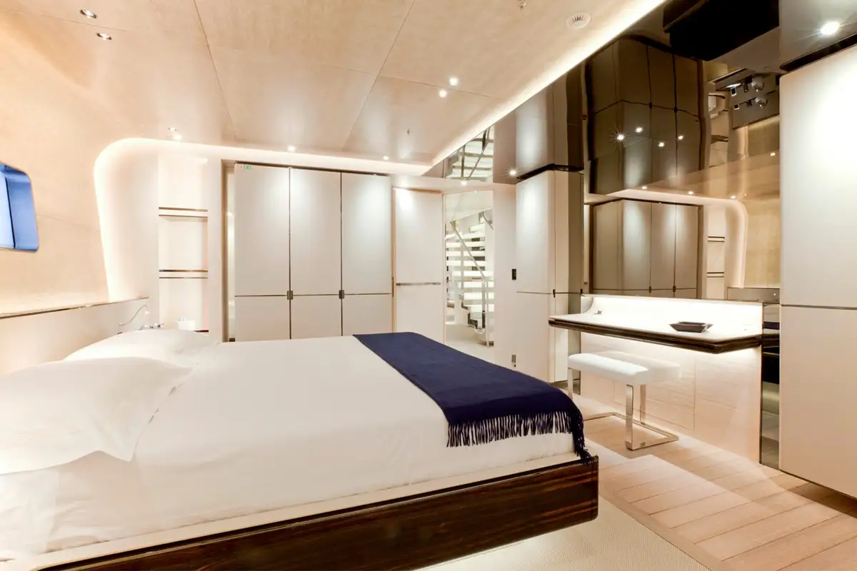 Stand out from the crowd on your charter holiday aboard the impressively sleek ASLEC 4, a remarkable 48m (160ft) full custom tri-deck yacht from the highly regarded Rossinavi shipyard. Designed to host up to 11 guests in five luxury suites, she is extremely spacious compared to most other yachts of this size with a bright, fresh and innovative interior style. You can see at a glance that elegance is one of her strongest features, with crisp exterior styling and the super-smooth quality of finish that Rossinavi yachts are famous for. A warm welcome from her seven-strong crew awaits you on the 70sqm main aft deck, with its sociable lounge between twin bars, and you are sure to notice the wonderful sense of space as soon as you step aboard. Then when you stroll inside through the sliding glass doors, you’ll see straight away how her full-beam superstructure creates so much more living space in the saloon.