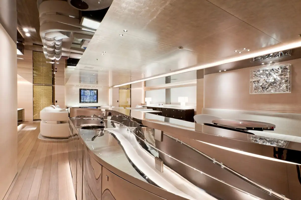 You can see at a glance that elegance is one of her strongest features, with crisp exterior styling and the super-smooth quality of finish that Rossinavi yachts are famous for. A warm welcome from her seven-strong crew awaits you on the 70sqm main aft deck, with its sociable lounge between twin bars, and you are sure to notice the wonderful sense of space as soon as you step aboard. Then when you stroll inside through the sliding glass doors, you’ll see straight away how her full-beam superstructure creates so much more living space in the saloon.