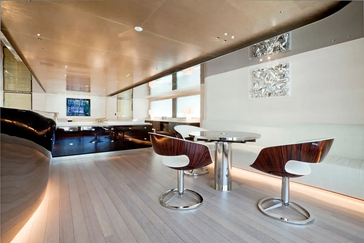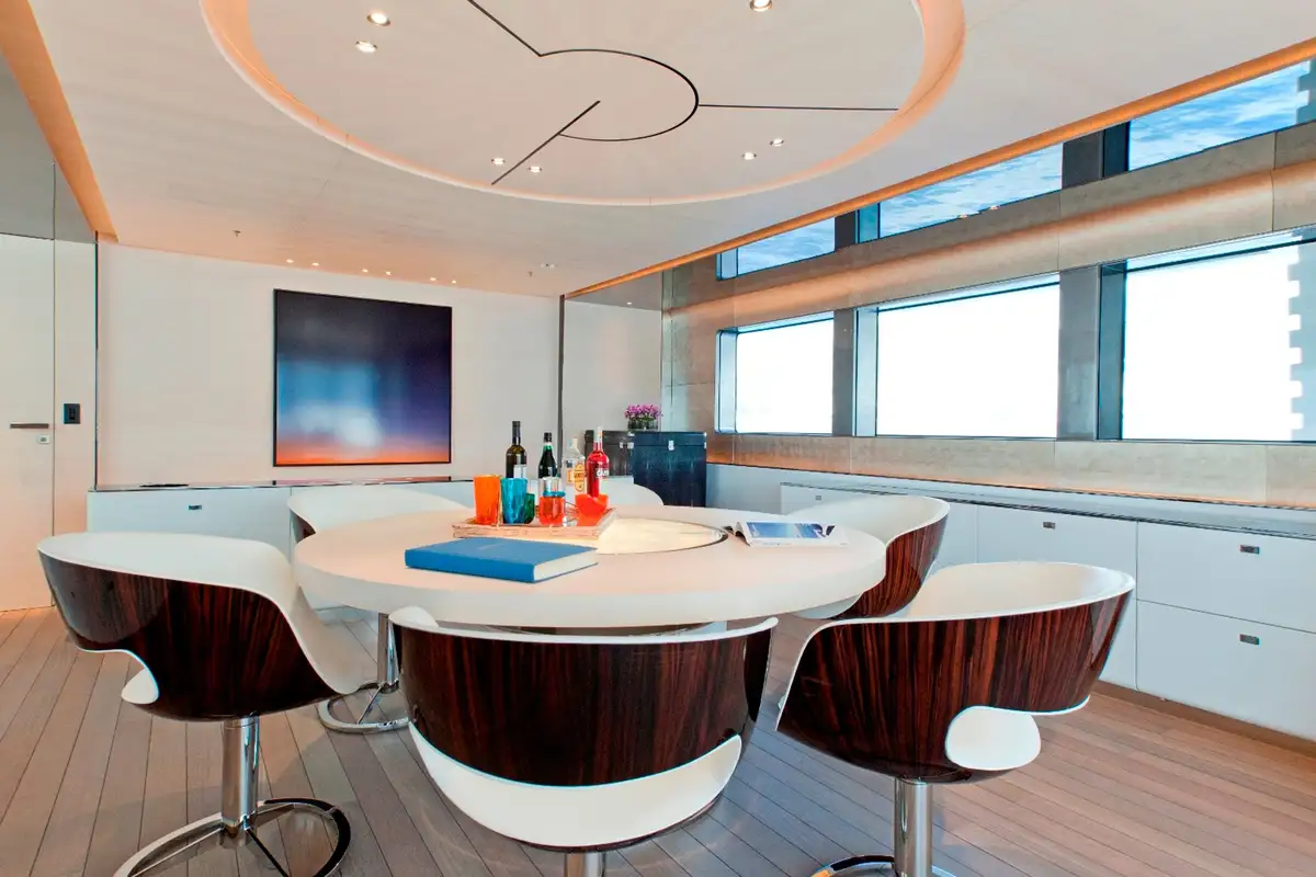 Two levels up, the clean and stylish design of the open-air sundeck offers a wonderfully uncluttered, panoramic view. Two daybed pods provide intimate nooks for private relaxation while there is a large, teak-topped jacuzzi pool and swathe of sun pads astern. There’s another full-beam sun pad on the upper aft deck, which also has comfortable armchairs clustered around twin tables – some in full sun, others in shade. There’s yet another open-air space for guests to enjoy on the breezy foredeck, with a horseshoe of sofas and another large sun pad, and the wing stations in her topsides are like miniature balconies set above the waves.