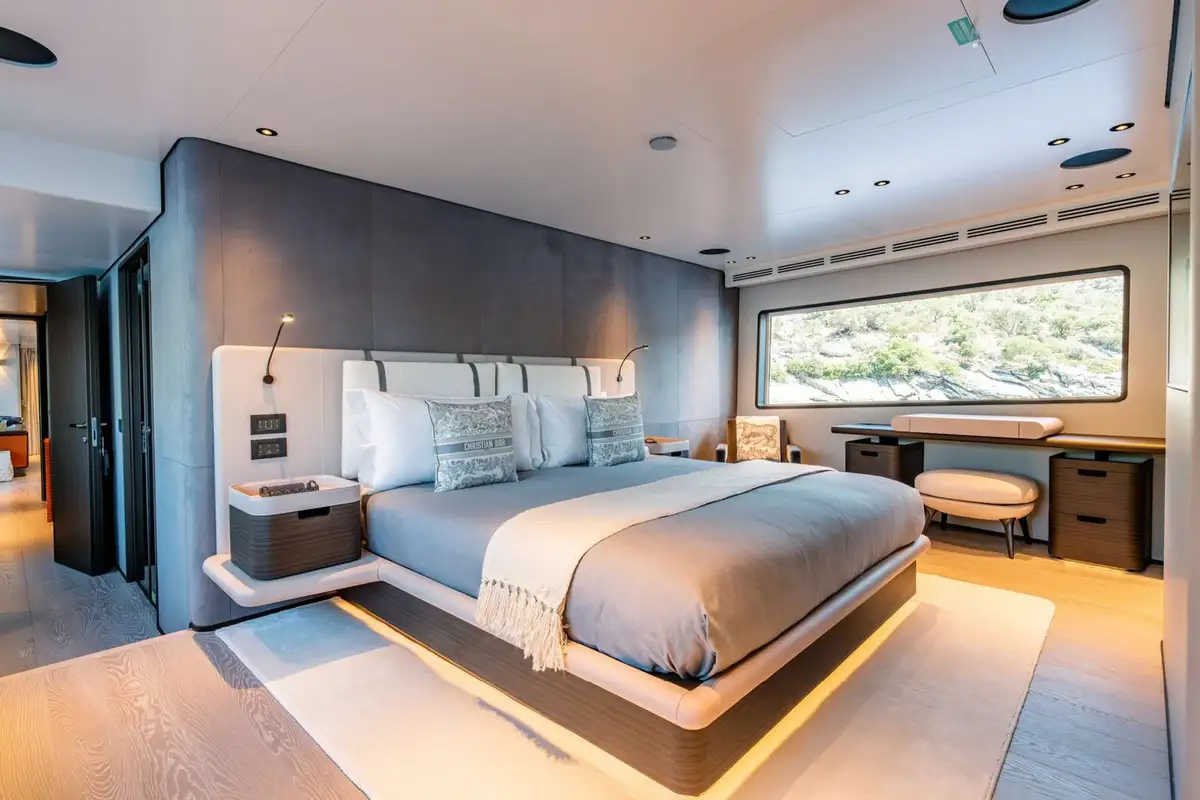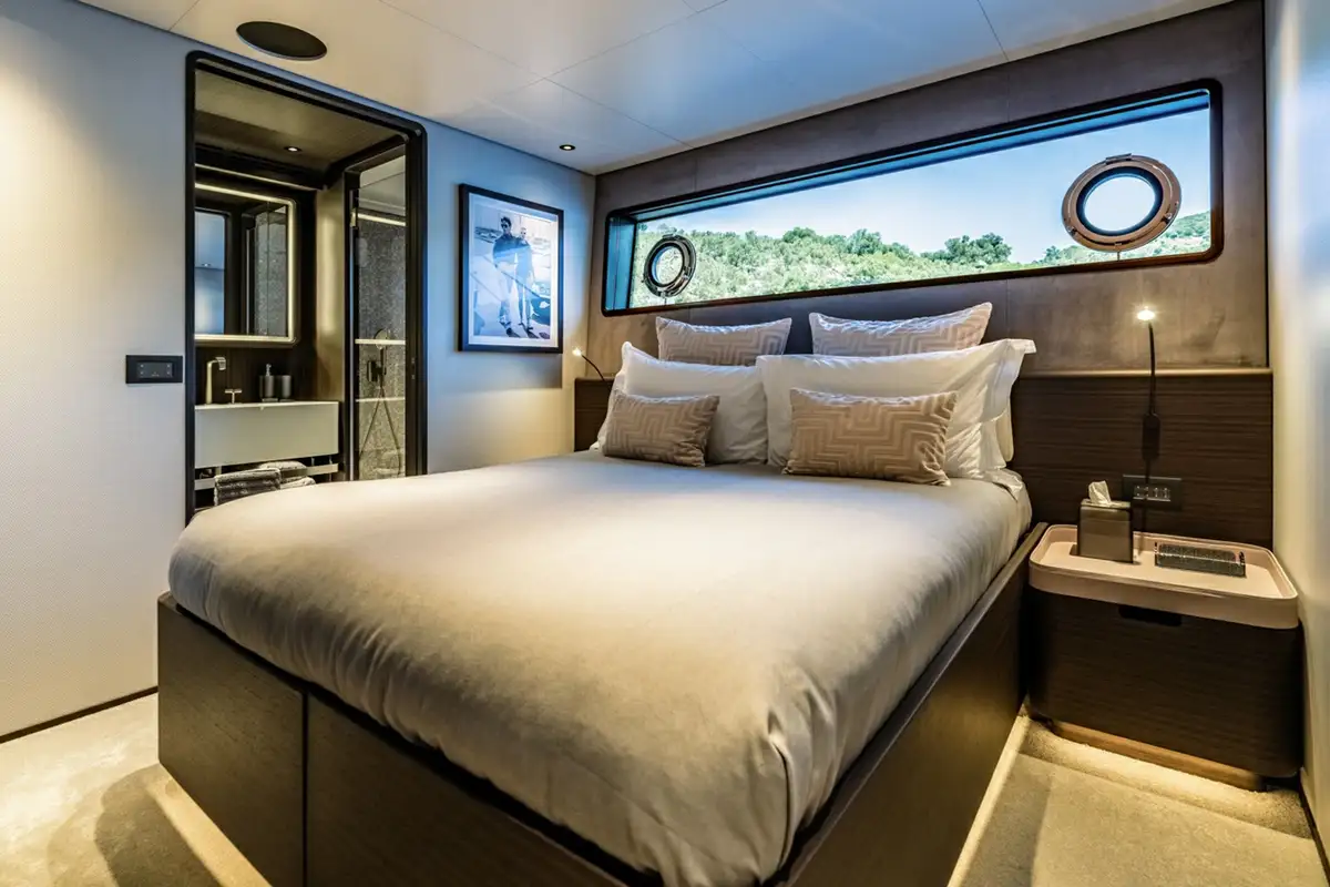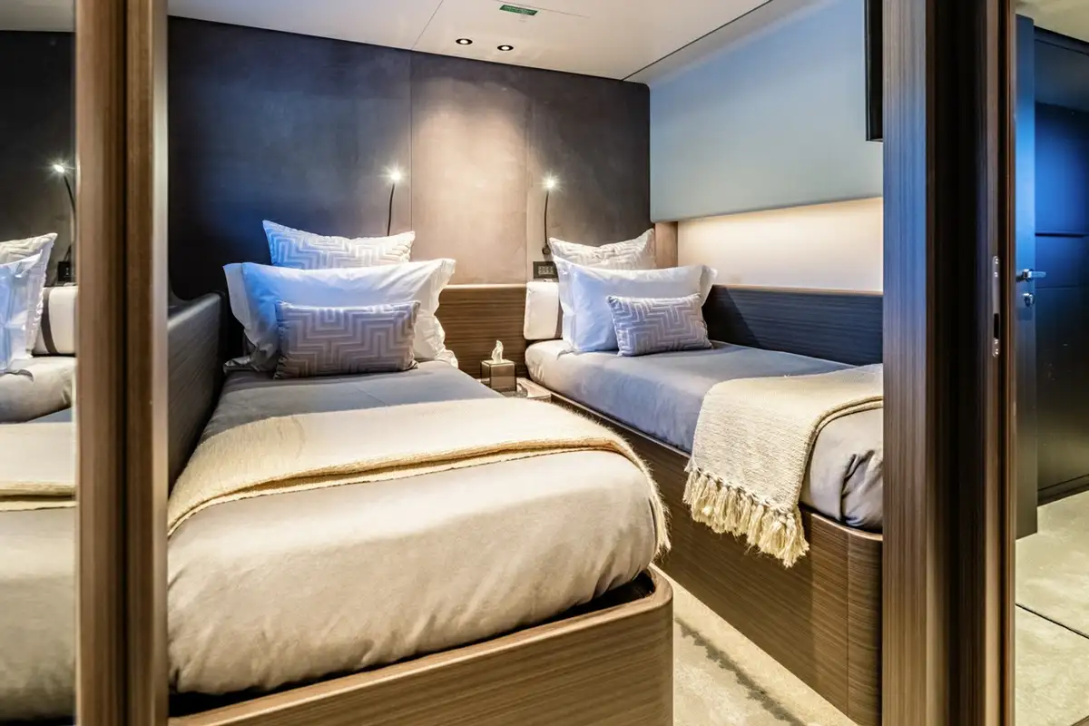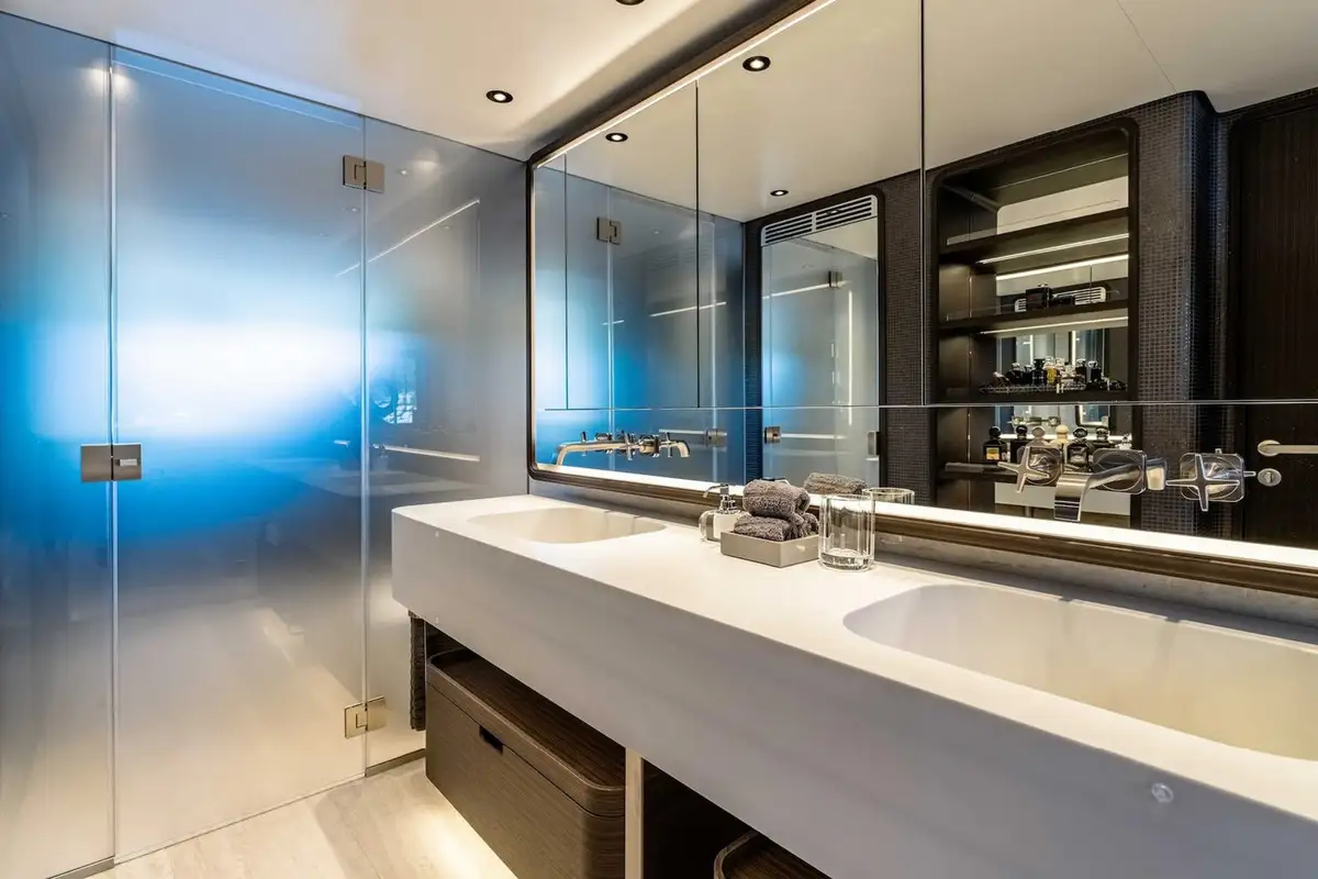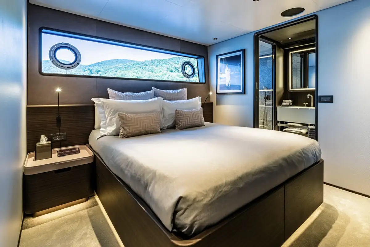 Descending into the lower deck, you'll be greeted by two VIP cabins and two twin cabins, one of which is convertible into a double. Each cabin comes with an en suite bathroom. Dual gyro and fin stabilisers ensure you will sleep in exceptional comfort, with AT ONE'S advanced noise and vibration reduction ensuring quality sound proofing from exterior noise.