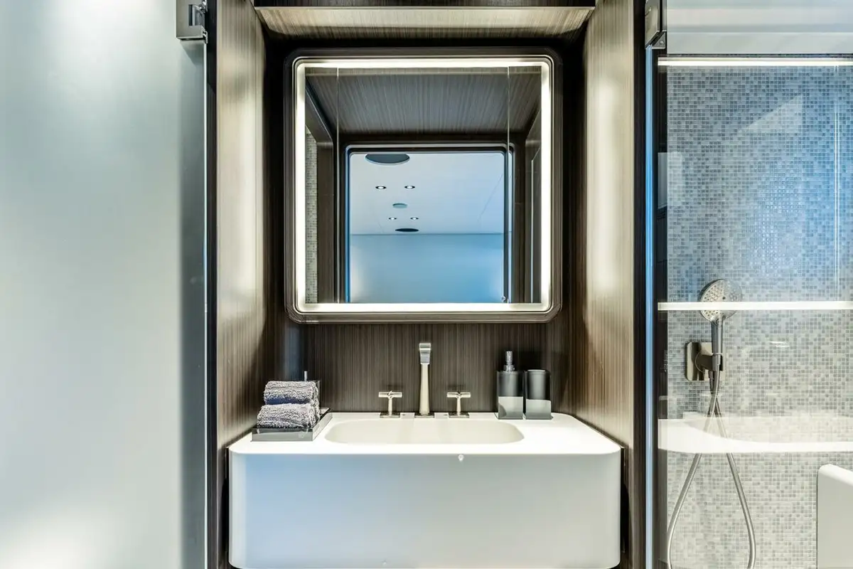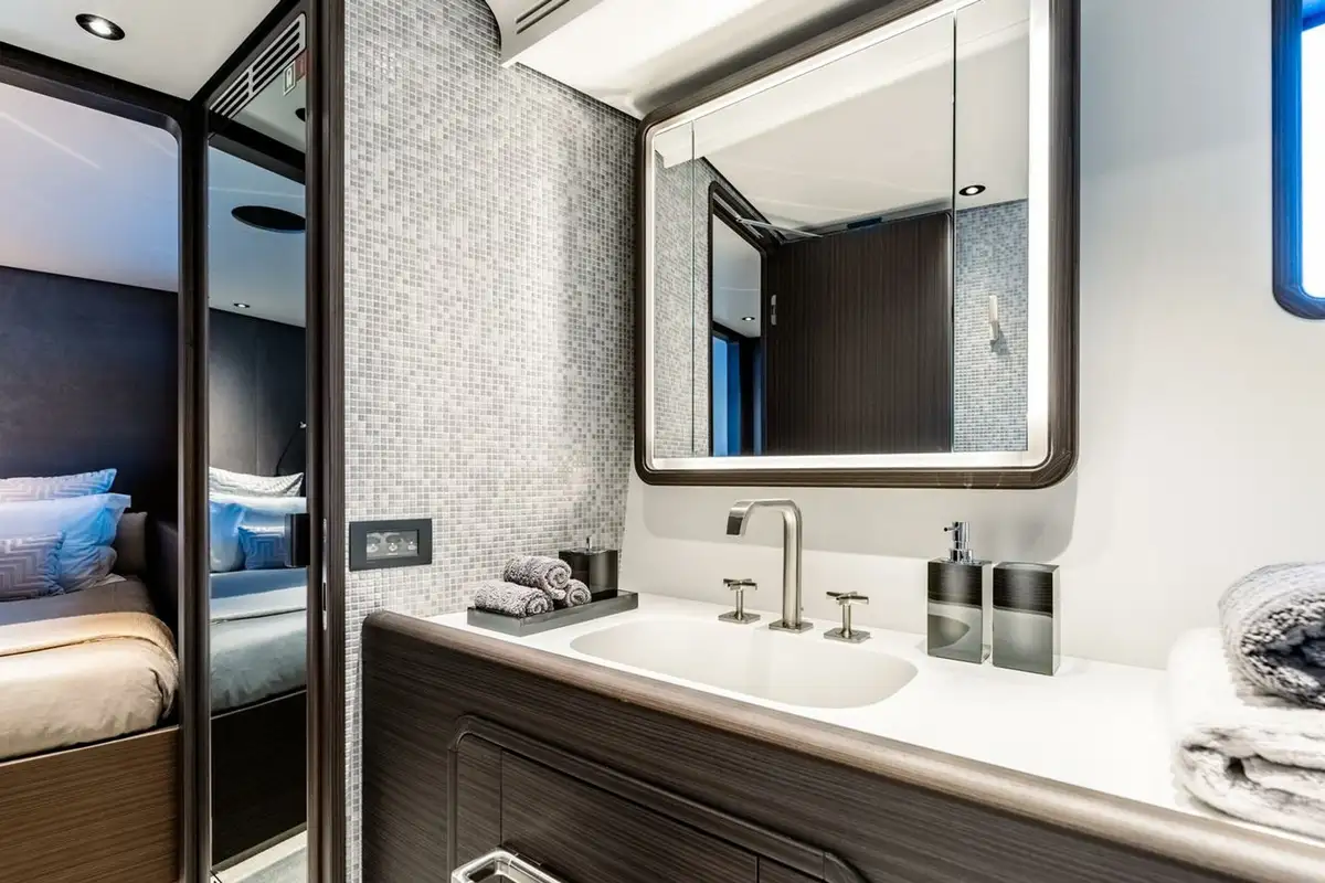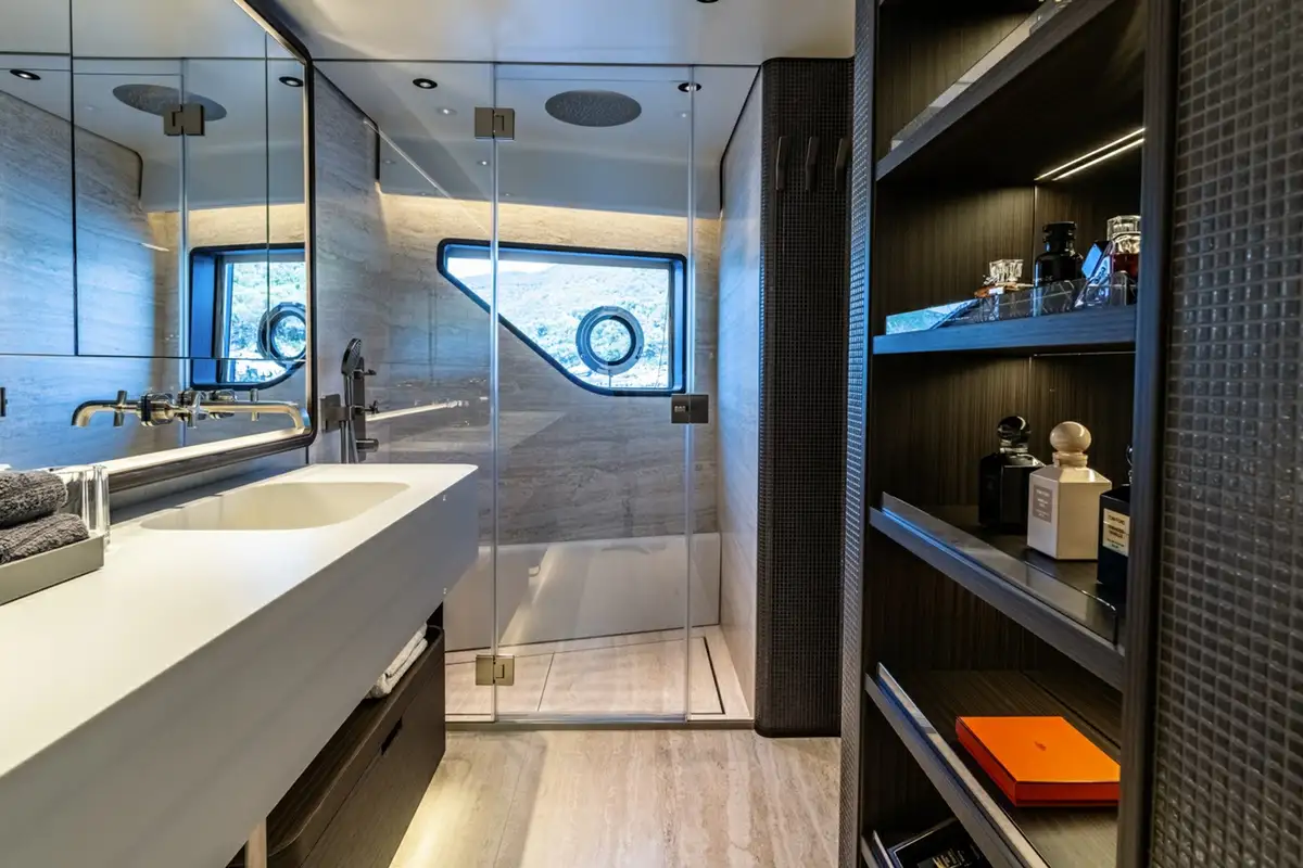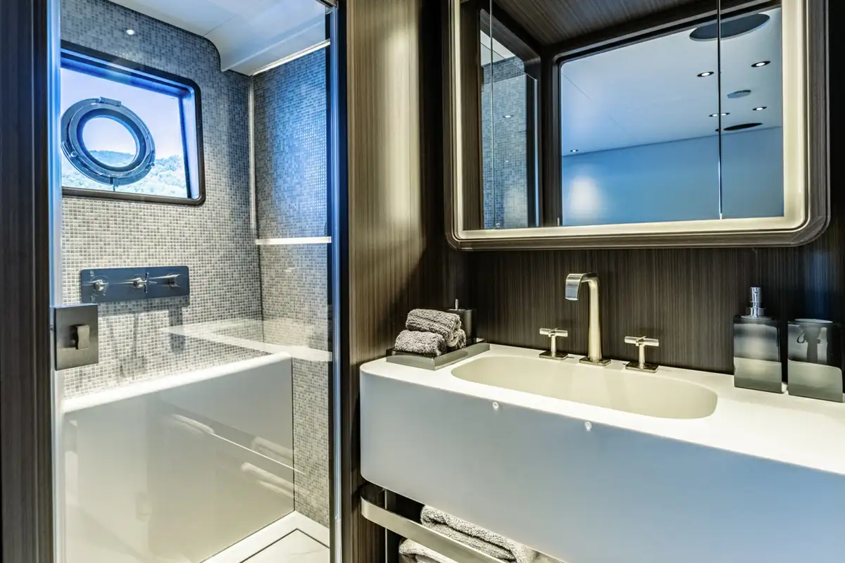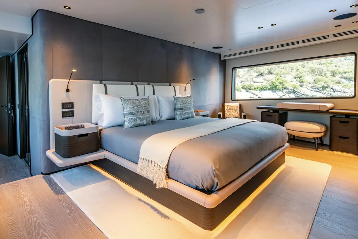 Descending into the lower deck, you'll be greeted by two VIP cabins and two twin cabins, one of which is convertible into a double. Each cabin comes with an en suite bathroom. Dual gyro and fin stabilisers ensure you will sleep in exceptional comfort, with AT ONE'S advanced noise and vibration reduction ensuring quality sound proofing from exterior noise.