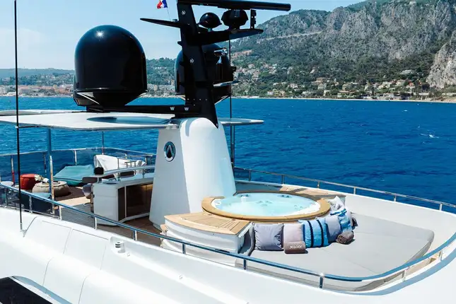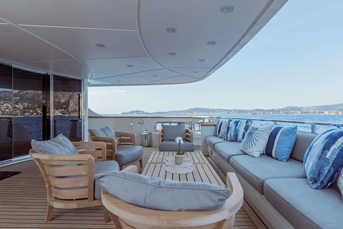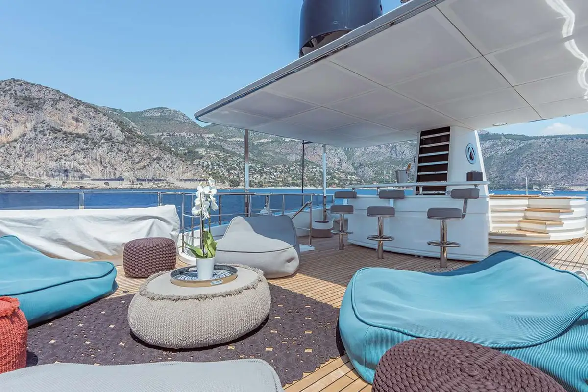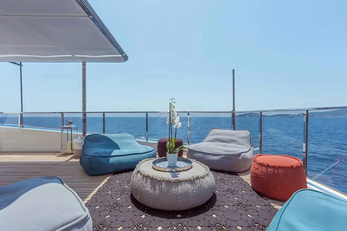 Off the main lounge, the aft deck offers a great-sized lounge area, whilst up on the upper deck, there are informal seating and a dining table for relaxed outdoor eating. The sun deck is home to a jacuzzi and sunpads for the ultimate relaxation. Even more seating and sun pads can be found on the forward deck with Portuguese style seating and padded seating on the bow.
