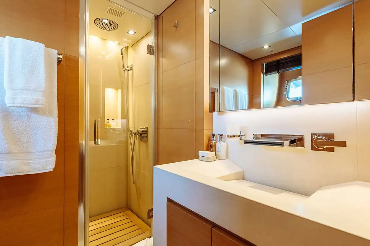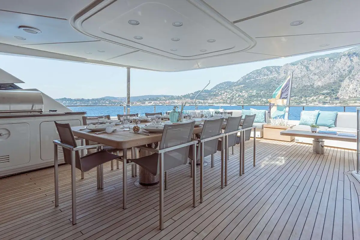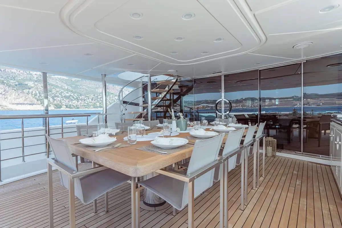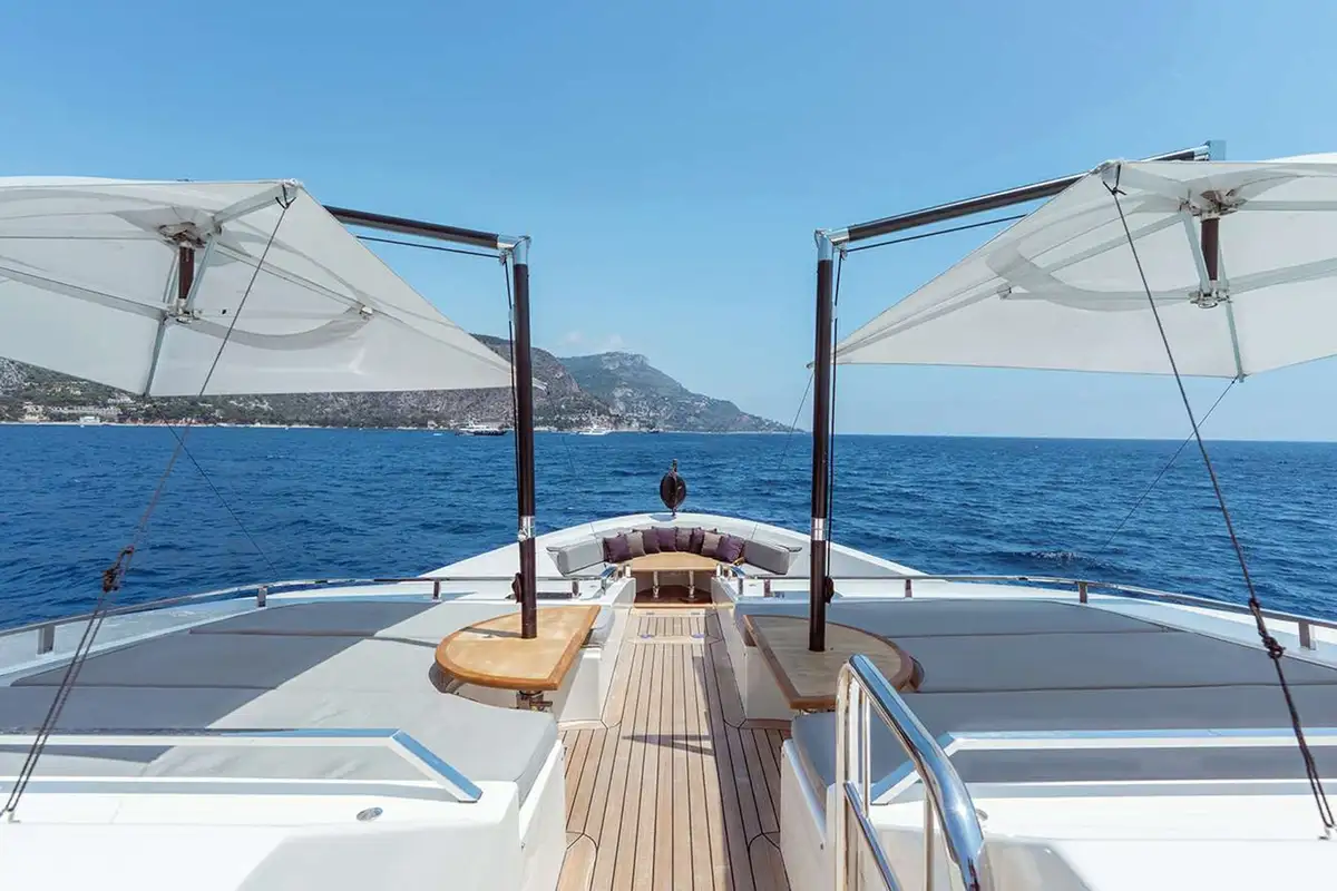 Off the main lounge, the aft deck offers a great-sized lounge area, whilst up on the upper deck, there are informal seating and a dining table for relaxed outdoor eating. The sun deck is home to a jacuzzi and sunpads for the ultimate relaxation. Even more seating and sun pads can be found on the forward deck with Portuguese style seating and padded seating on the bow.