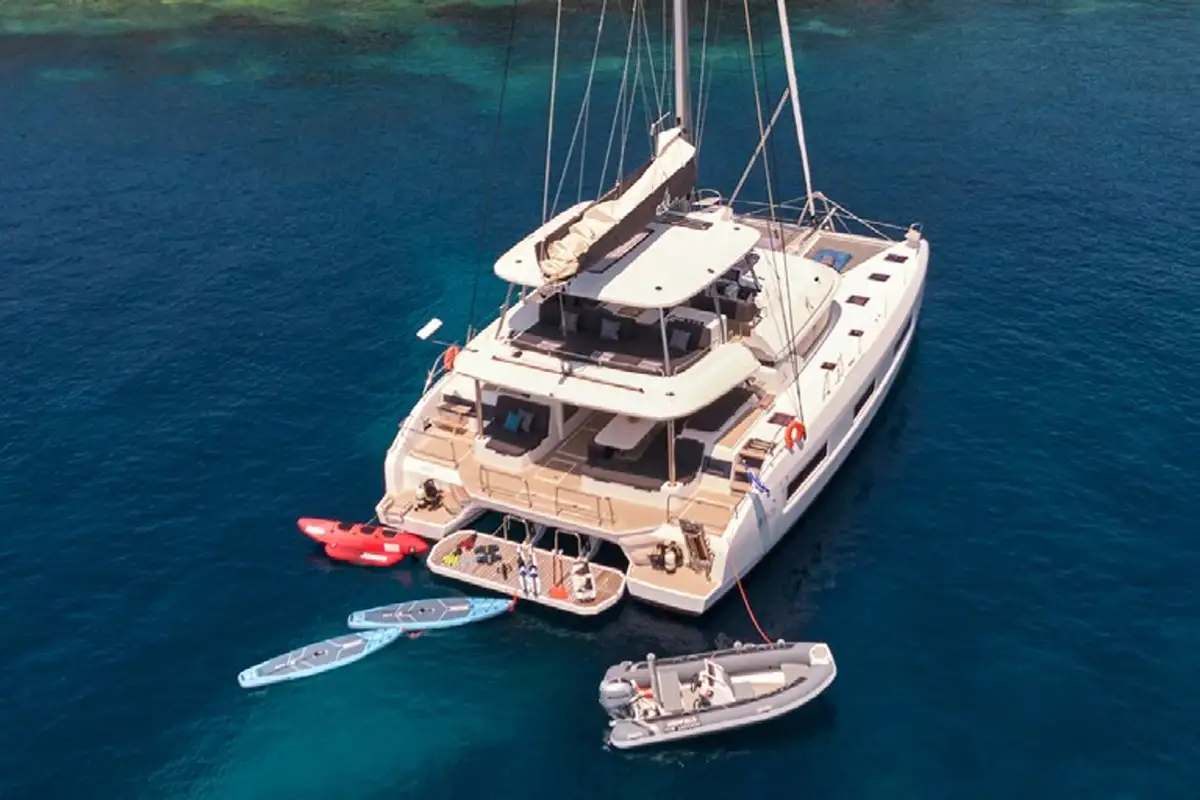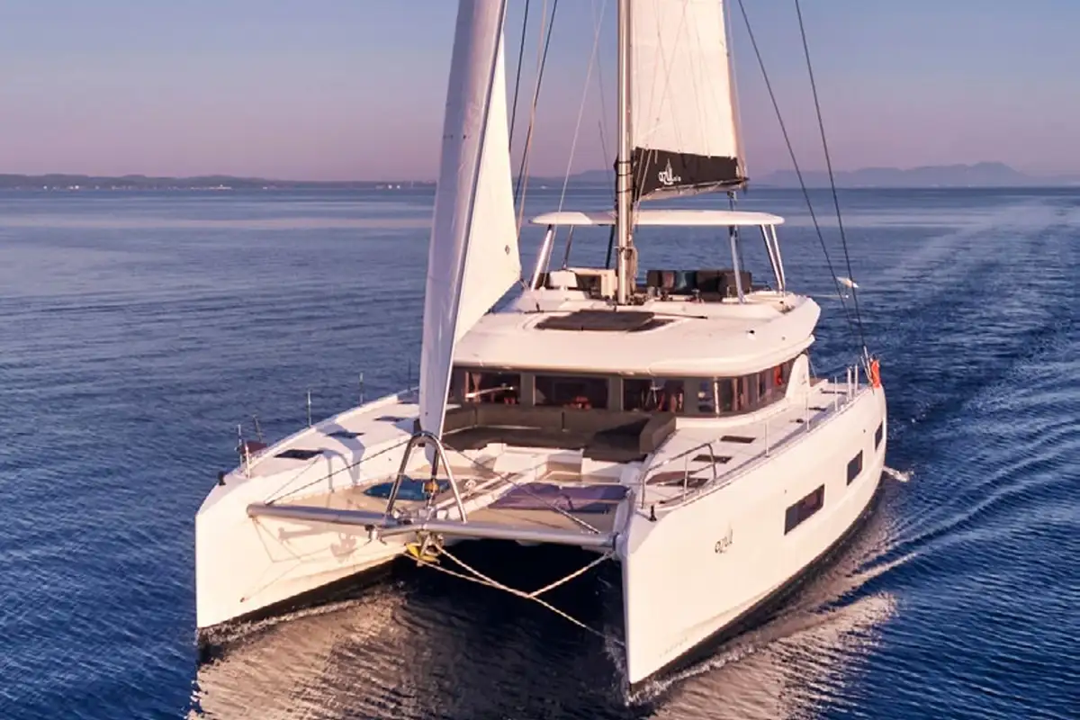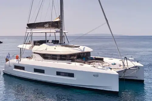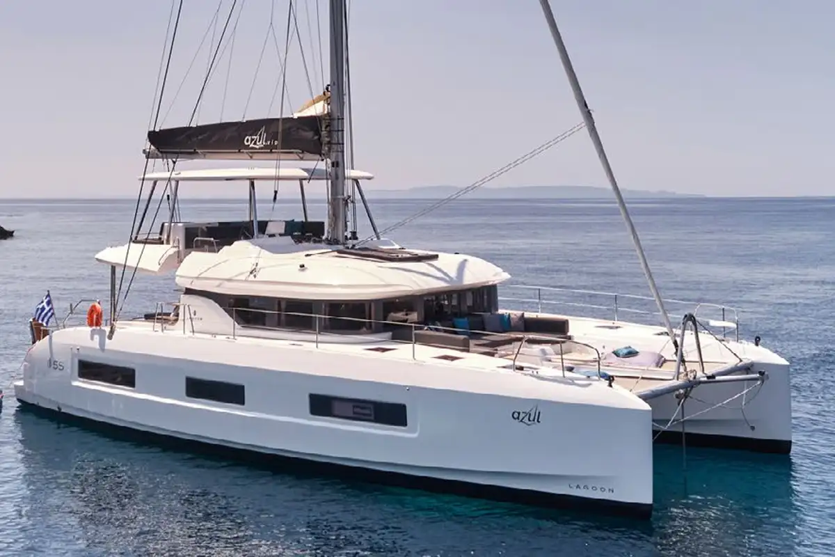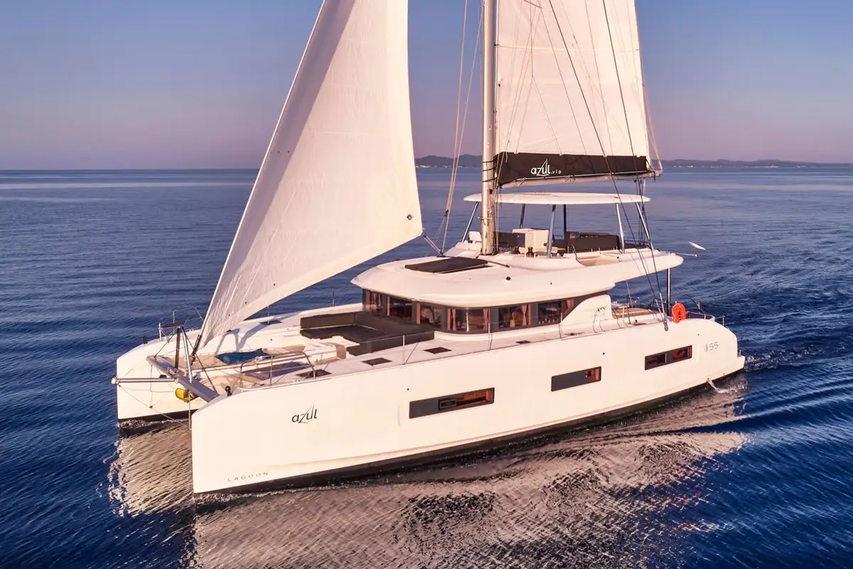 Step onboard AZUL, a 16.6m (55ft) sailing catamaran where you can enjoy her expansive deck space and the superior stability of the catamaran design. Unwind with leisurely afternoons cruising under sail and starlit evenings at anchor. AZUL offers your party four gorgeous en suite double guest suites, which are spread across two hulls in all four corners for greater privacy.