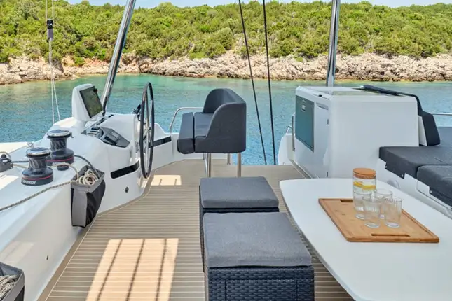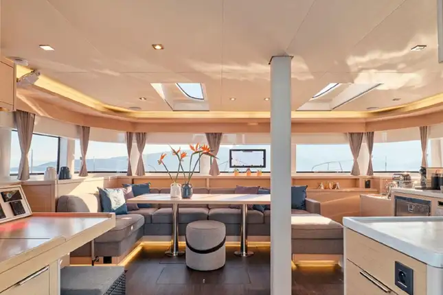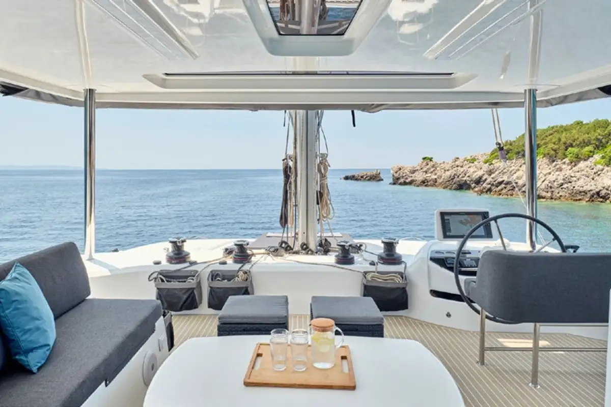 Back on board, the main lounge benefits from full 360-degree views through large picture windows. You can use this multi-purpose space for dining or relaxing by day or night. The country kitchen arrangement allows you and your guests to watch AZUL’s professional chef in action, whetting your appetite before enjoying their culinary creations either in the lounge or in the open air of the cockpit.