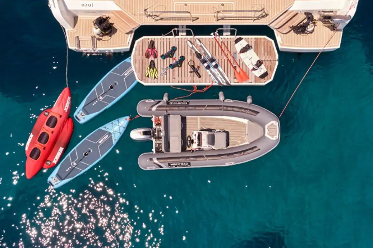 In the cockpit below, there is a shaded al fresco dining area, a wet bar and rear-facing seating that’s perfect for observing your friends making the most of the watersports equipment that AZUL has on offer. With Seascooters, SUPs and a SeaBob, as well as a full complement of snorkelling equipment, hours of fun can be enjoyed in the waters around this luxury catamaran. Experienced divers can request dive kits, tanks and a dive compressor or bring their own scuba equipment. There is also a collection of boards, skis and towable inflatables that are suitable for all ages and abilities.