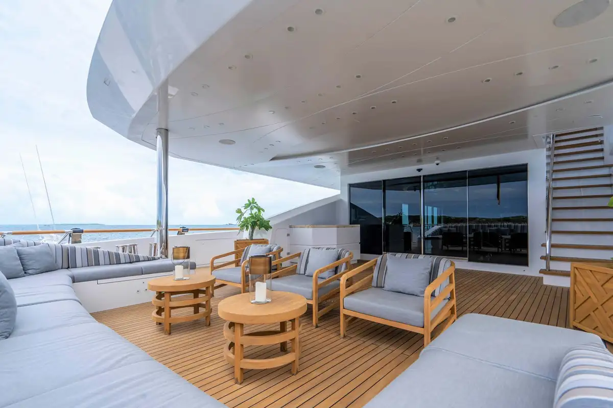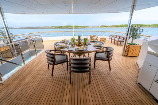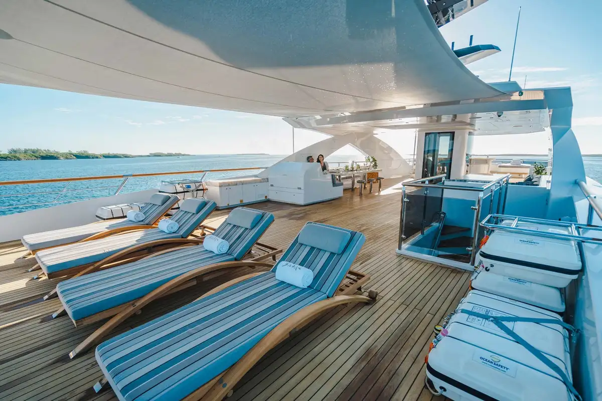 Enjoy a delicious lunch on the upper deck aft, shaded from the midday heat while you take in superb views of the surroundings from your elevated position. Then ascend to the sun deck where you can lounge in style on the selection of sun loungers and sun pads, or enjoy a refreshing dip in the waterfall jacuzzi while chatting with friends sitting at the nearby bar.