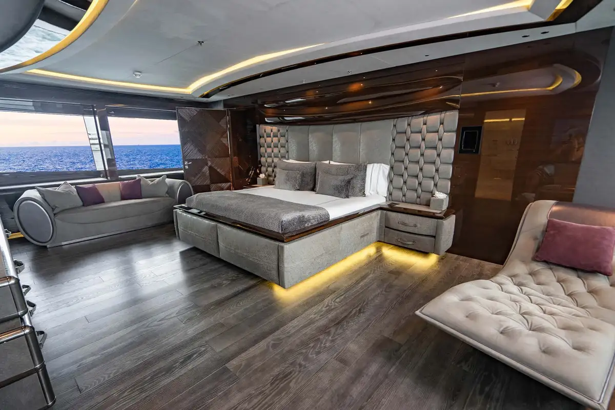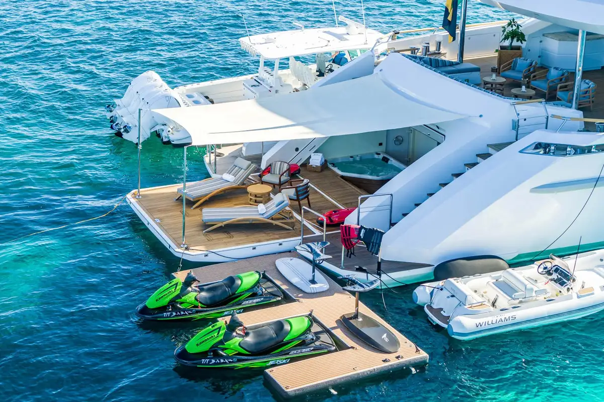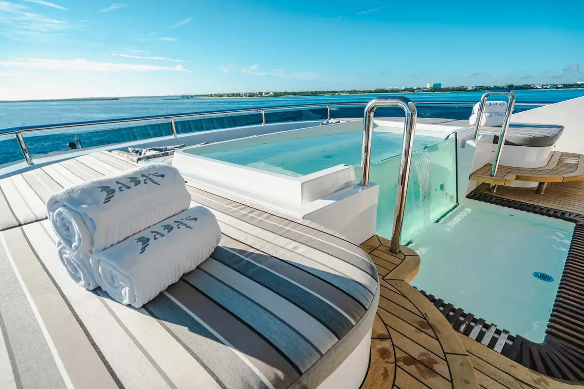 A charter on board the glamorous BABA’S will take you from fun in the sun by day to chic entertainment by night. Enjoy her expansive exterior decks, two jacuzzis, a gym by the water and choice of dining locations, while the interior’s refined decor adapts to your mood, from relaxation to celebration.