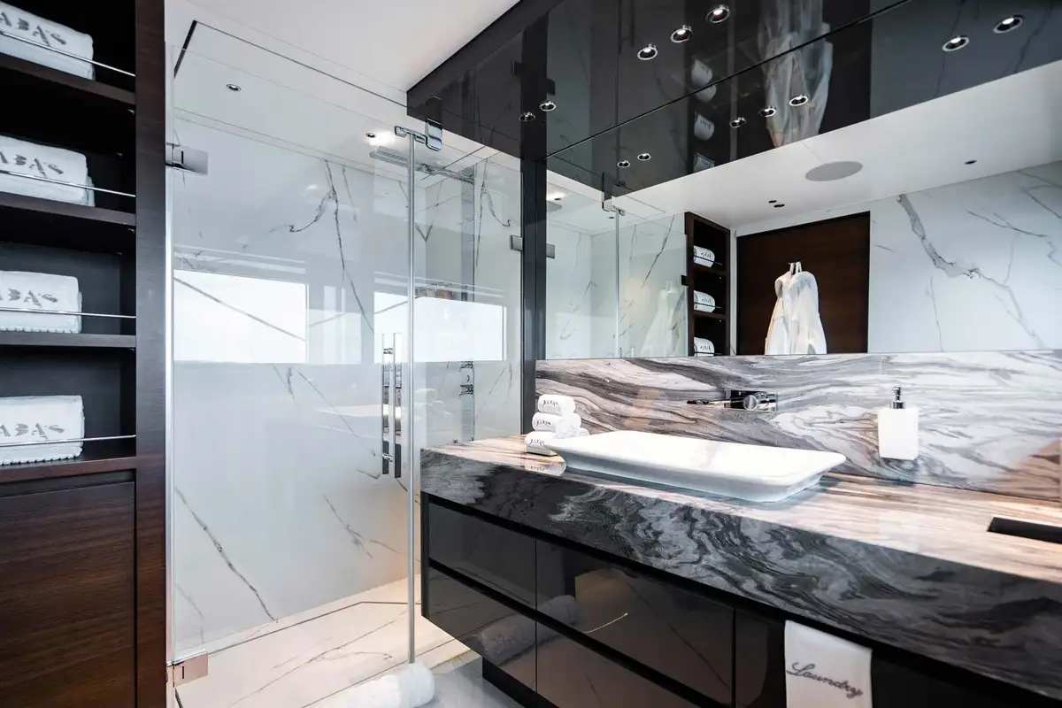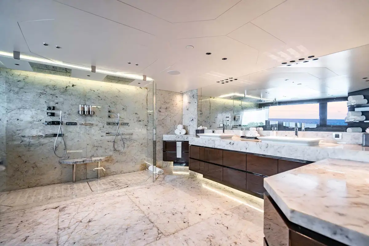 Take the elevator down to your cabin to change for dinner. BABA’S accommodation sleeps up to 12 guests in six cabins, while zero speed stabilisers assure total comfort at anchor. Her full beam master suite is a sanctuary of elegant calm and there is a VIP suite on the upper deck, while the lower deck features four double cabins and a children’s games room.