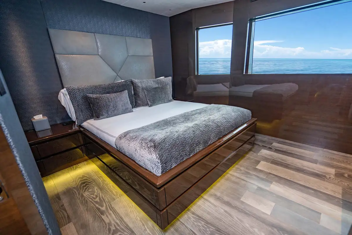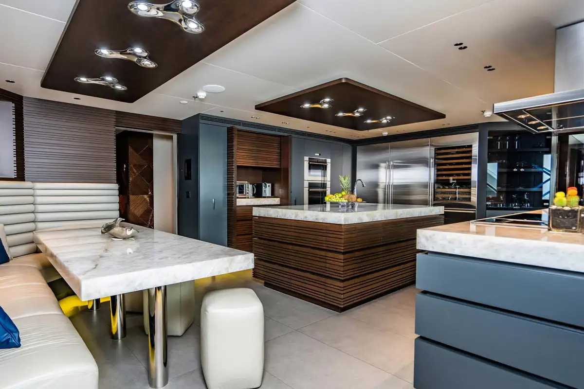 If you are an early riser, make your way from the main deck master suite to the nearby galley with guest seating to enjoy a coffee and fresh pastry while catching up on the morning’s news. As everyone convenes for breakfast on the upper deck aft, join them to plan the day’s activities with the captain. Newly launched in 2019, BABA’S sophisticated interior features rich, dark woods, mirror mosaics and plush furnishings that are illuminated by large windows inviting in the seascape views.