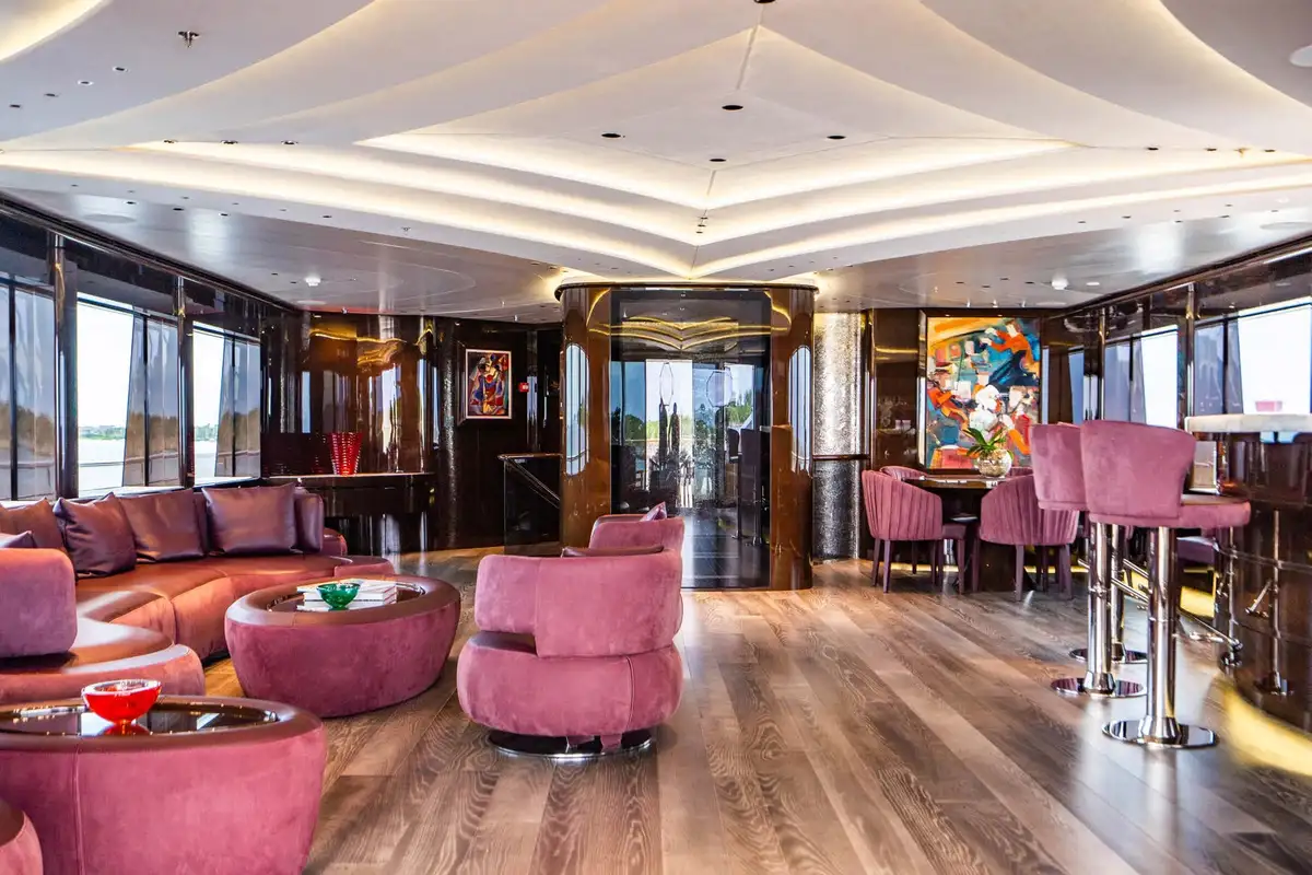 Evening cocktails are served on the main deck aft looking out over the beautiful bay, then you make your way to the creatively decorated table of the formal dining area for an exquisite tasting menu dinner with wine pairings. Round off your remarkable day with a nightcap in the adjacent lounge, or head up to the sky lounge with its bar, richly hued leather seating and dramatic ceiling, where the fun continues well into the night.