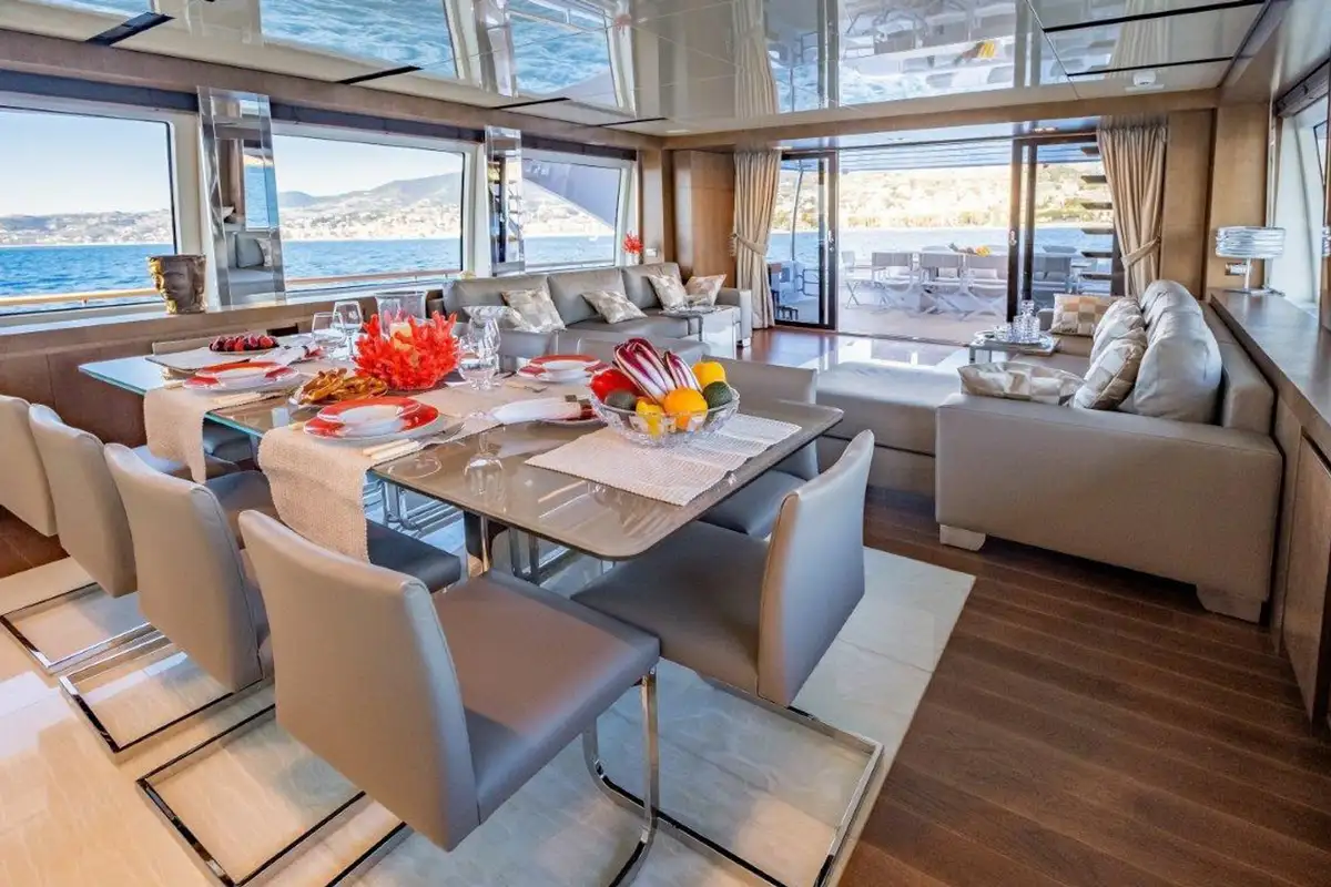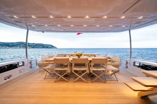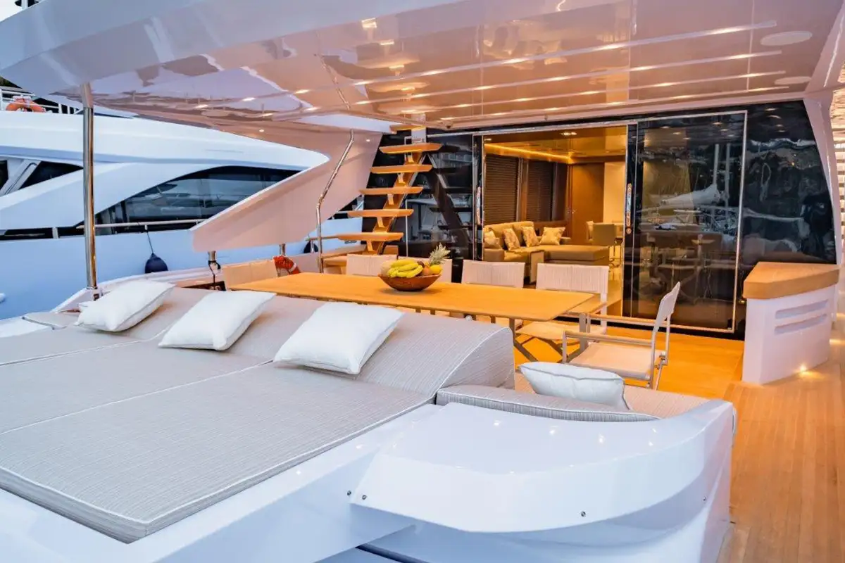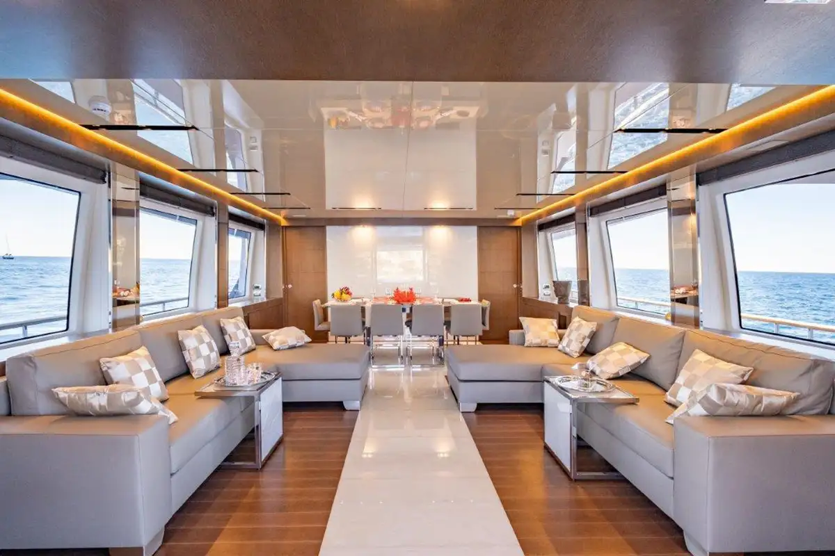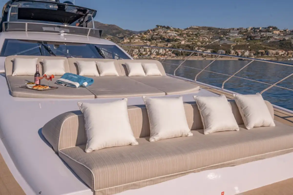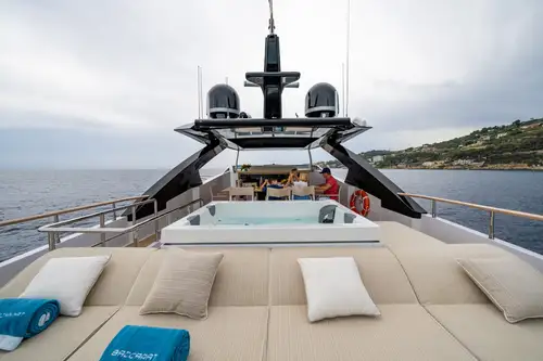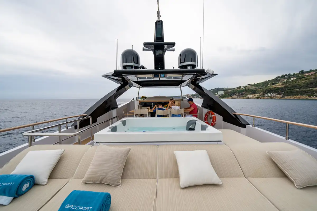 Every detail on board BACCARAT is crafted with elegance and ease in mind. Her thoughtfully designed outdoor spaces invite relaxation, whether you’re unwinding in the jacuzzi, soaking up the sun on the foredeck loungers, or enjoying a slow lunch on the aft deck. Inside, expect chic interiors, modern amenities, and a light, open feel throughout.