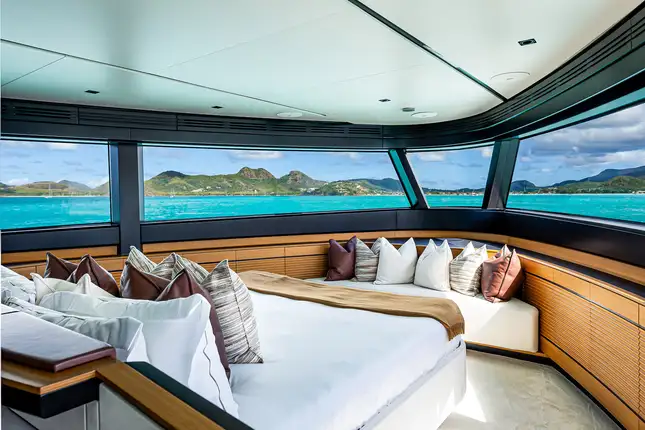 The beach club is a standout feature. Fold-down bulwarks create a sprawling terrace, blurring the line between yacht and sea. Whether you're jumping in for a swim or lounging with a cocktail, the connection to the ocean is ever-present.