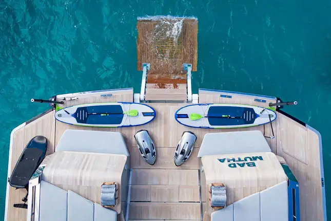 Inside, BAD MUTHA continues to impress. The main deck’s open-plan layout is elegant and sociable, with natural light pouring in through panoramic windows. Elsewhere, the upper deck’s private lounge offers a stylish indoor escape perfect for movies and quiet drinks.
