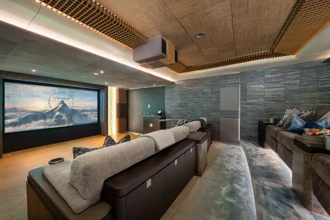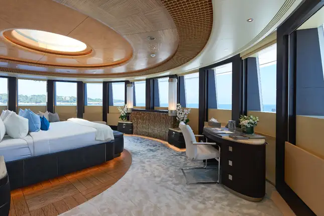 The extensive accommodation on board comprises a unique split owner's suite with stunning ocean vistas and an impressive double height study complete with port and starboard folding balconies and double height glass sliding doors. There is a double guest cabin on the upper deck, four guest cabins and a convertible full beam VIP cabin located on the main deck. Other standout features include a remarkable teak and steel sculpture that envelops the large guest elevator, a spectacular aquarium made to mirror an aquatic reef, an outdoor cinema on the sun deck and a huge lazarette ideal for a watersports enthusiast.