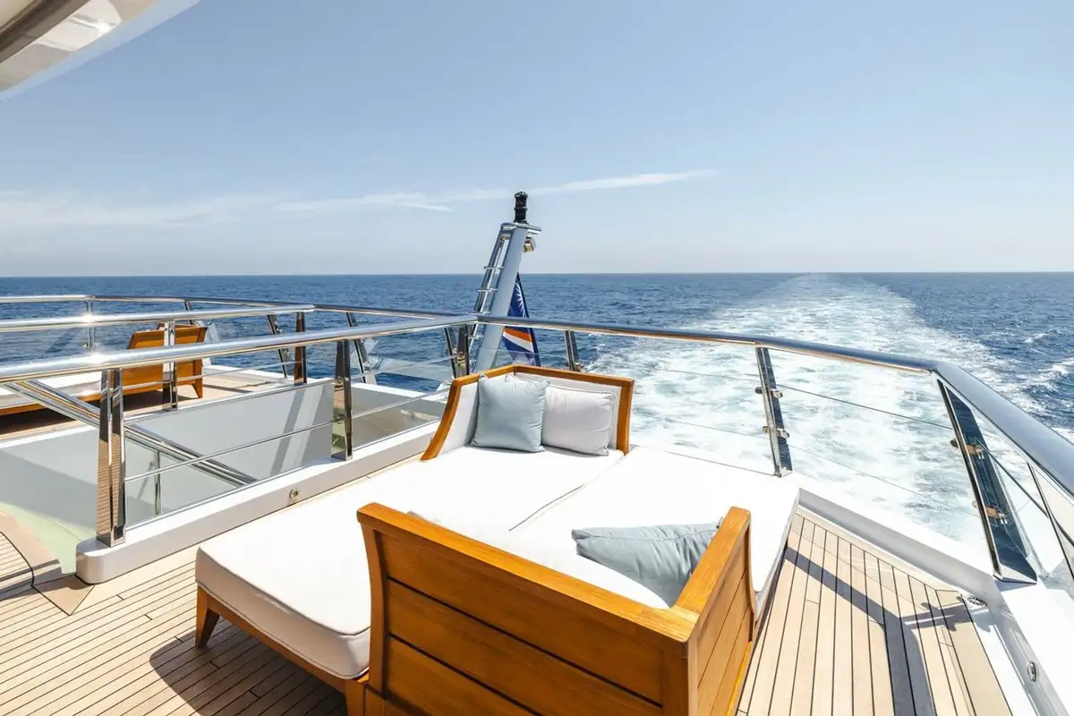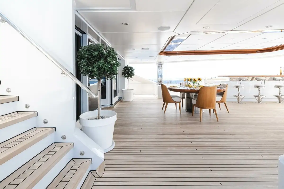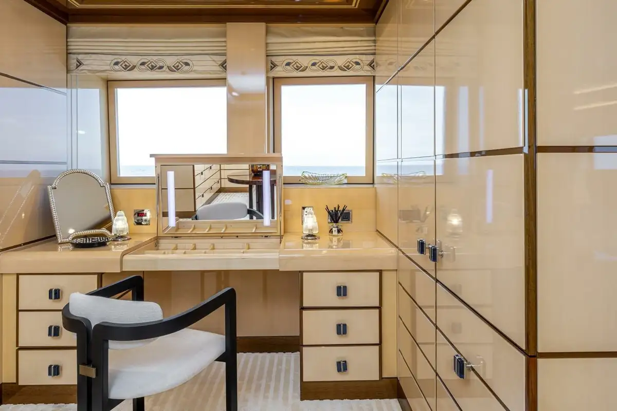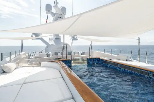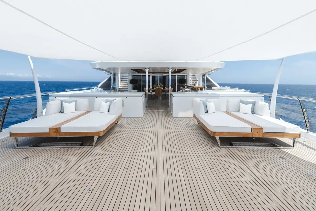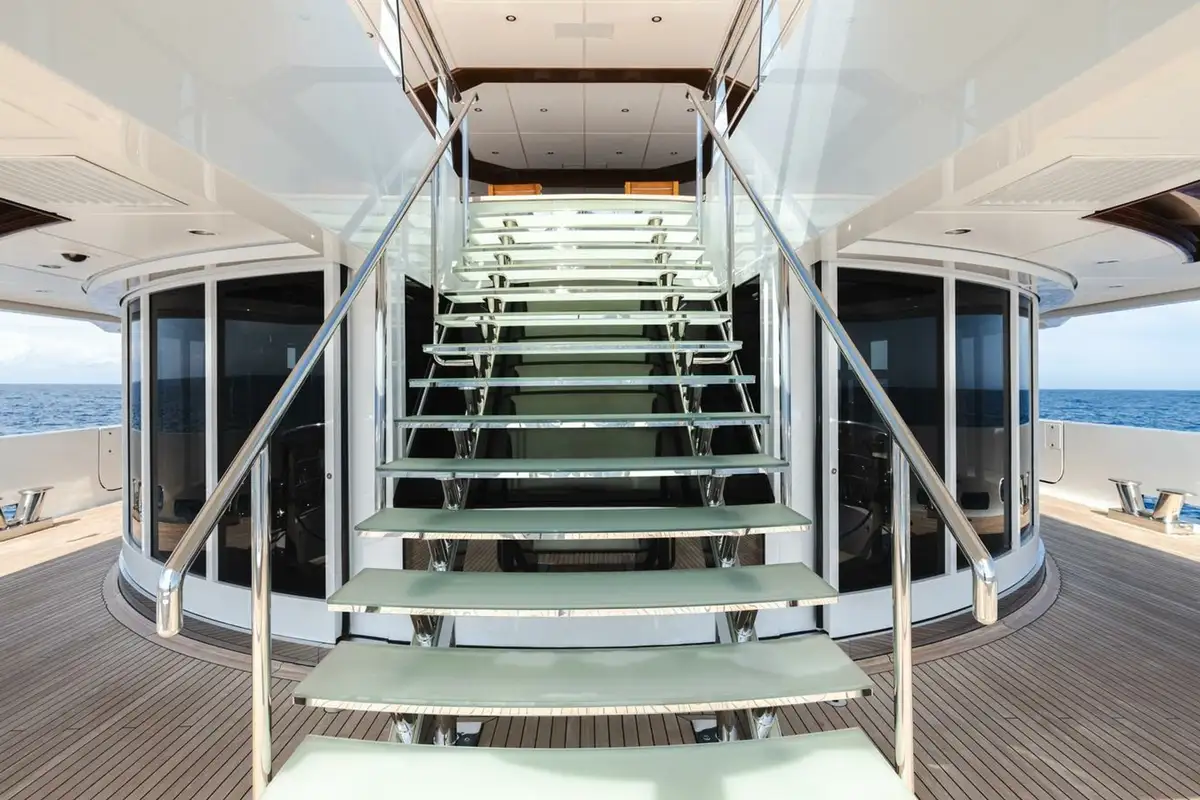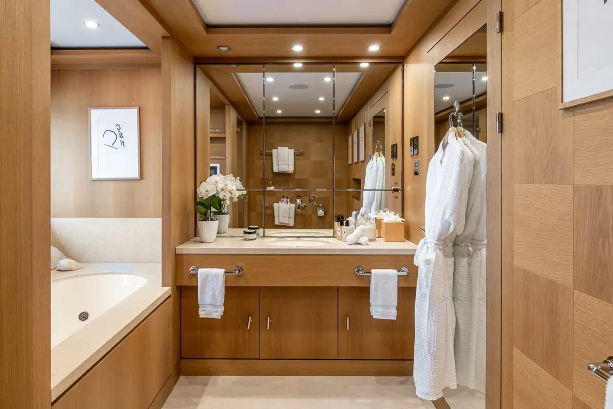 The upper deck has a VIP cabin, with en suite. A central staircase runs to the main deck aft where internal steps either side lead down to the swim platform, shower, dayhead and dressing room. The main deck is also walkaround and guests moving forward pass the boat deck where two 9.5m (31.2ft) tenders are launched on horizontal davits. There is also a full-beam tender and toy garage aft on the lower deck.