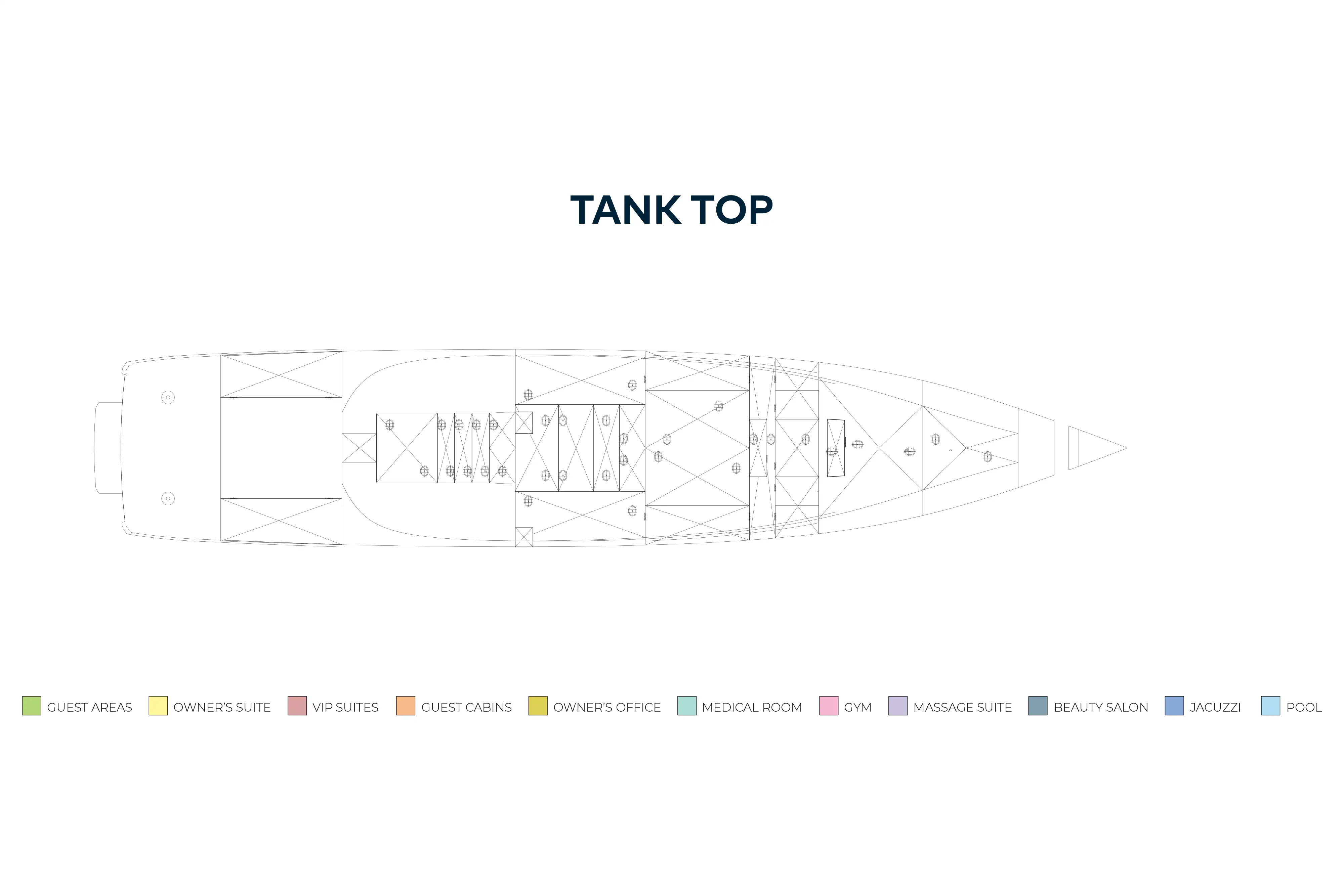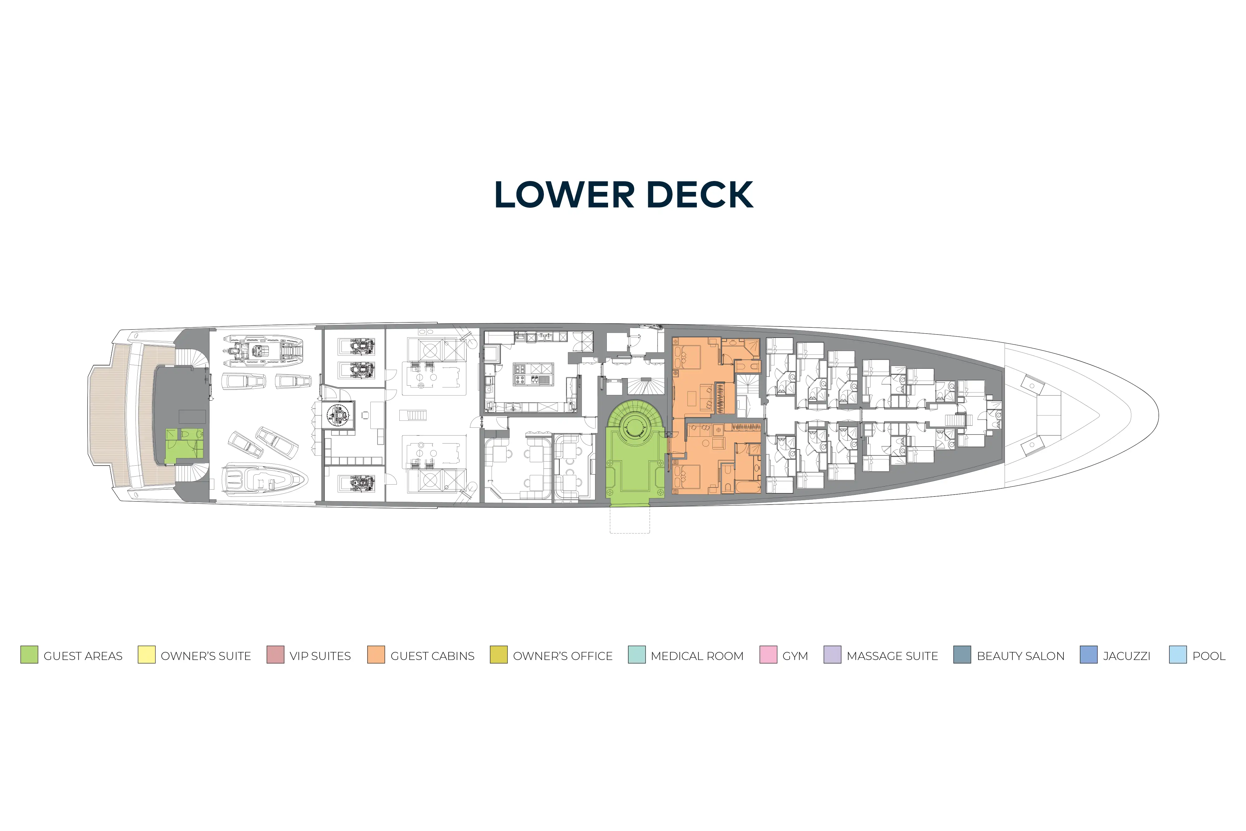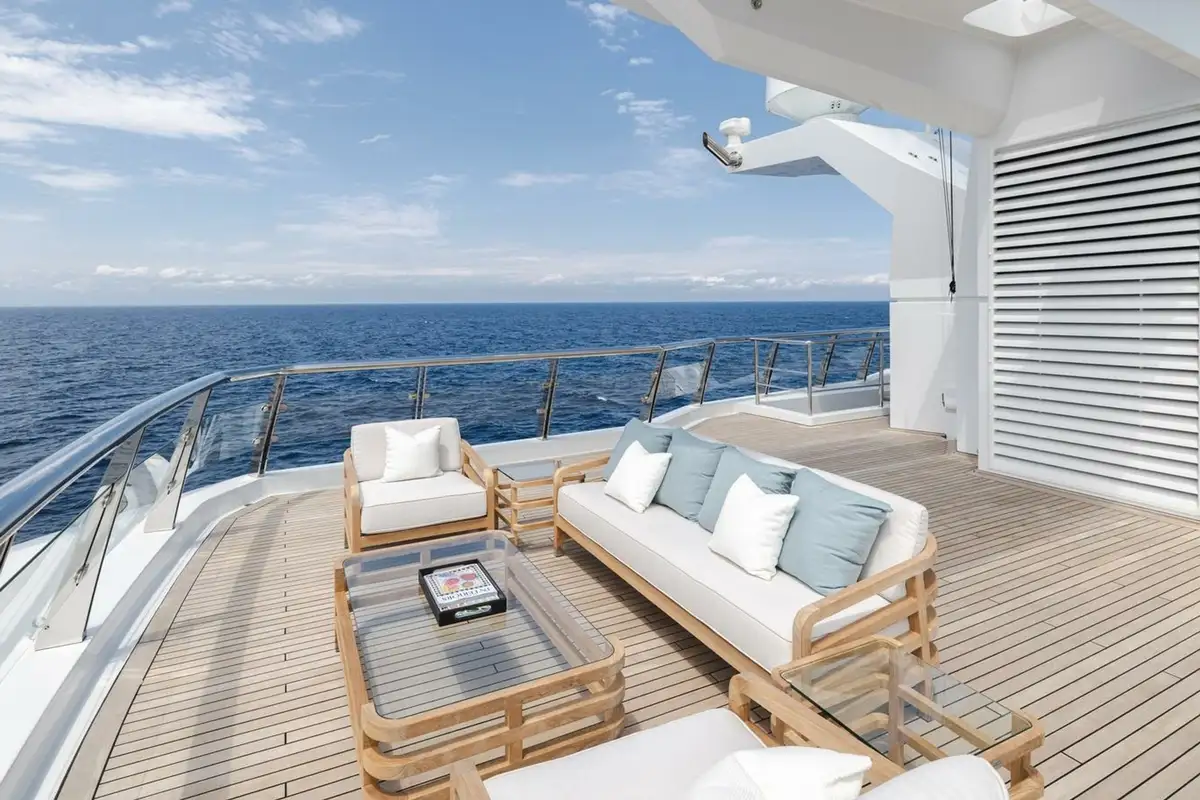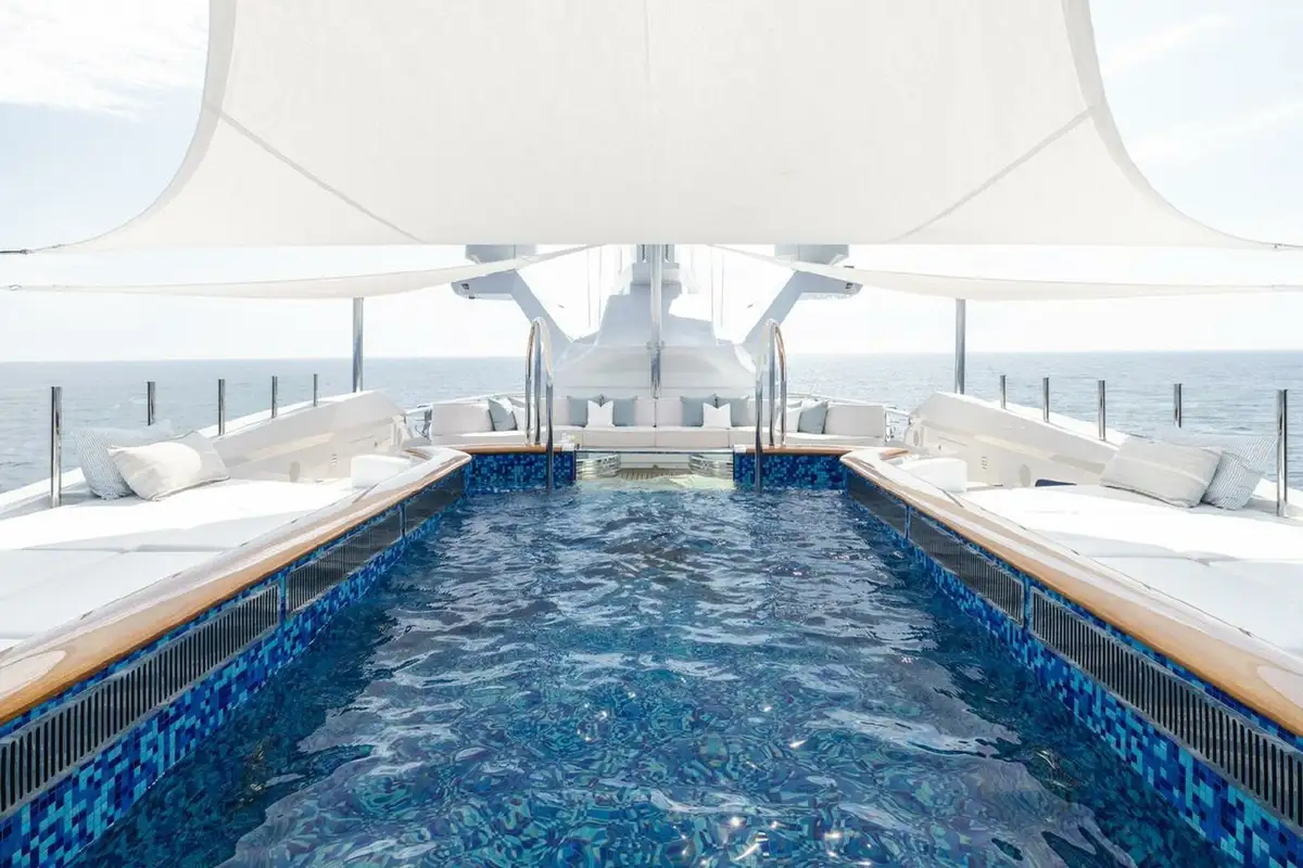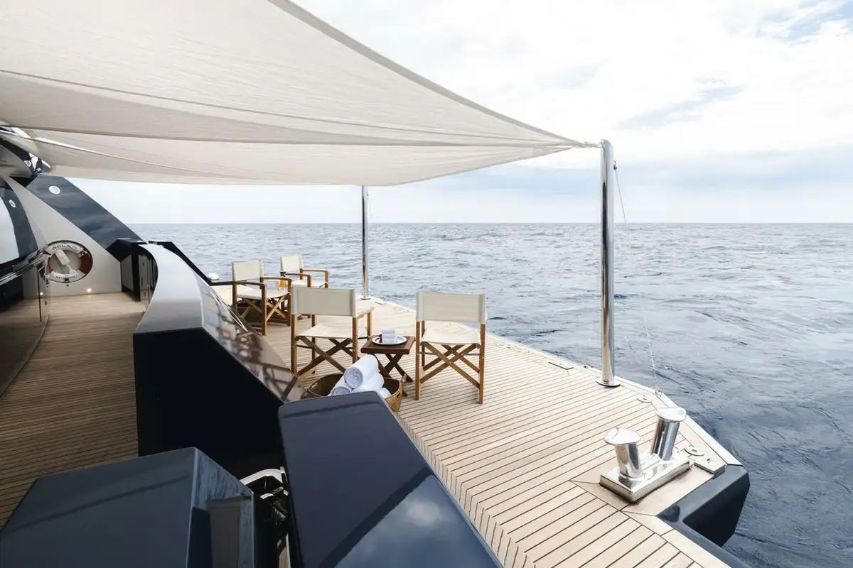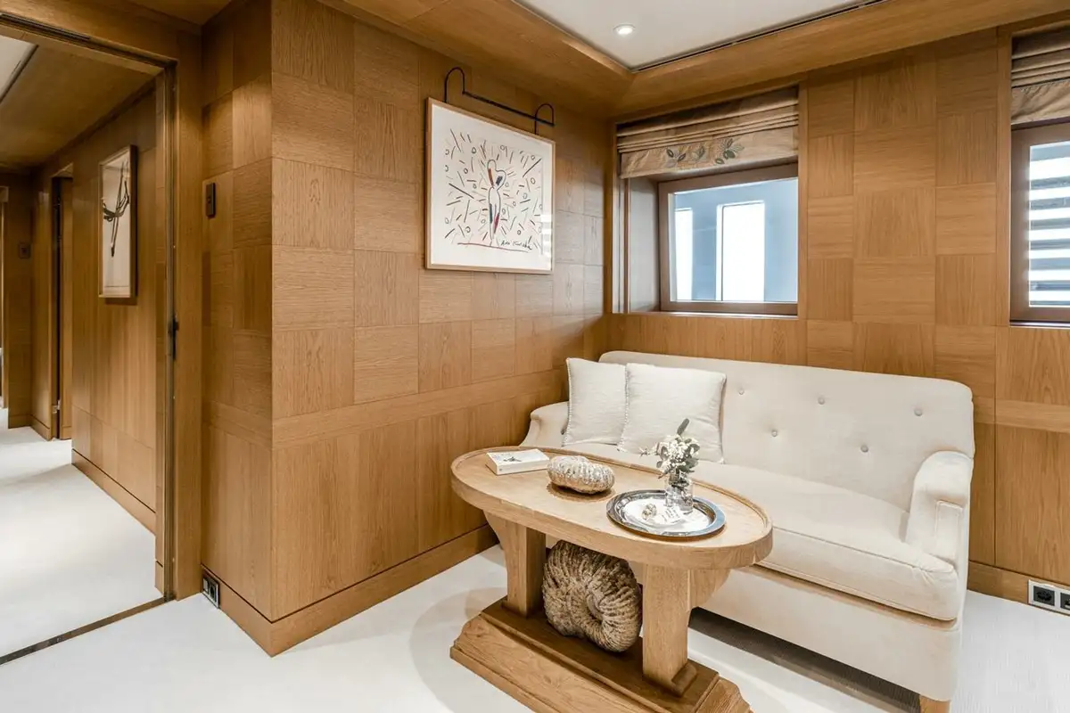 The upper deck has a VIP cabin, with en suite. A central staircase runs to the main deck aft where internal steps either side lead down to the swim platform, shower, dayhead and dressing room. The main deck is also walkaround and guests moving forward pass the boat deck where two 9.5m (31.2ft) tenders are launched on horizontal davits. There is also a full-beam tender and toy garage aft on the lower deck.