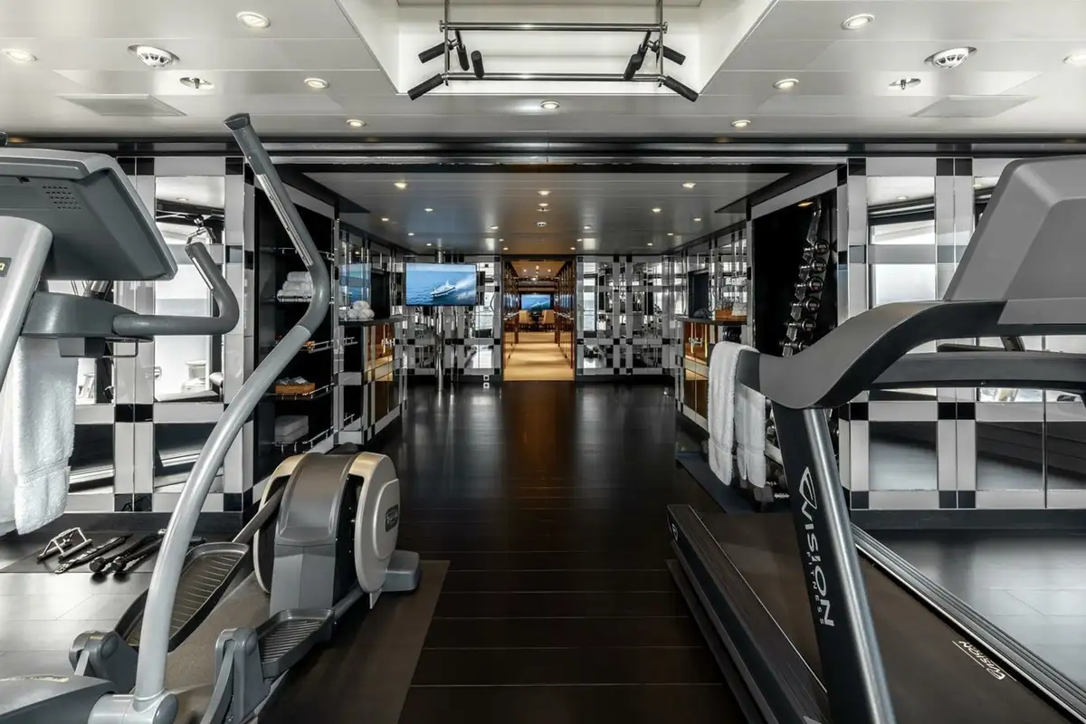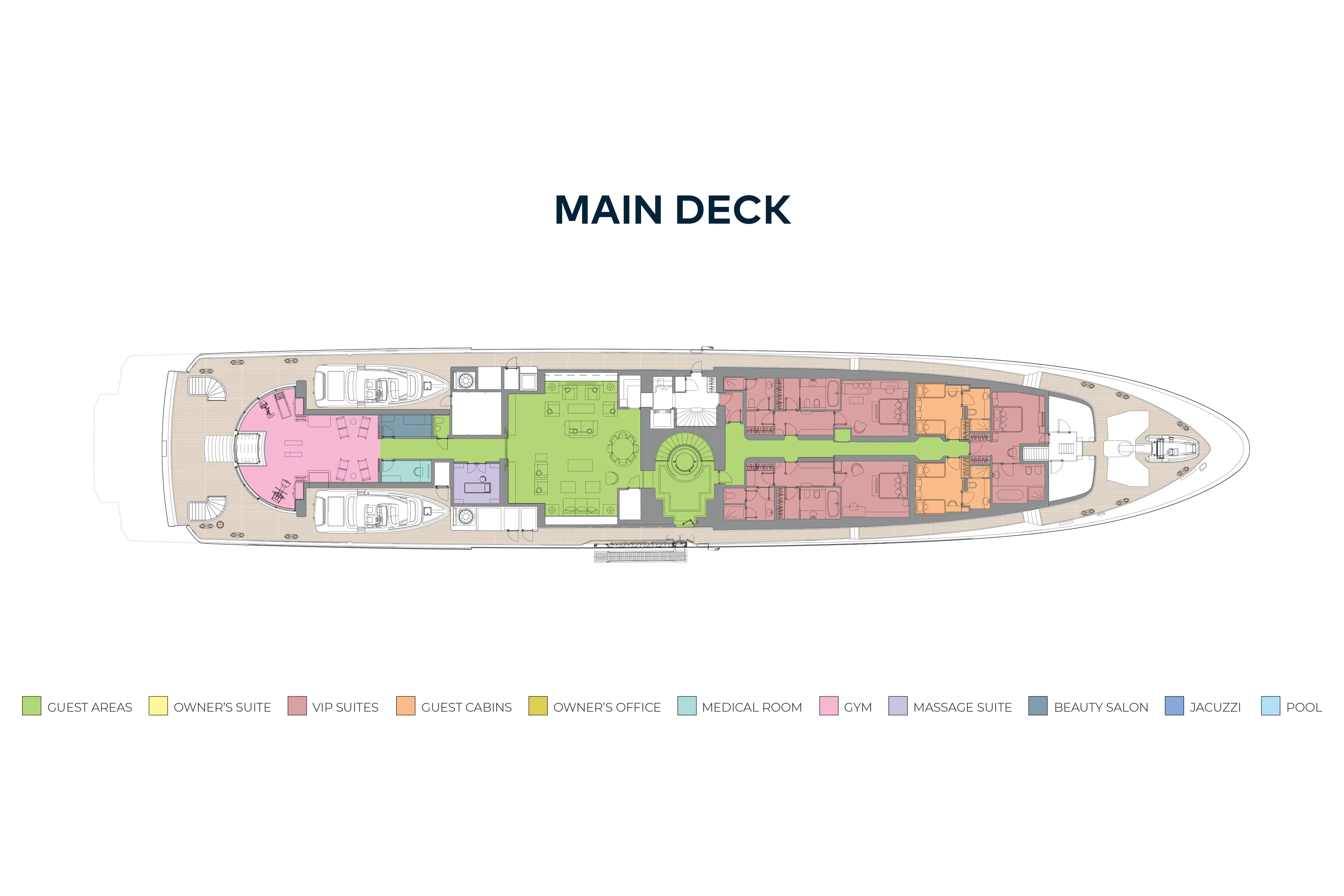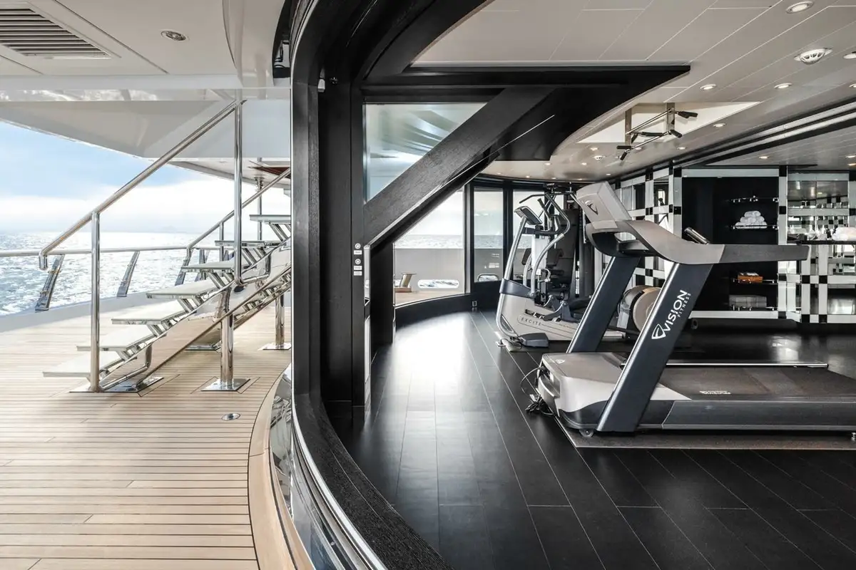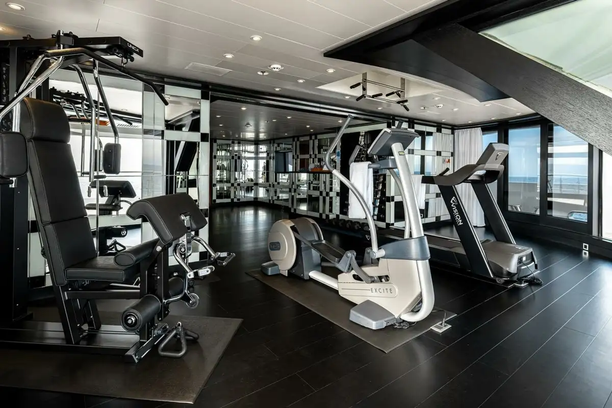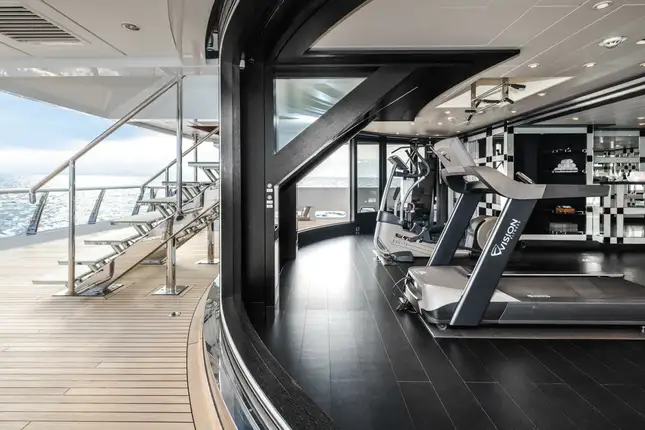 On the main deck there is a wellness spa featuring a gym with spectacular views aft through a semi-circle of sliding glass doors, buffet and bar, medical room, beauty salon, massage room and bathroom. An enormous main deck lounge features a variety of seating areas and doubles as a cinema with drop-down projector.