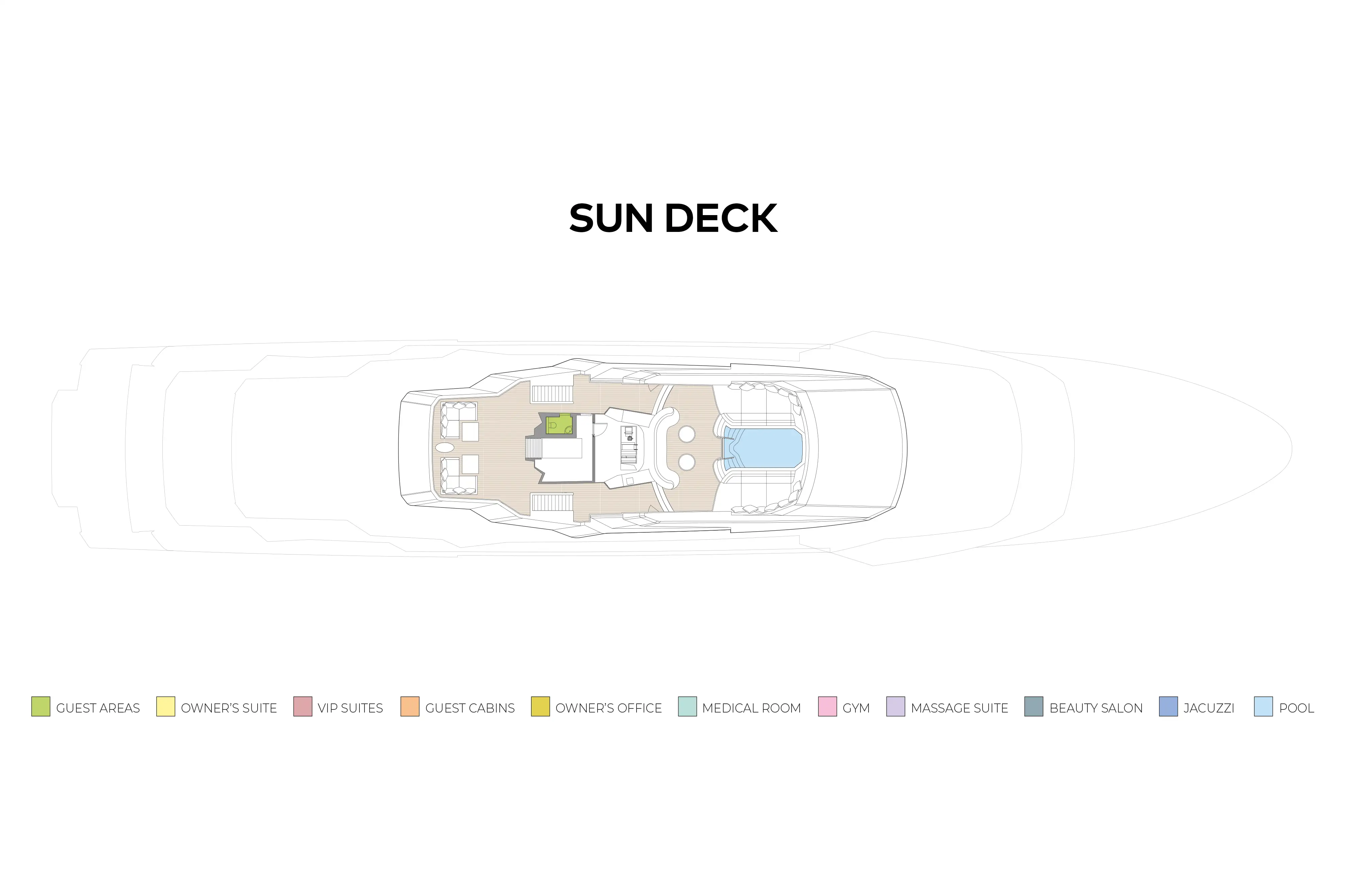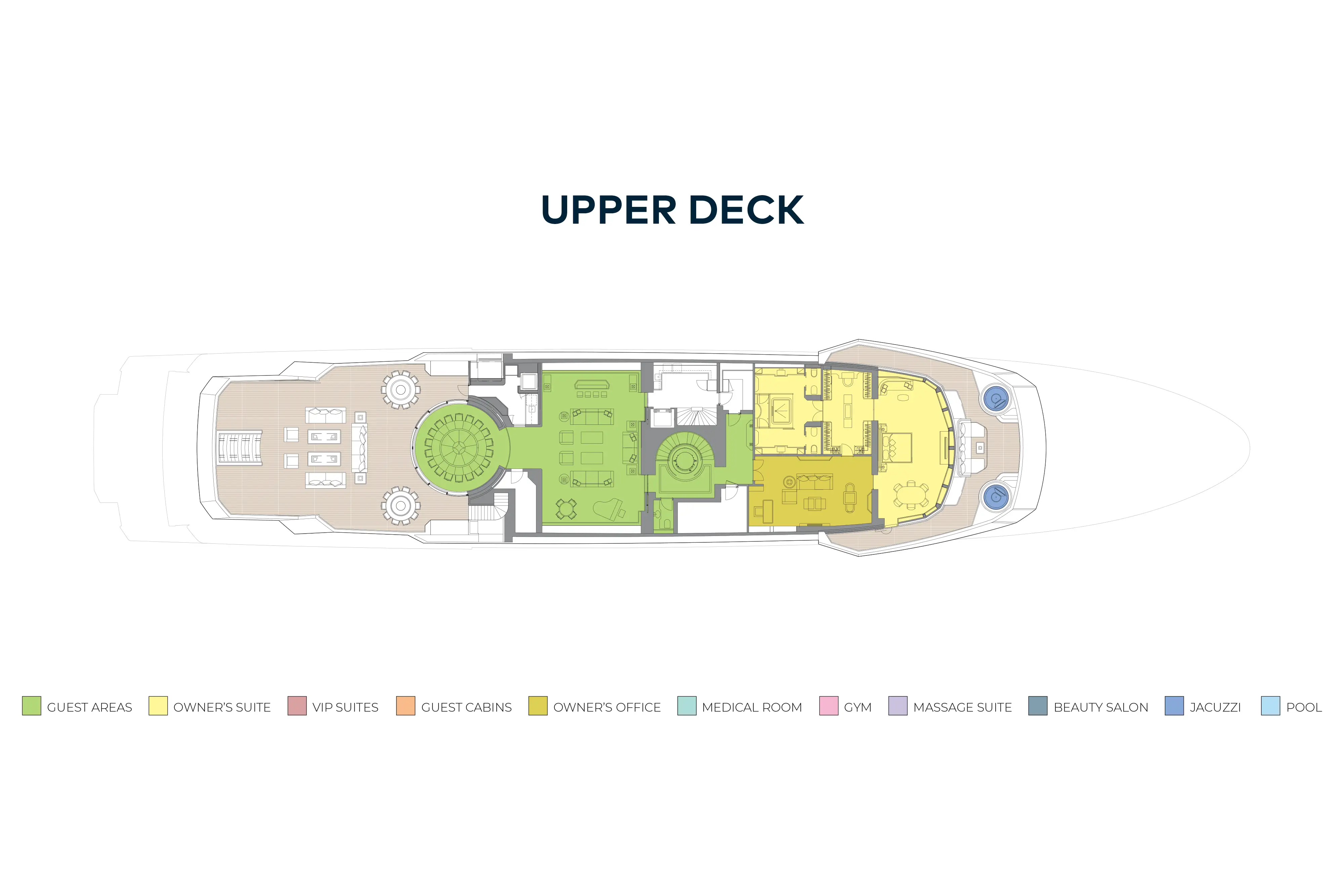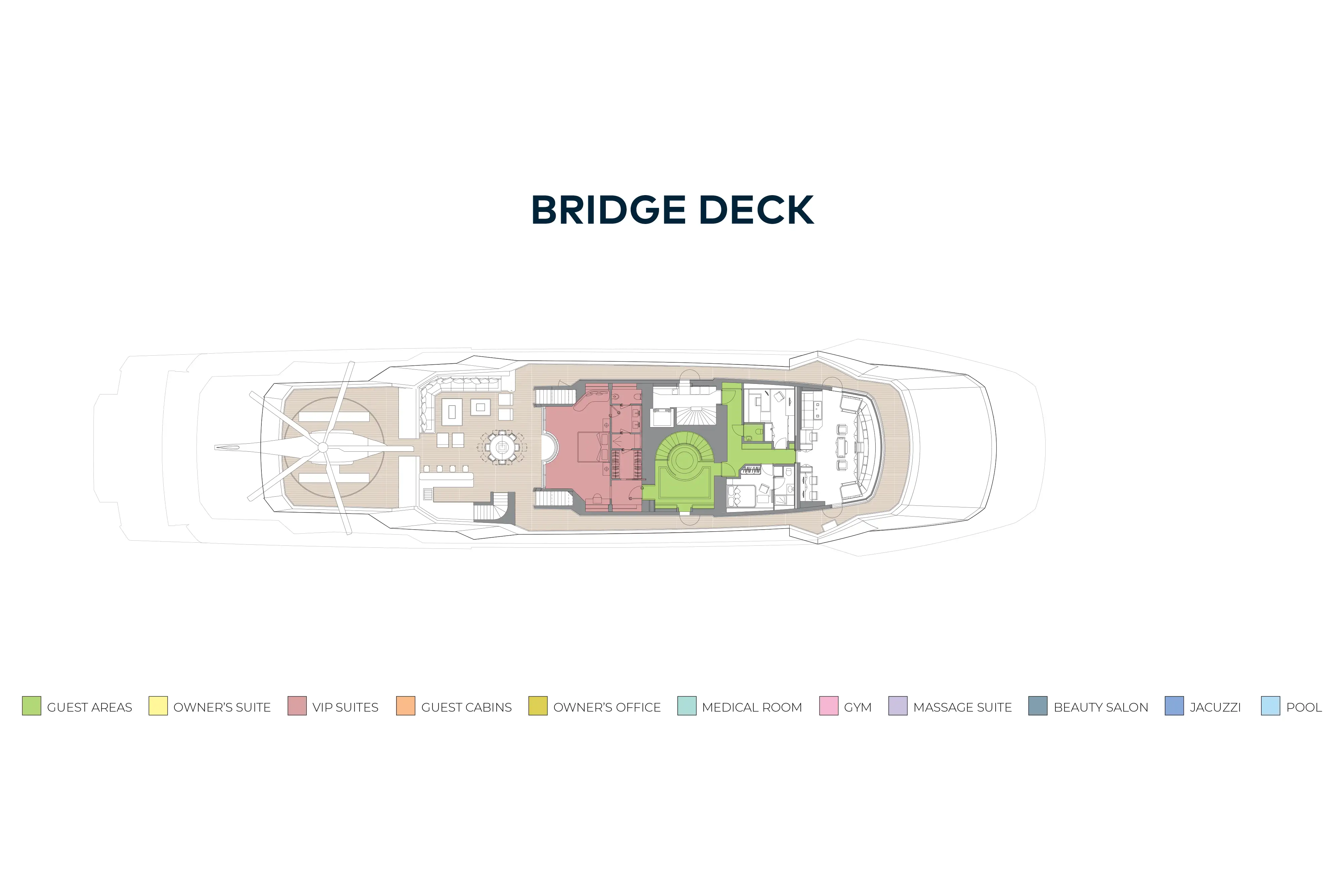 On the main deck there is a wellness spa featuring a gym with spectacular views aft through a semi-circle of sliding glass doors, buffet and bar, medical room, beauty salon, massage room and bathroom. An enormous main deck lounge features a variety of seating areas and doubles as a cinema with drop-down projector.