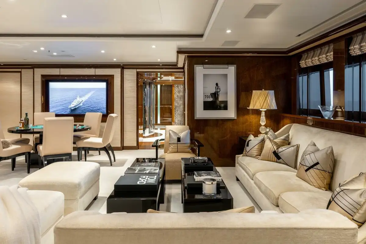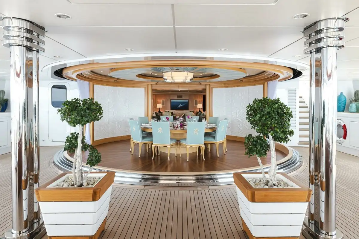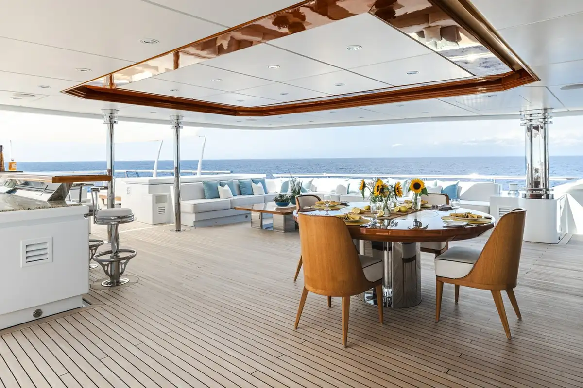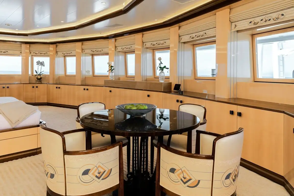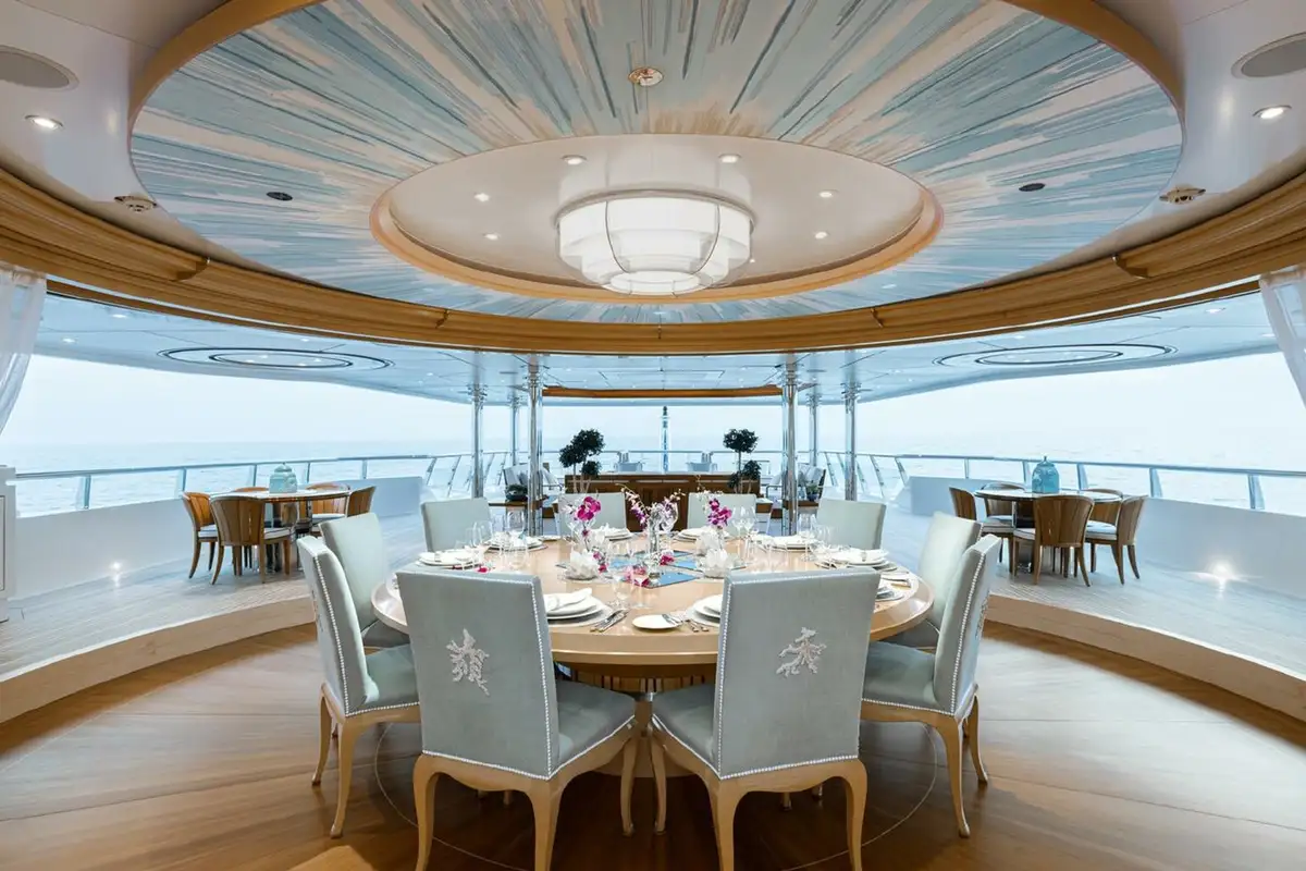 The bridge deck sky lounge has light wood panelling with marquetry and relaxed sofa seating. The upper deck is an entertainment space with convivial lounge seating and a piano in the lounge and a circular dining table for 20 guests with stunning views through a semi-circle of sliding glass doors, opening onto the upper deck aft.