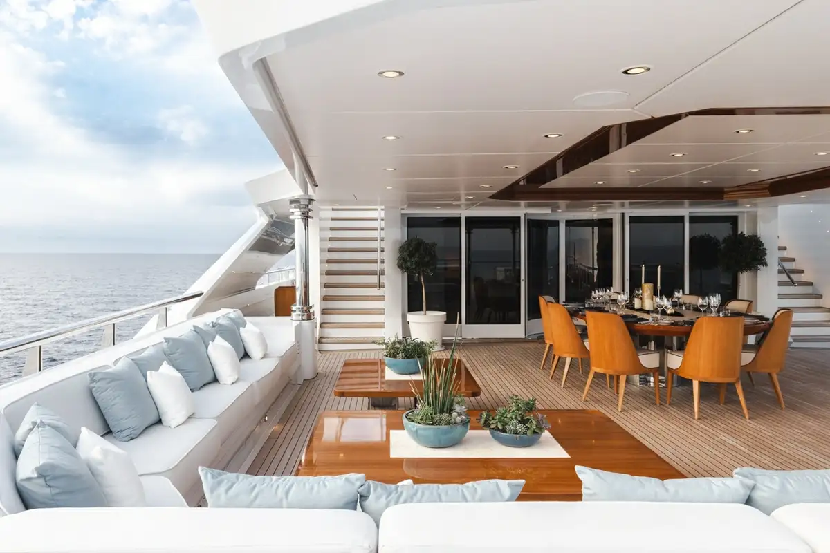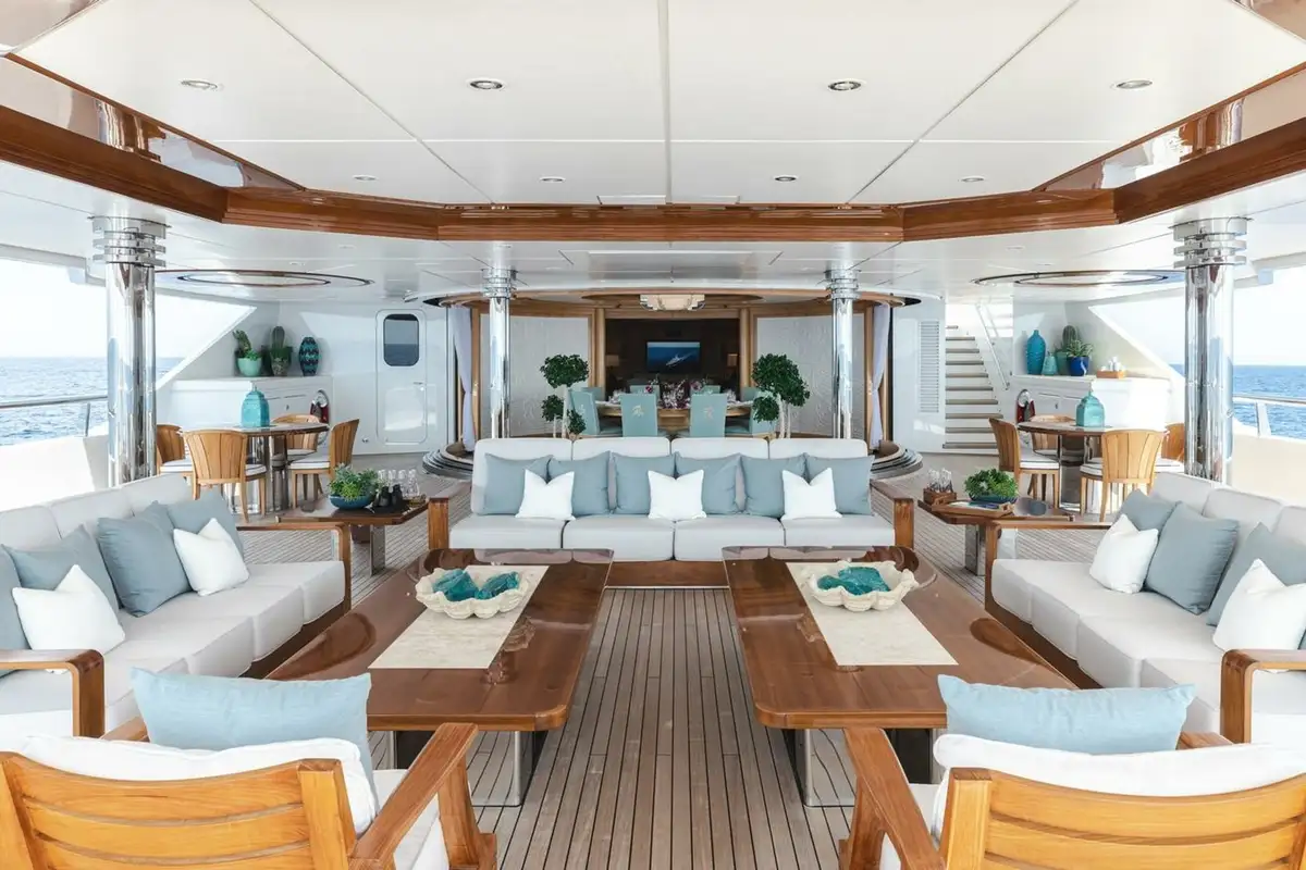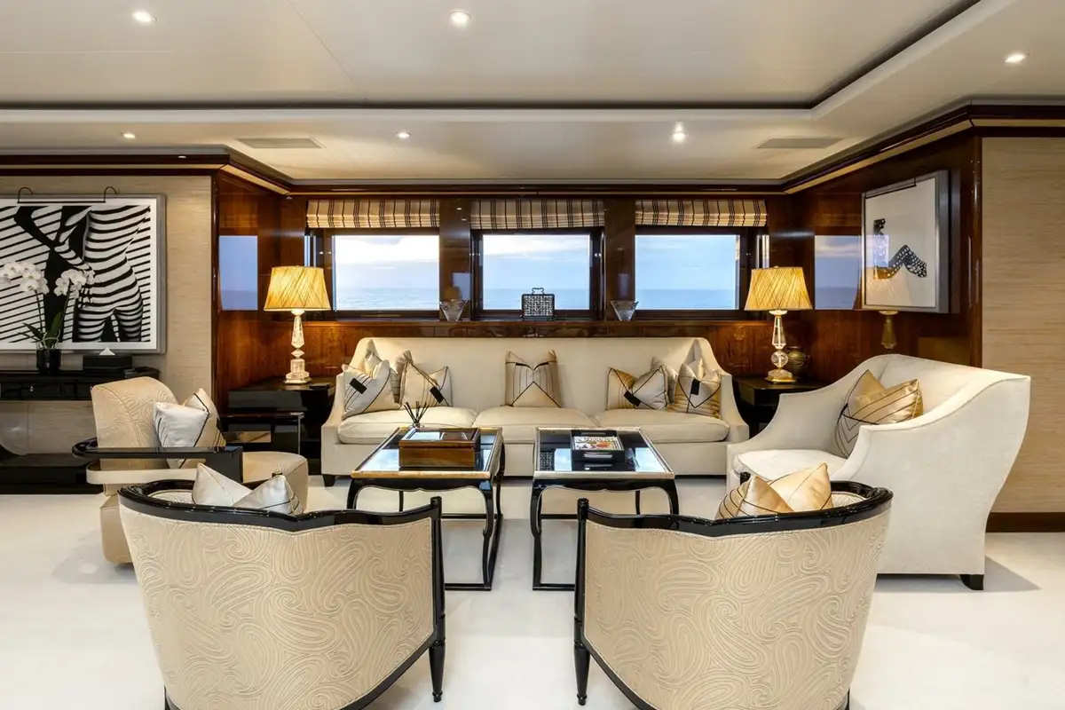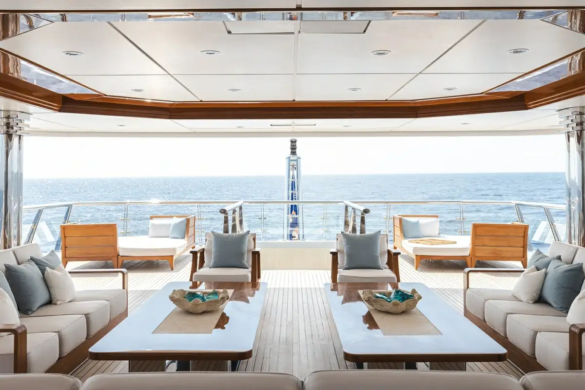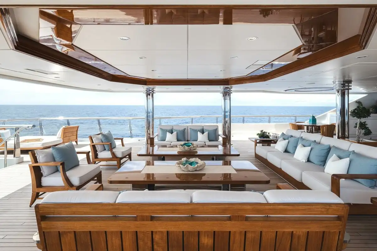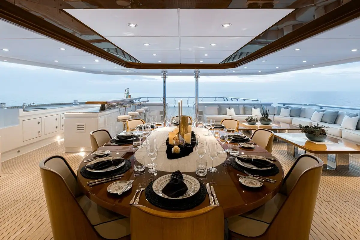 The bridge deck sky lounge has light wood panelling with marquetry and relaxed sofa seating. The upper deck is an entertainment space with convivial lounge seating and a piano in the lounge and a circular dining table for 20 guests with stunning views through a semi-circle of sliding glass doors, opening onto the upper deck aft.