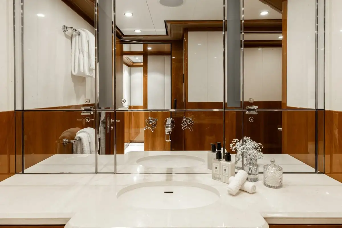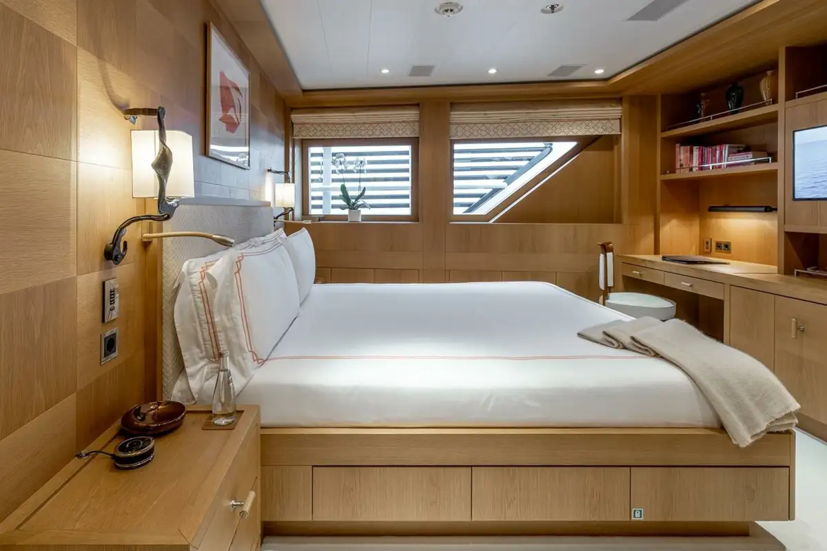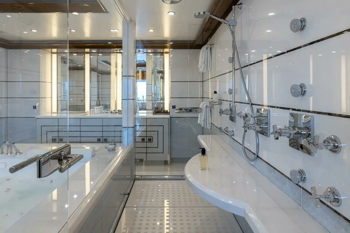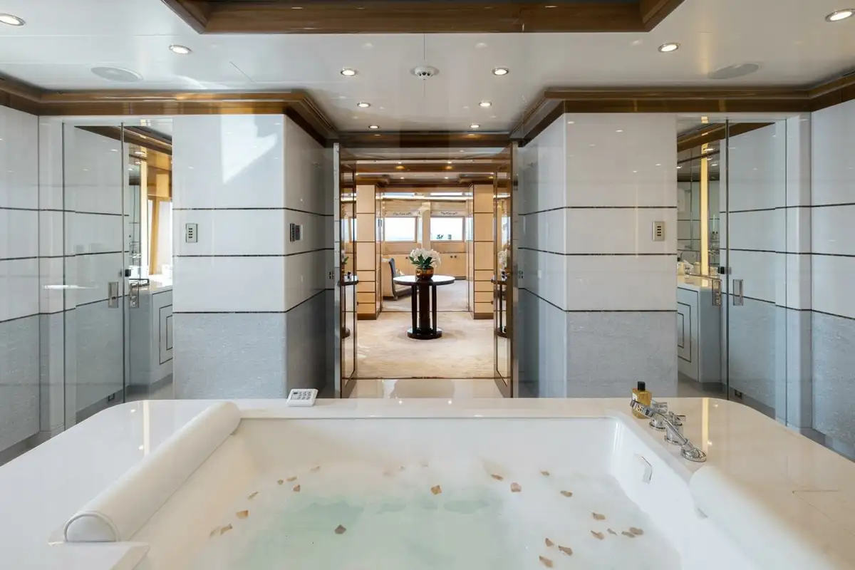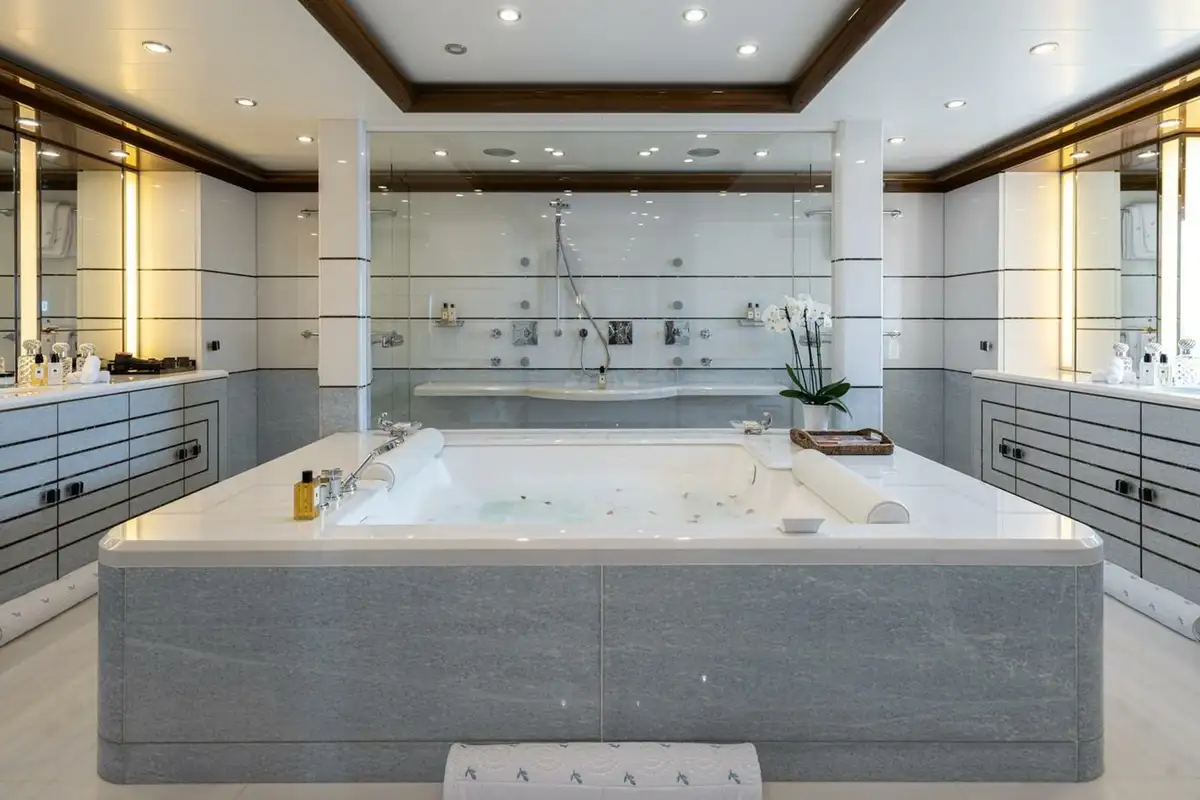 She welcomes up to 18 guests in nine cabins. The owner's cabin takes up almost half of the upper deck's interior. It features a private owner's lounge with office, his-and-hers bathroom around a huge central bath, a very large walk-in wardrobe, a bedroom with access to a Portuguese bridge and a private terrace with two jacuzzis. The main deck has three VIP cabins and two twin cabins, and there are a further two double cabins on the lower deck forward of the lobby, which has its own sea terrace. She also sleeps 24 crew.