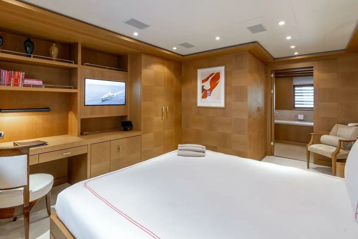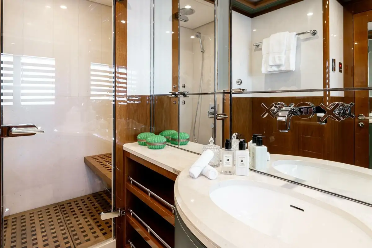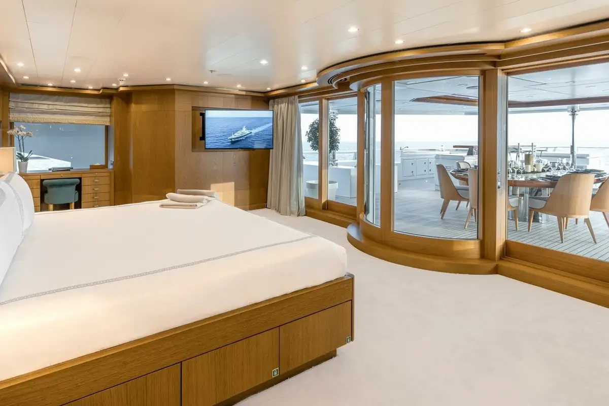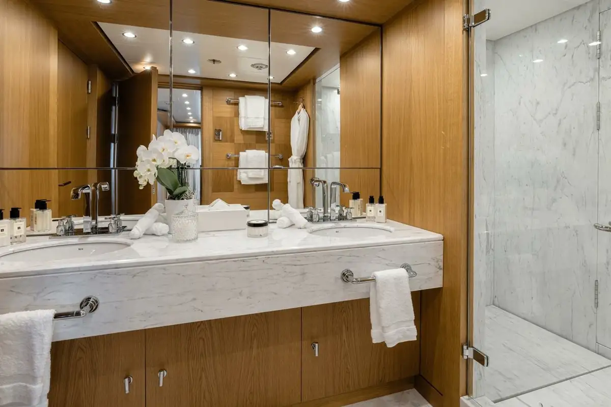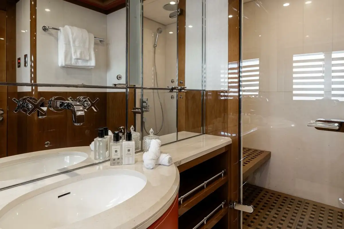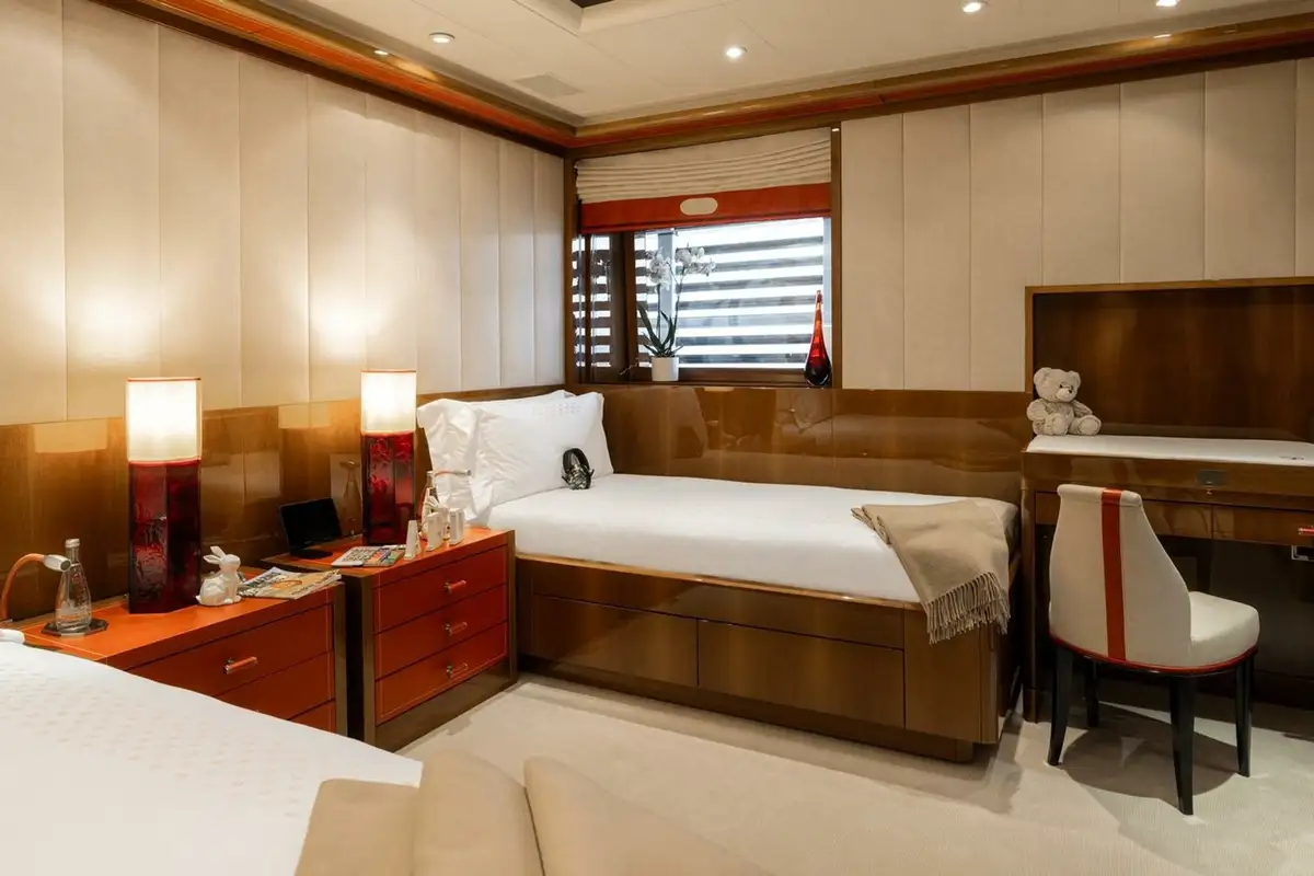 She welcomes up to 18 guests in nine cabins. The owner's cabin takes up almost half of the upper deck's interior. It features a private owner's lounge with office, his-and-hers bathroom around a huge central bath, a very large walk-in wardrobe, a bedroom with access to a Portuguese bridge and a private terrace with two jacuzzis. The main deck has three VIP cabins and two twin cabins, and there are a further two double cabins on the lower deck forward of the lobby, which has its own sea terrace. She also sleeps 24 crew.