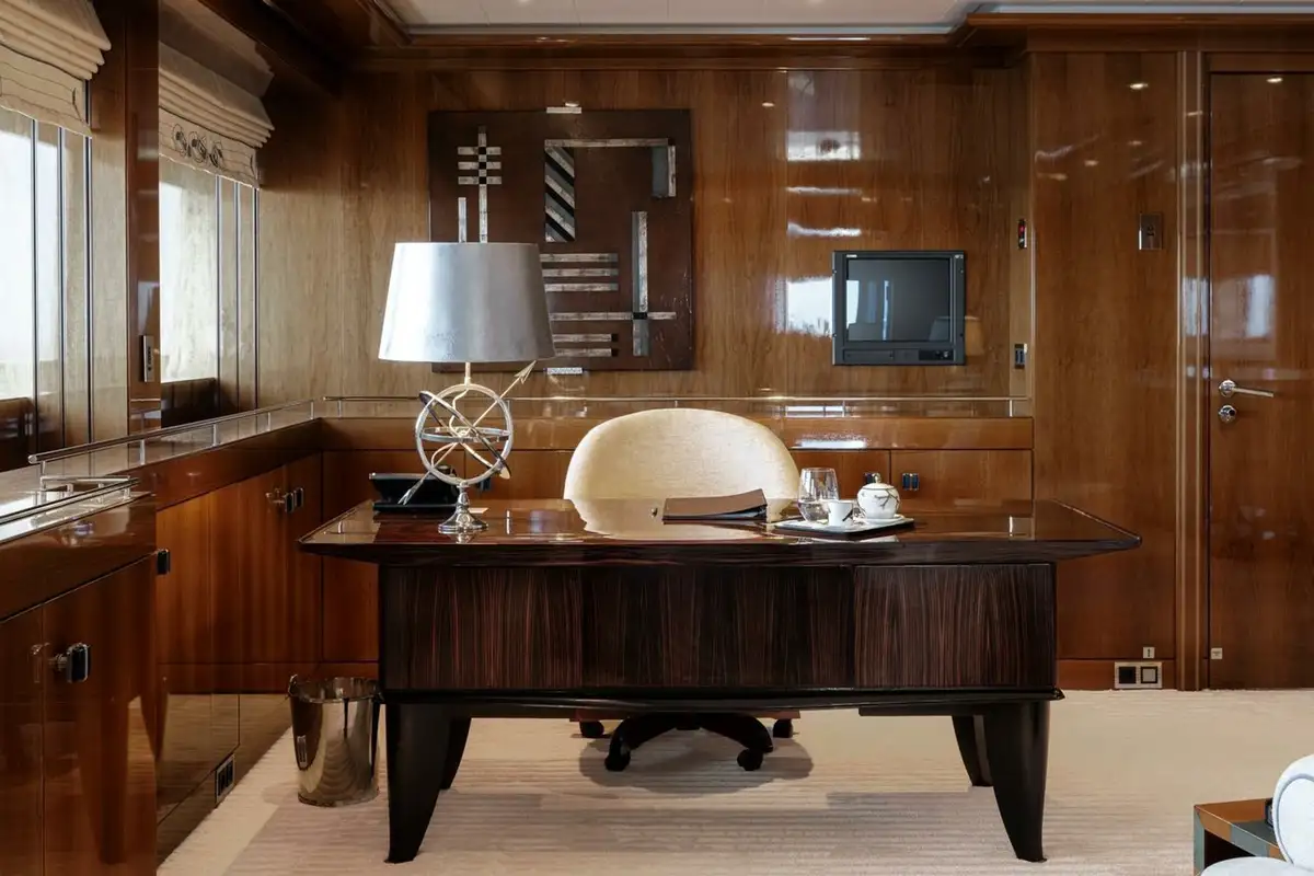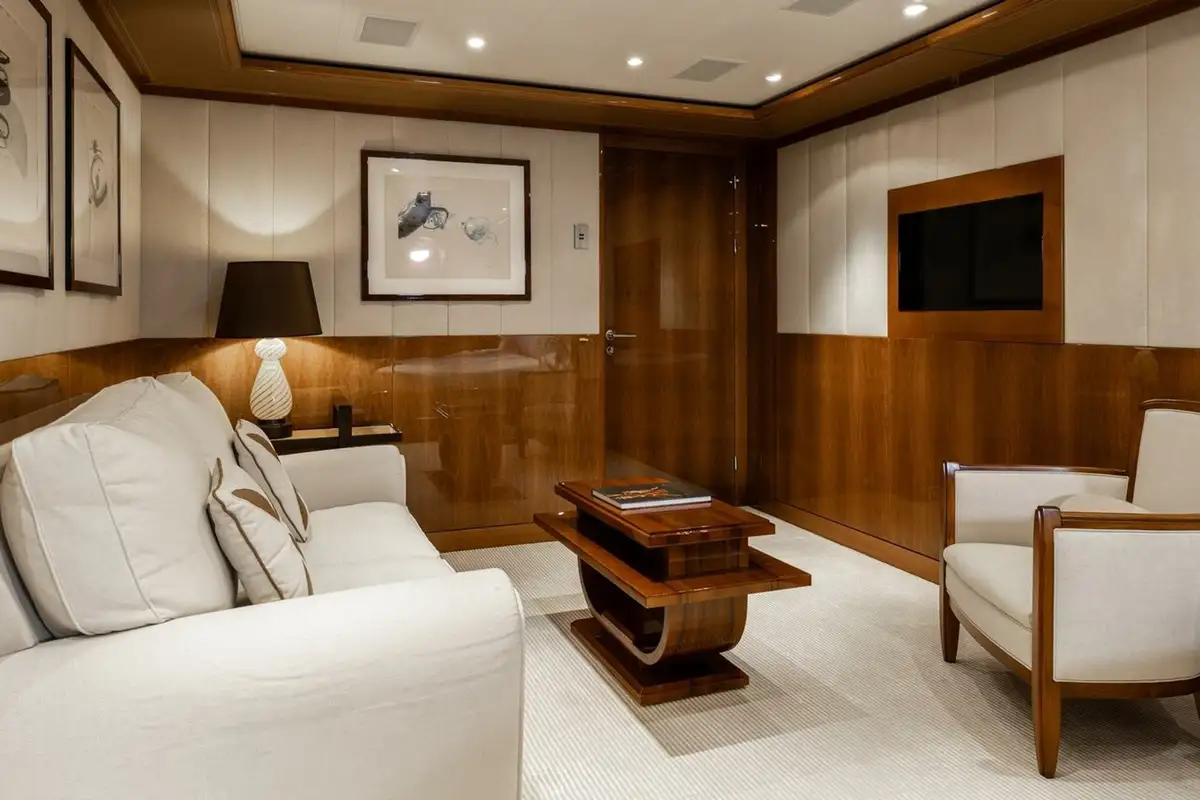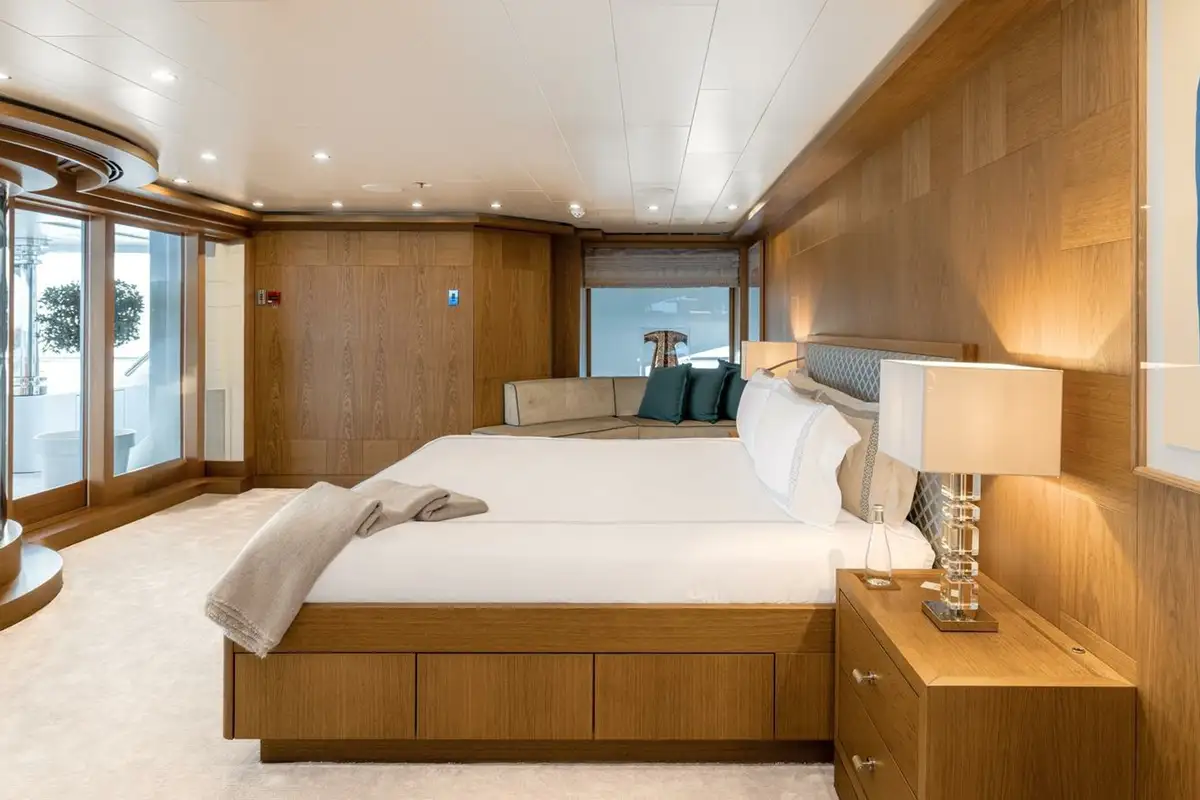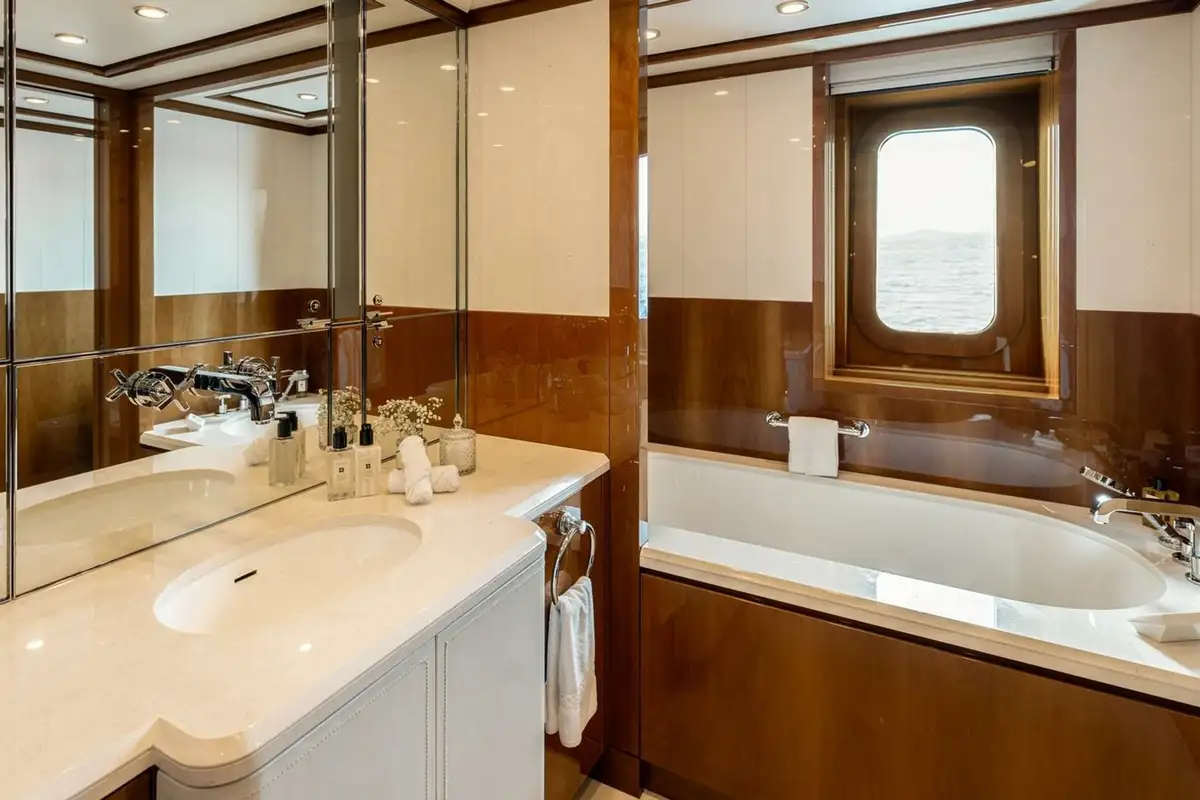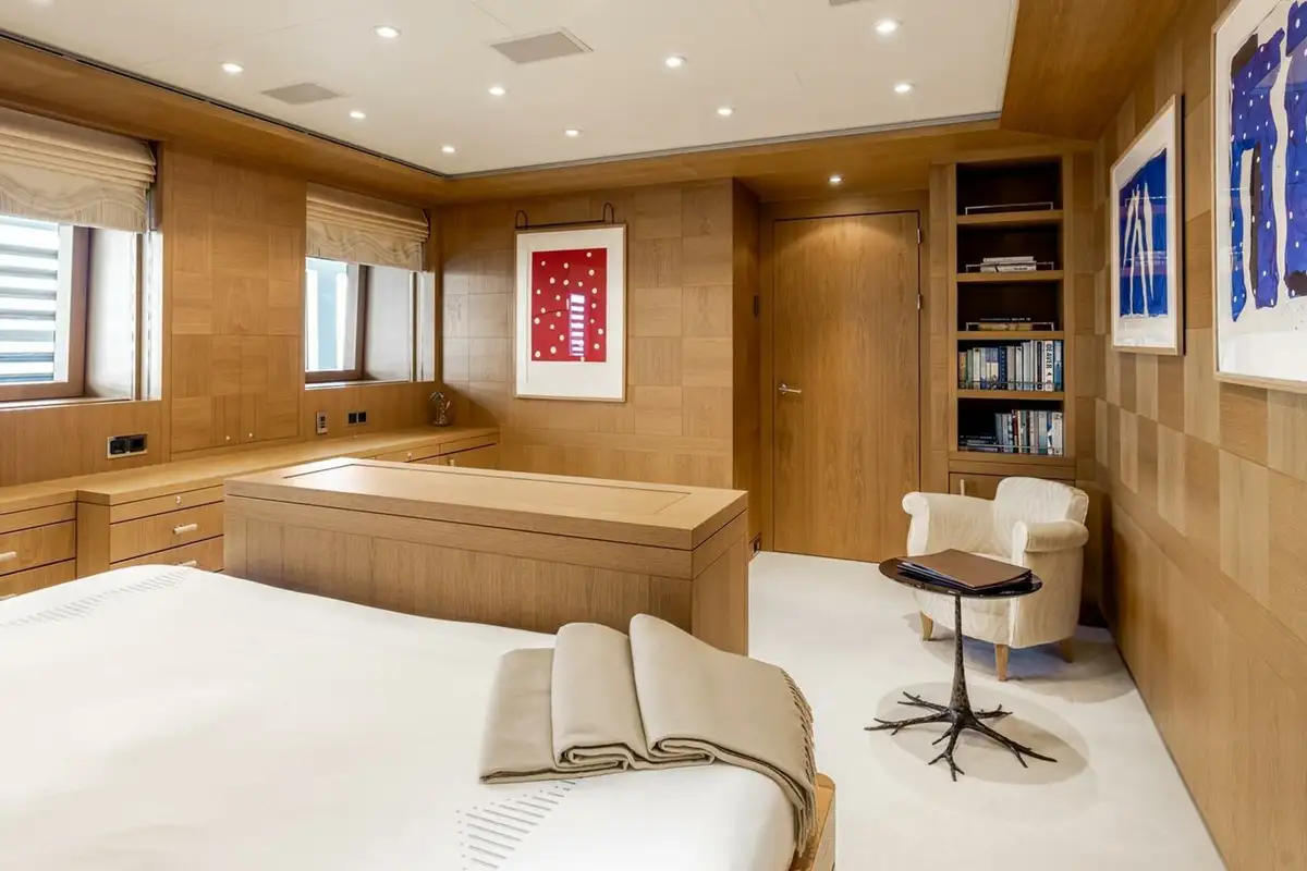 She welcomes up to 18 guests in nine cabins. The owner's cabin takes up almost half of the upper deck's interior. It features a private owner's lounge with office, his-and-hers bathroom around a huge central bath, a very large walk-in wardrobe, a bedroom with access to a Portuguese bridge and a private terrace with two jacuzzis. The main deck has three VIP cabins and two twin cabins, and there are a further two double cabins on the lower deck forward of the lobby, which has its own sea terrace. She also sleeps 24 crew.